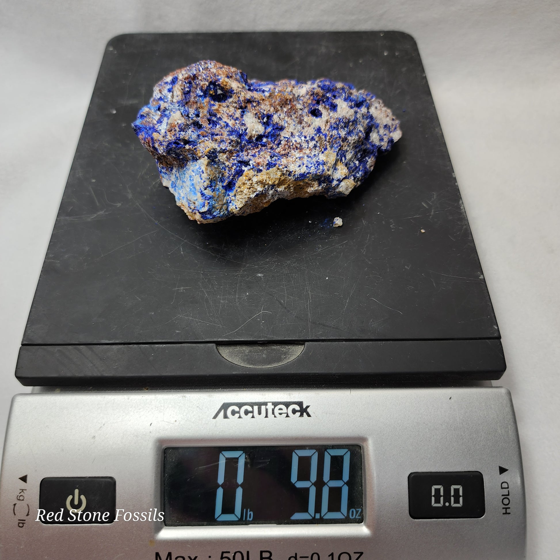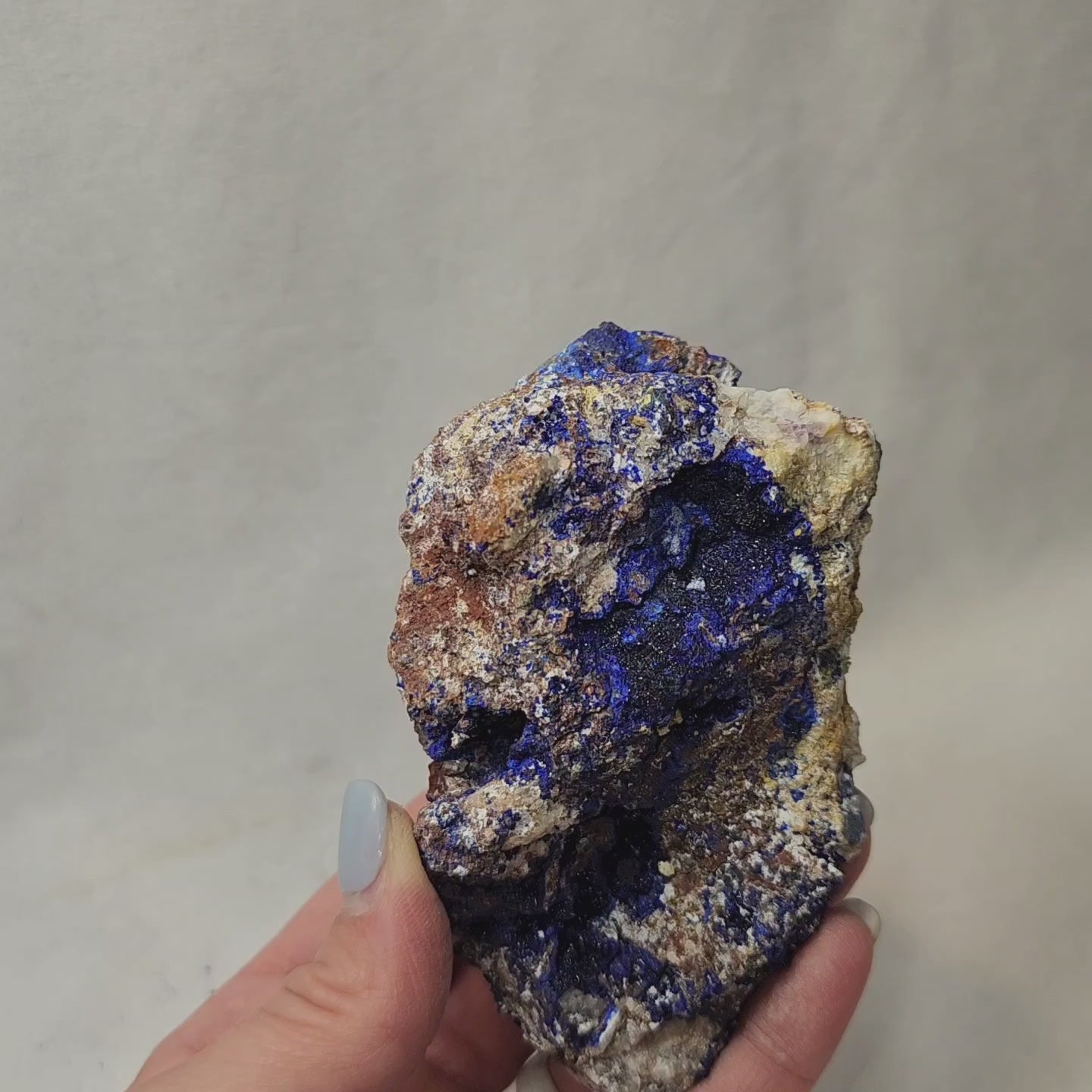The beautiful blue all over this specimen is Azurite. Azurite is a copper carbonate mineral that is known for its blue color.