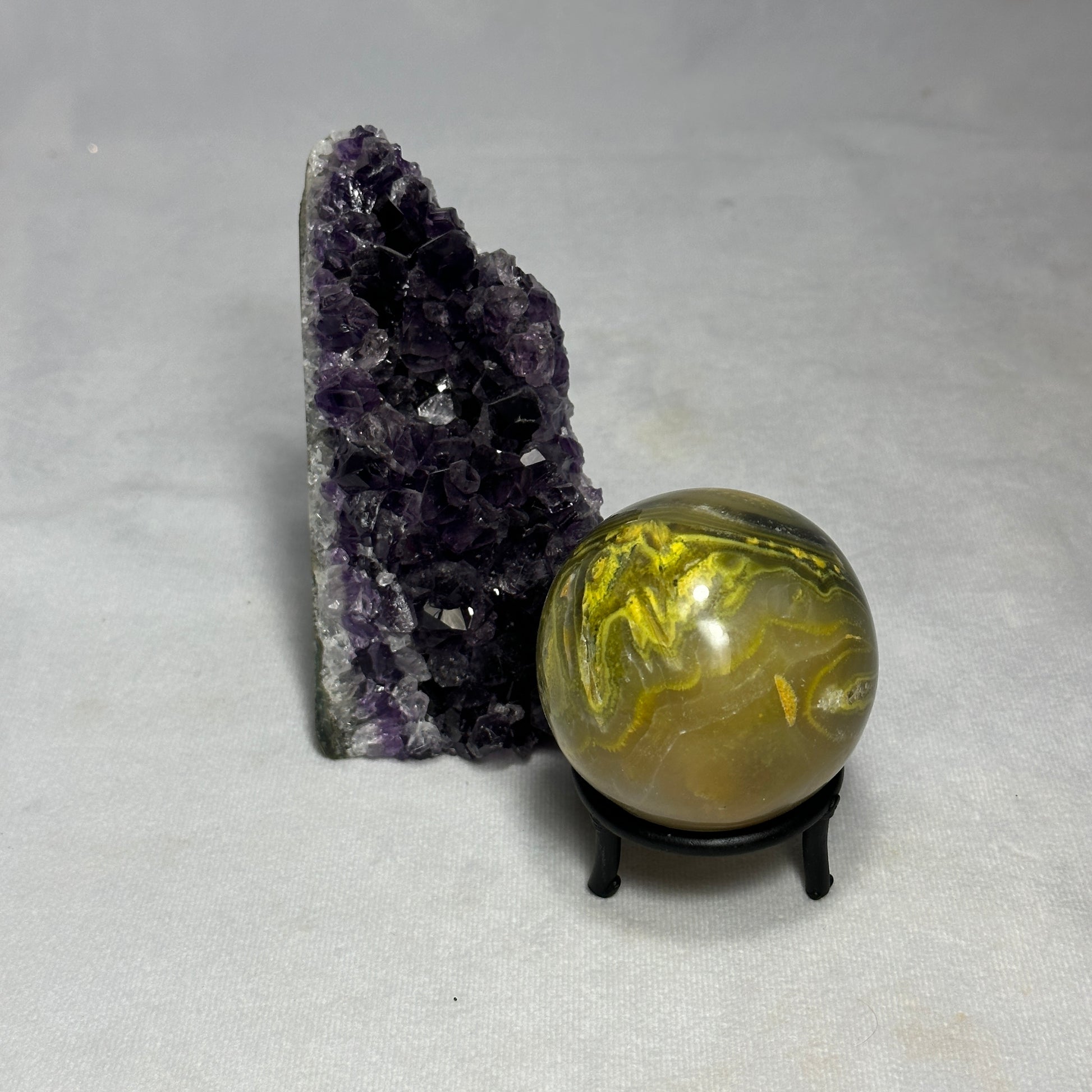 This specific specimen has gorgeous smokey yellow areas and bright yellow swirls! Our Amethysts adds a fantastic contrast on display!