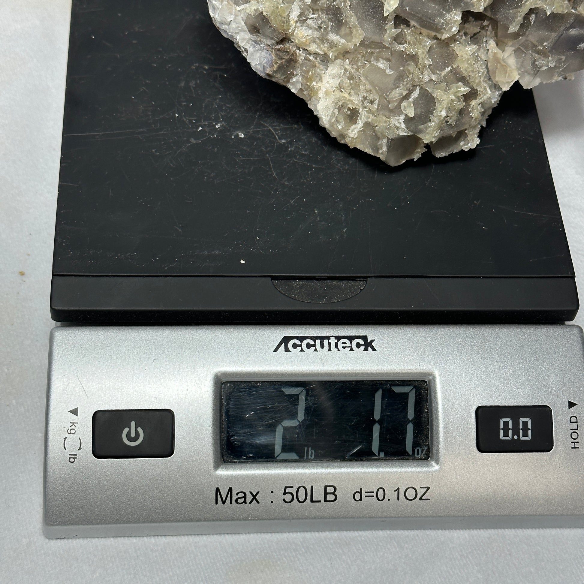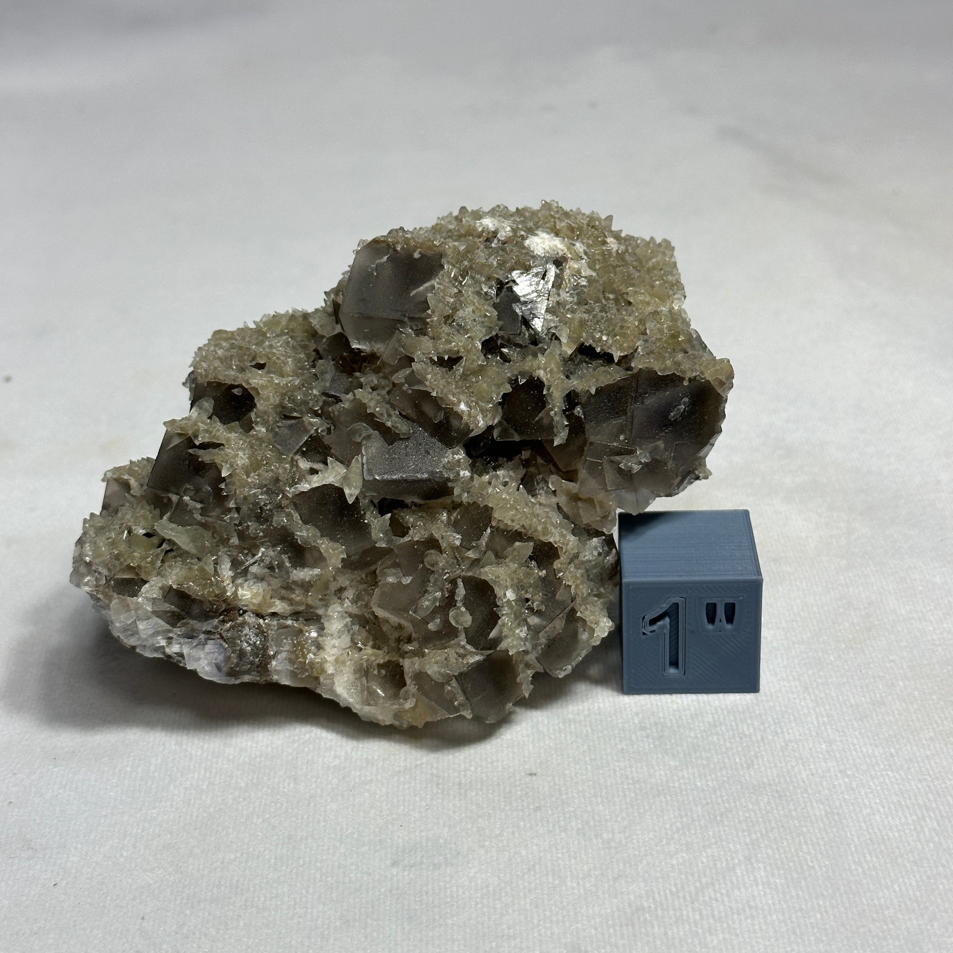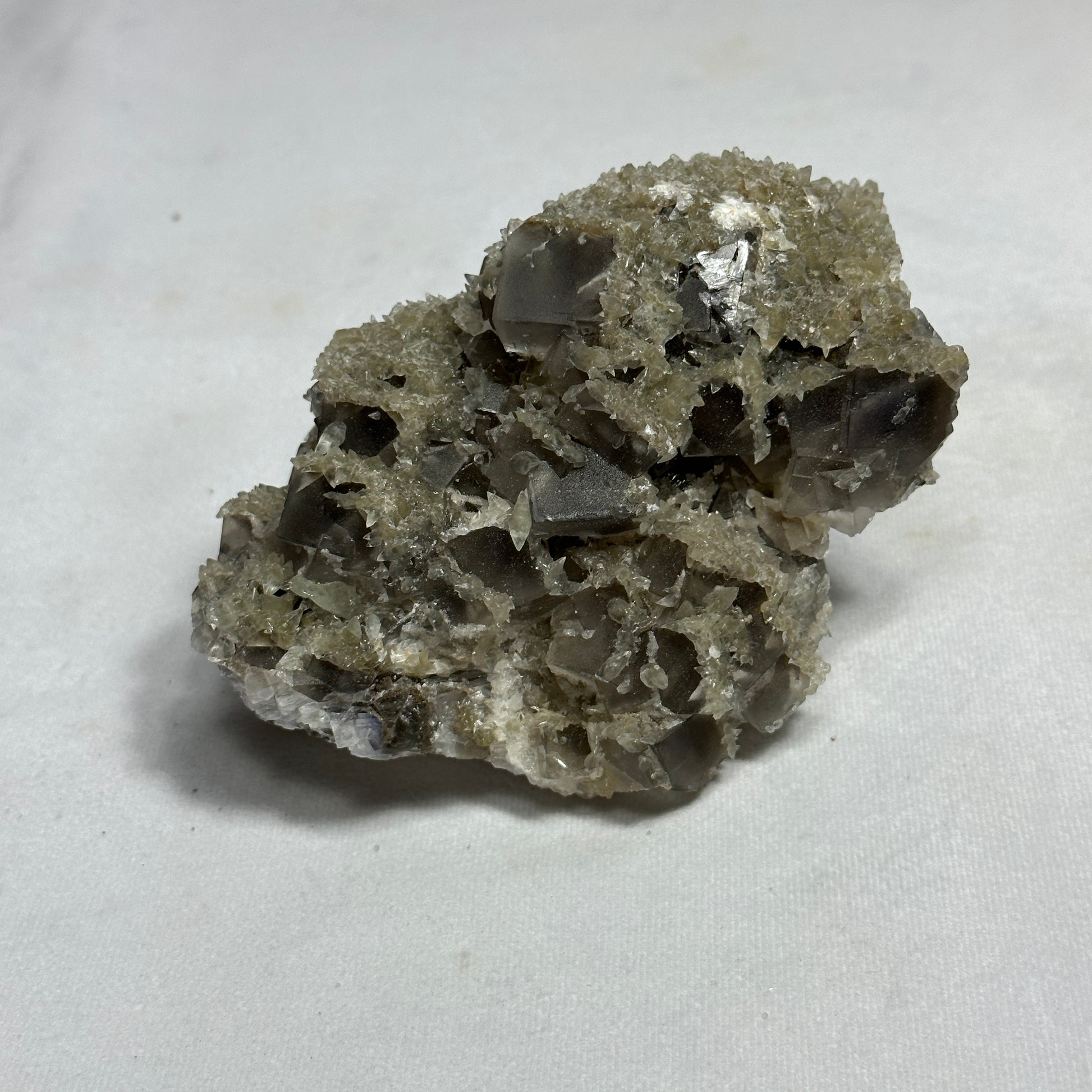 This Fluorite specimen is remarkable! It has many gray cubed layers as well as small Dogtooth Calcite around it!