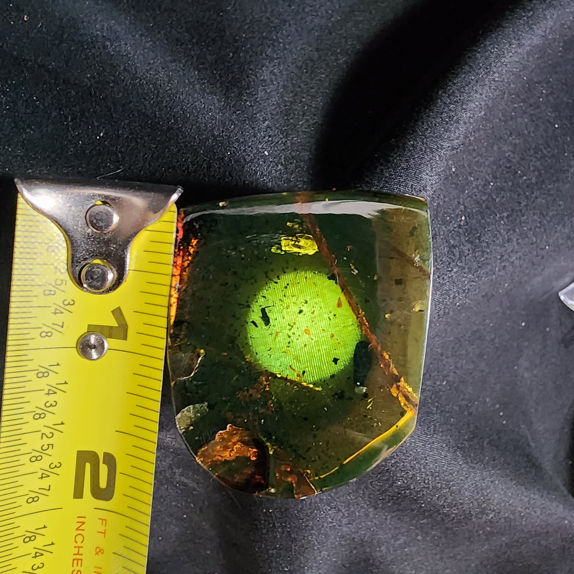 This is a polished piece of Amber that shows several twigs and leaves in it! Put this specimen in front of a light to see all of these detailed inclusions. Grab a blacklight for an extra special glow!