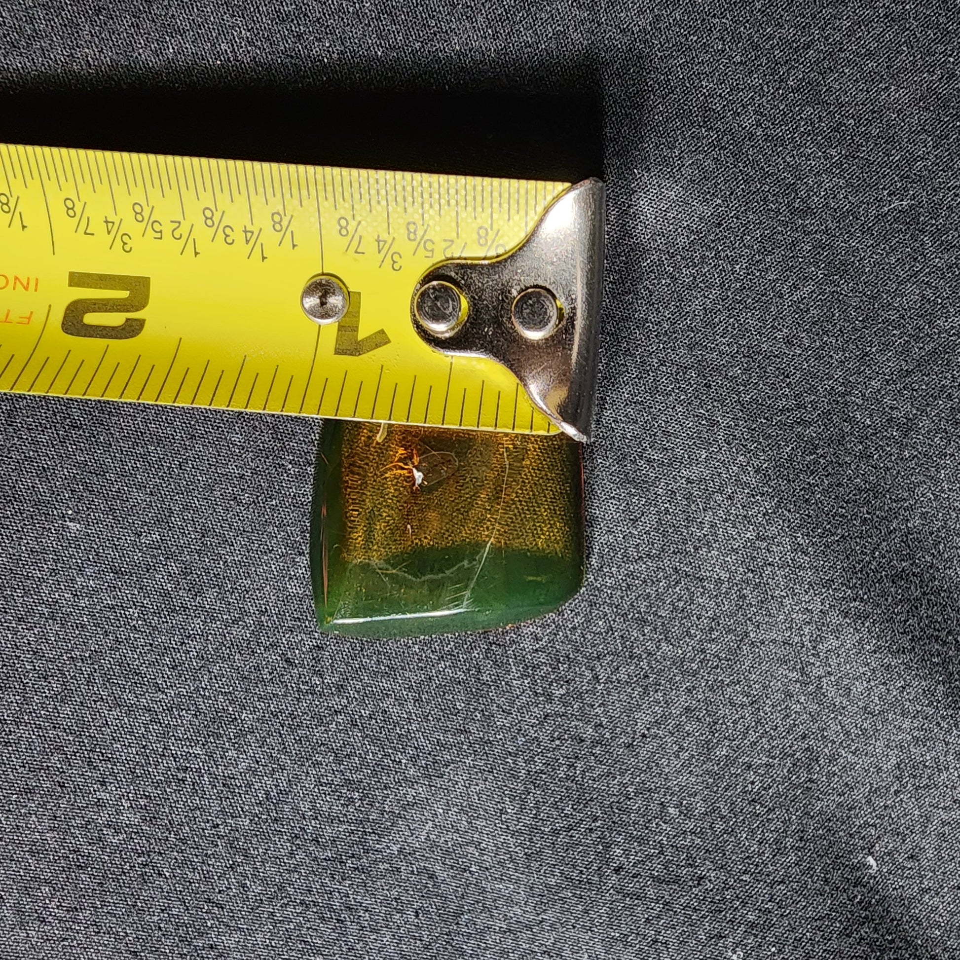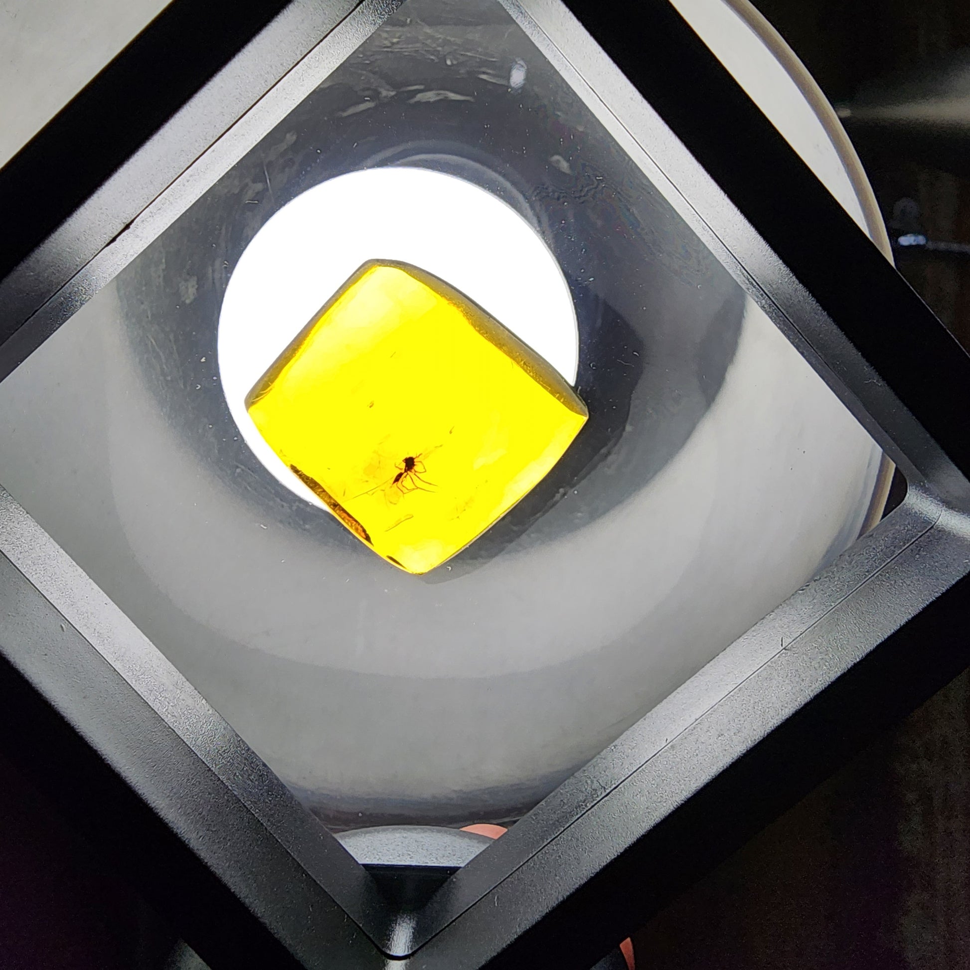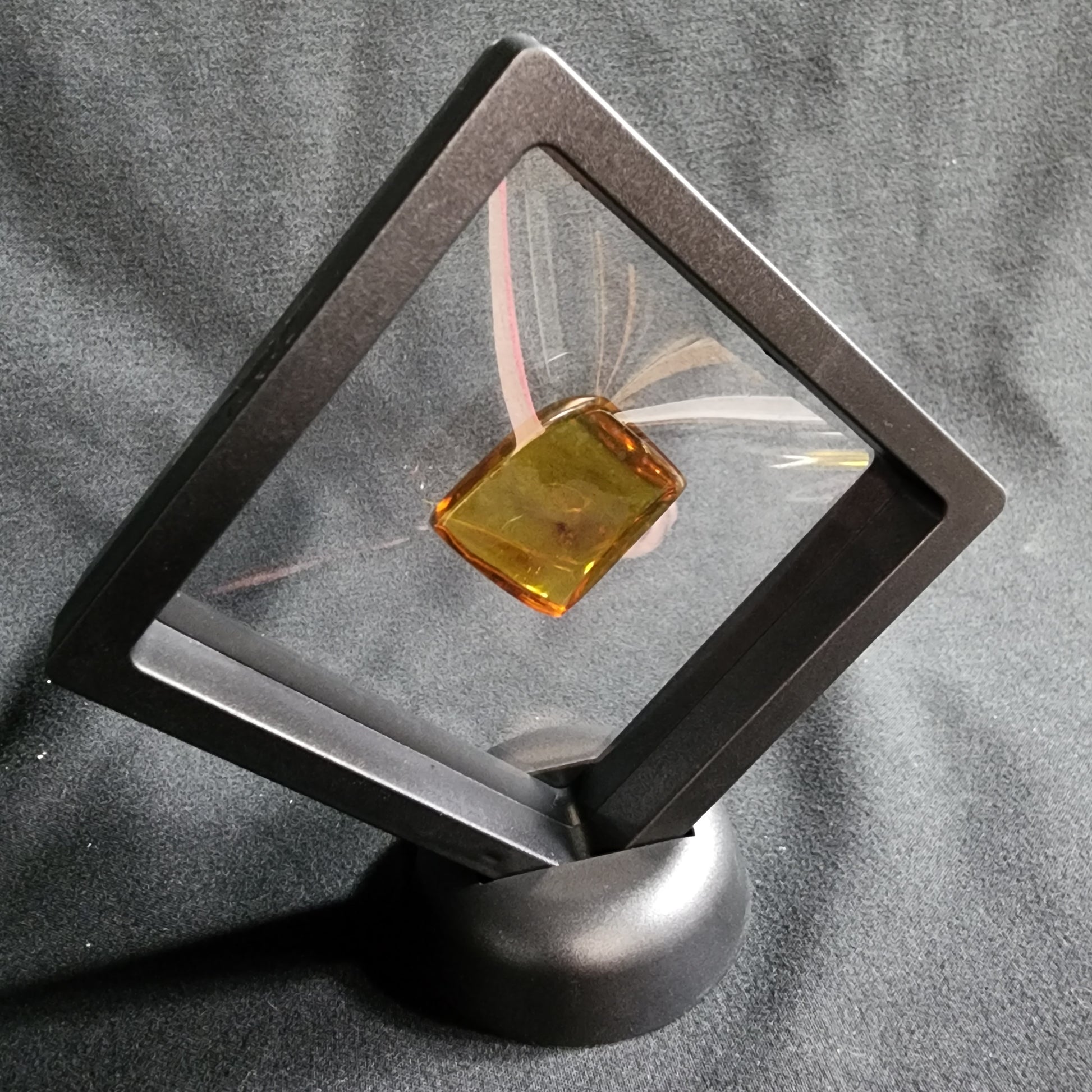 This is a polished piece of Amber that shows a tiny spider inside! You can see it clearly in front of any light.