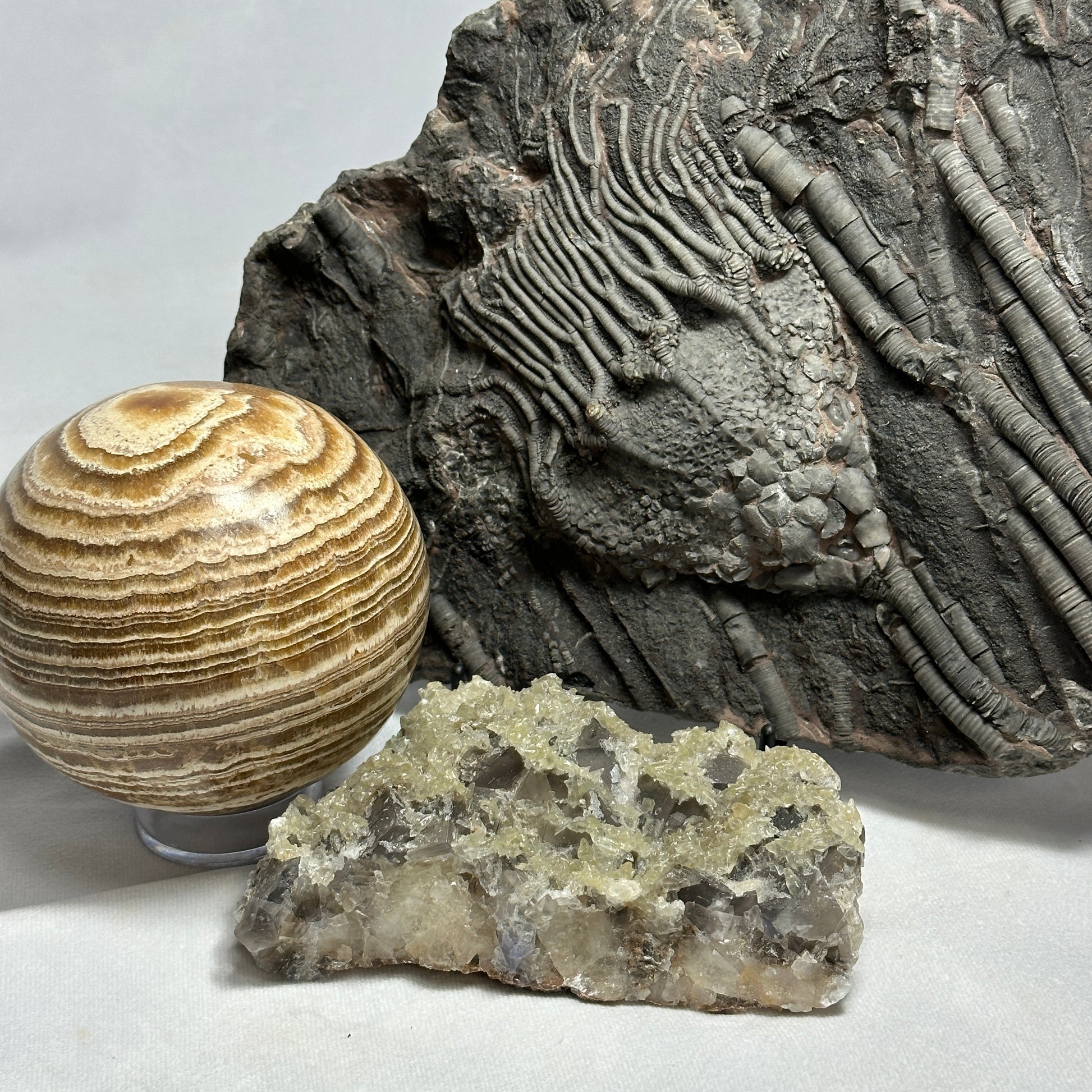 This piece pairs great with our Aragonite Sphere and Crinoid Plate for a beautiful display in any room!