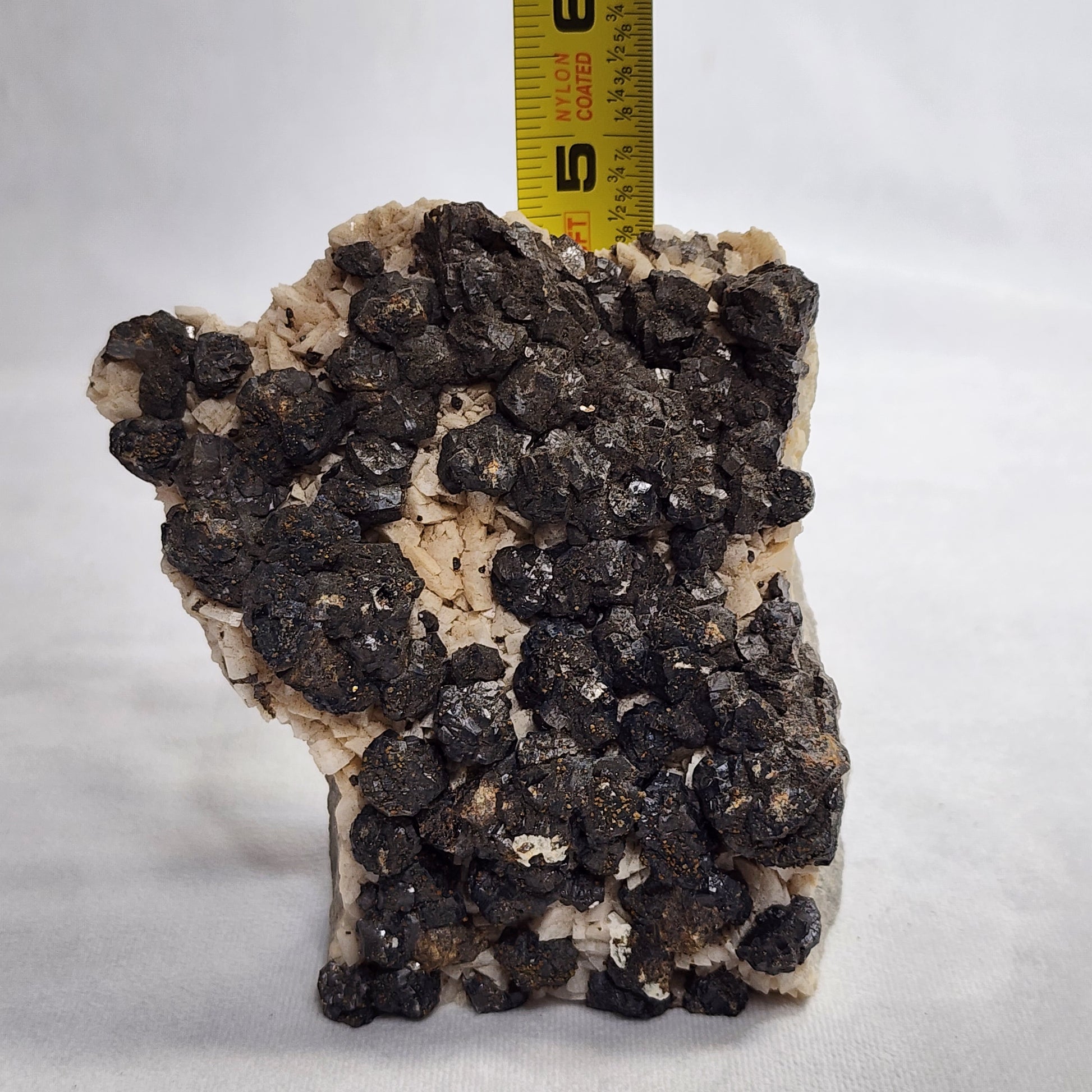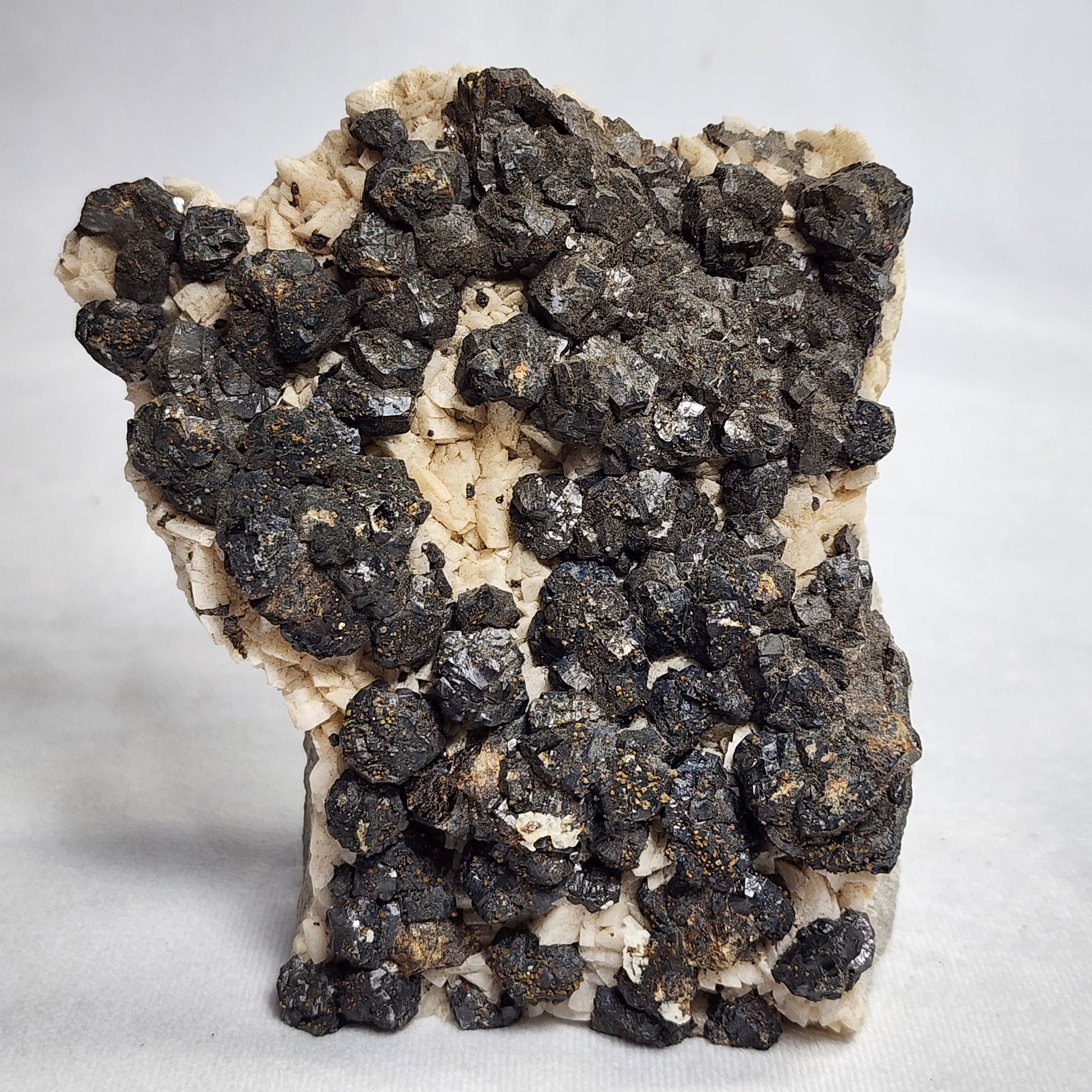 Galena is an ore mineral of lead. On this piece the black, ore nodules of Galena just gleam when under the light!