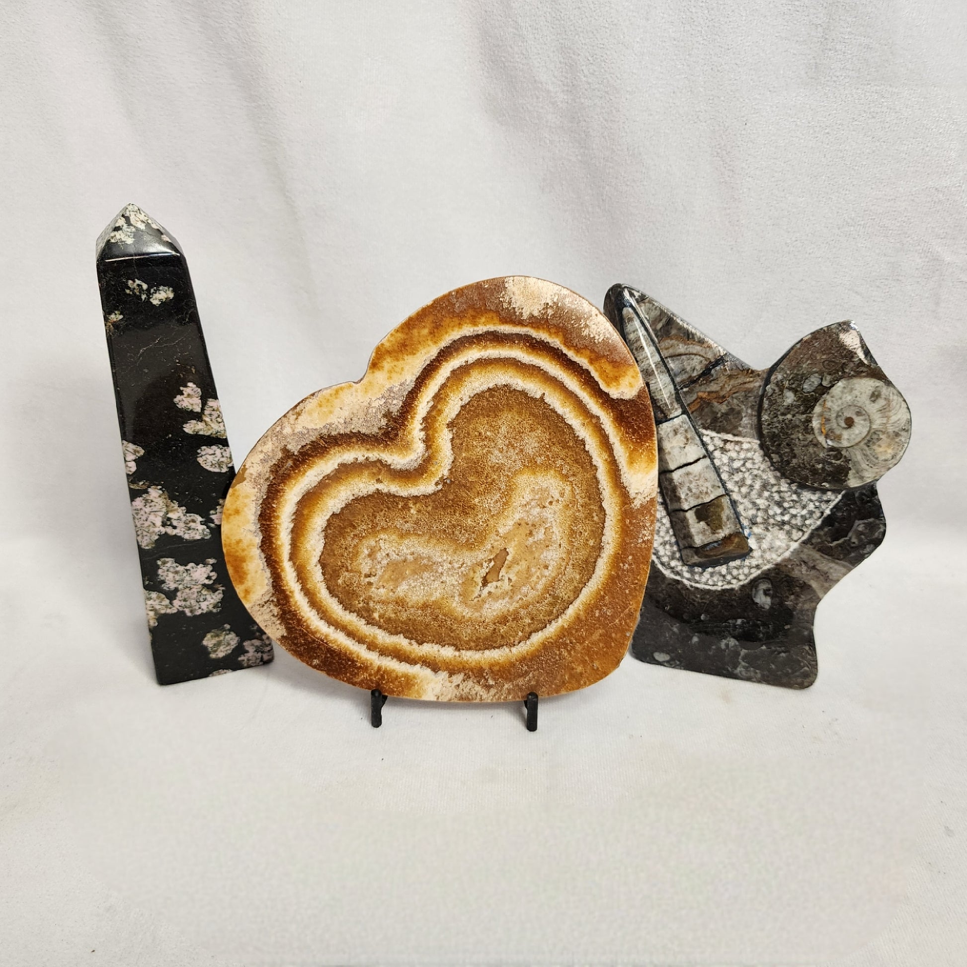 Aragonite plates pair nicely with our Obsidian Towers or Orthoceras Stands, but they also look great as a décor piece alone!