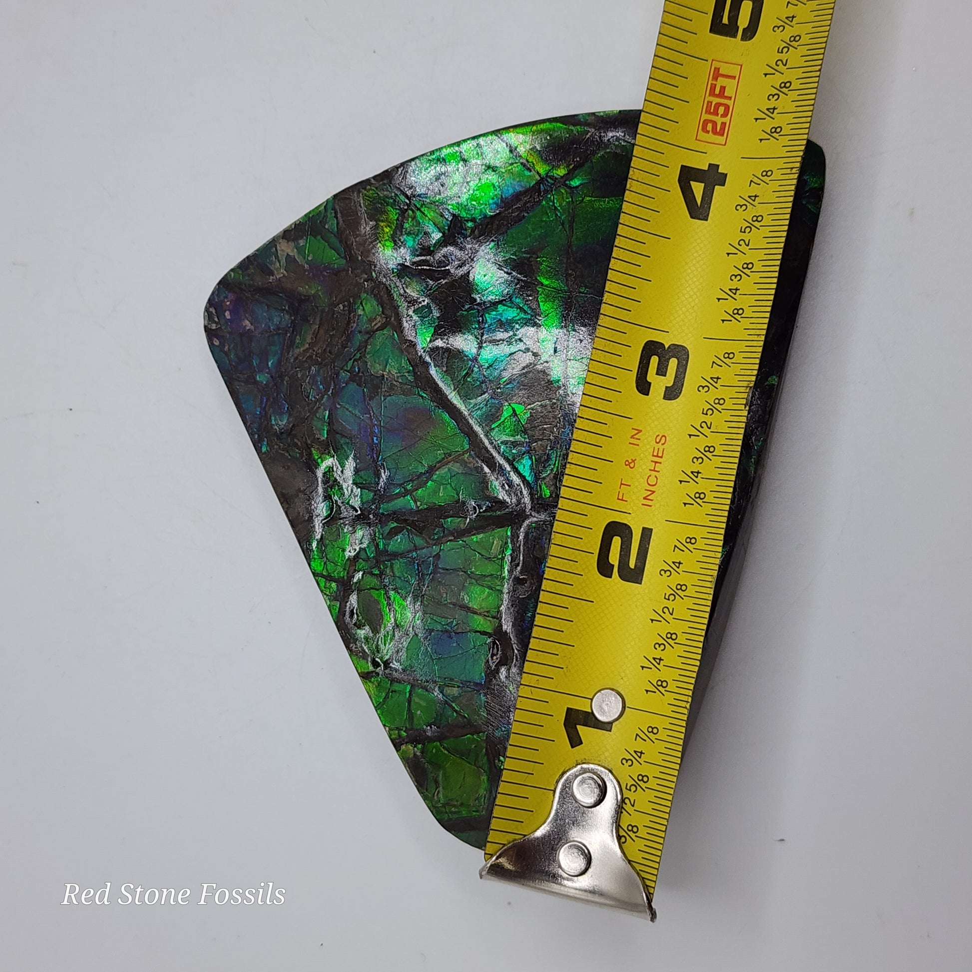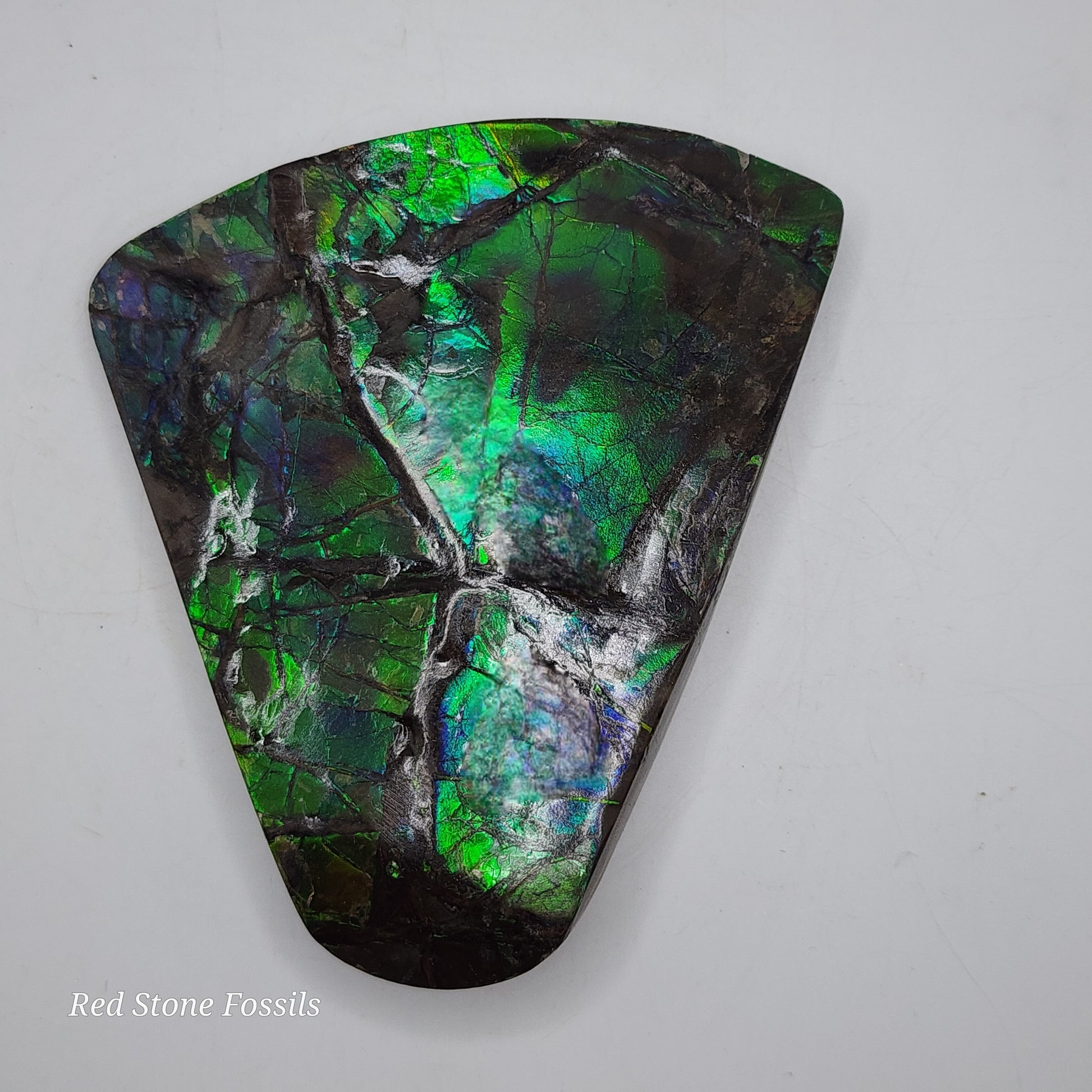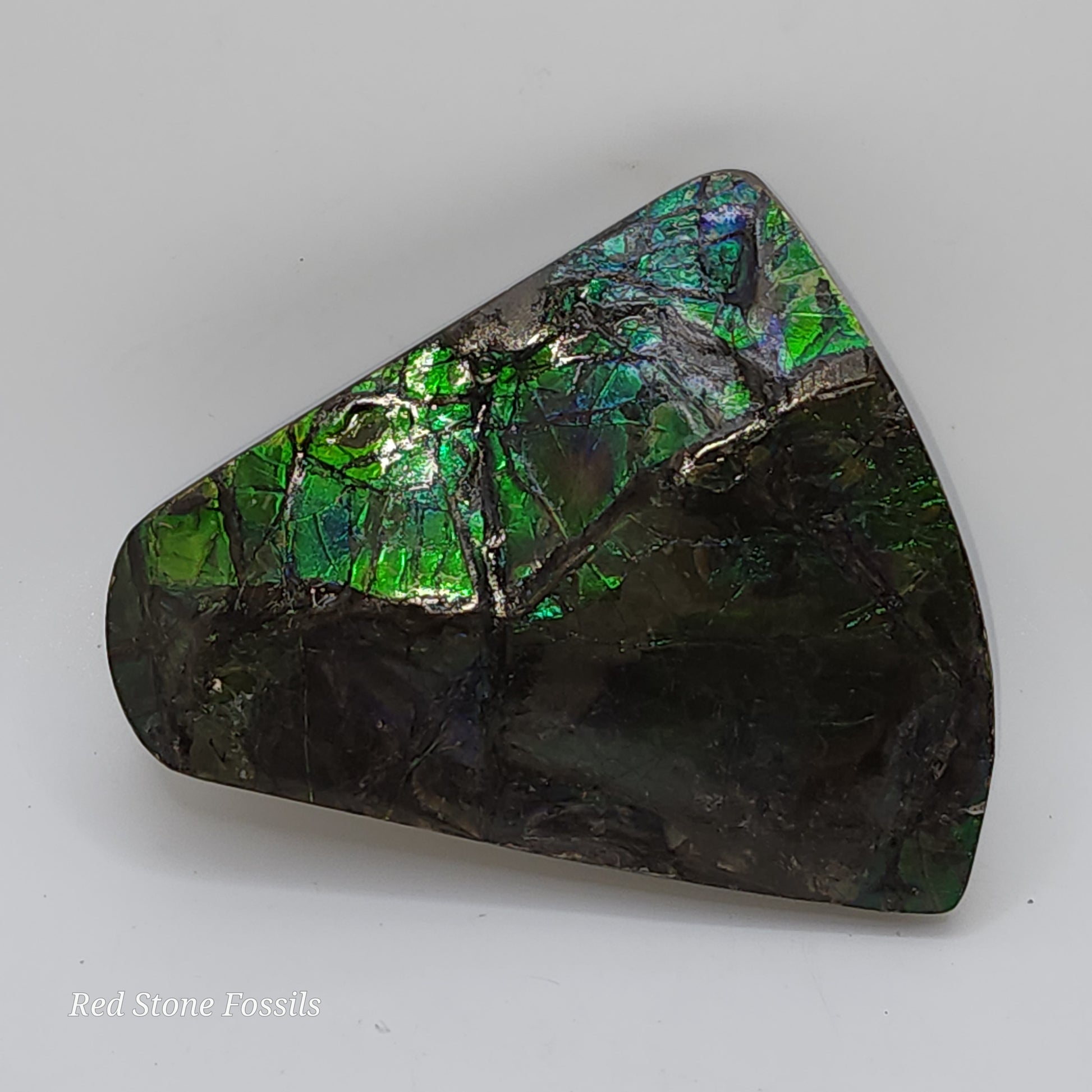 Ammolite is a rare opal-like gemstone made from fossilized ammonite shells. The colorful "flash" can range from red, orange, green, blue or a combination therein.