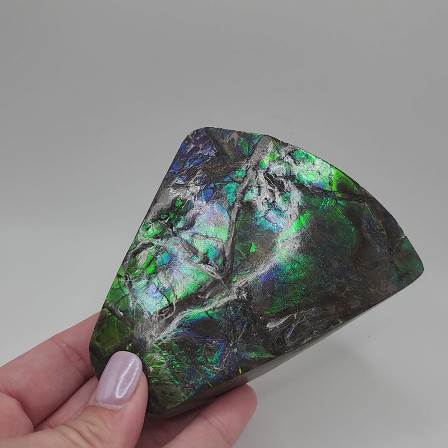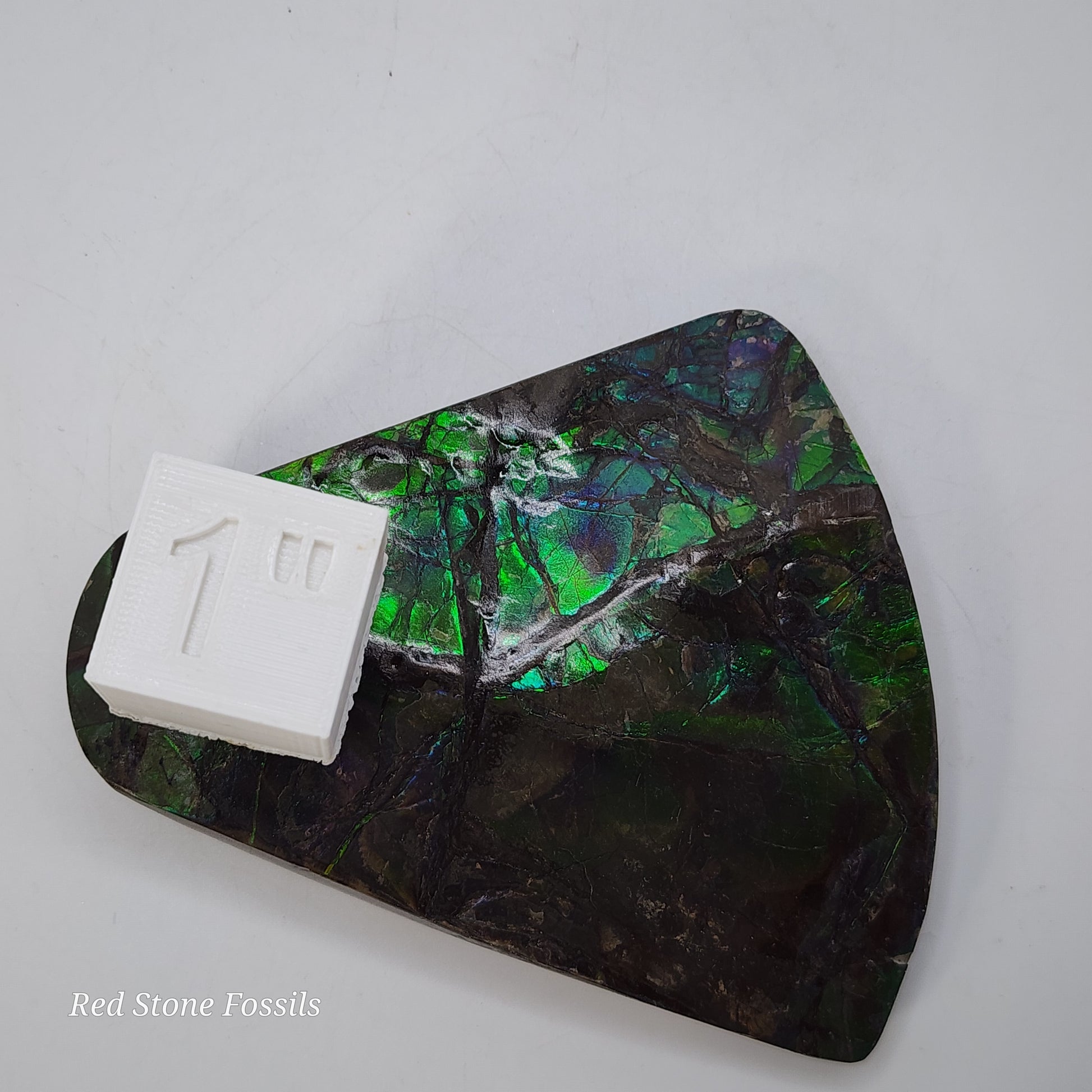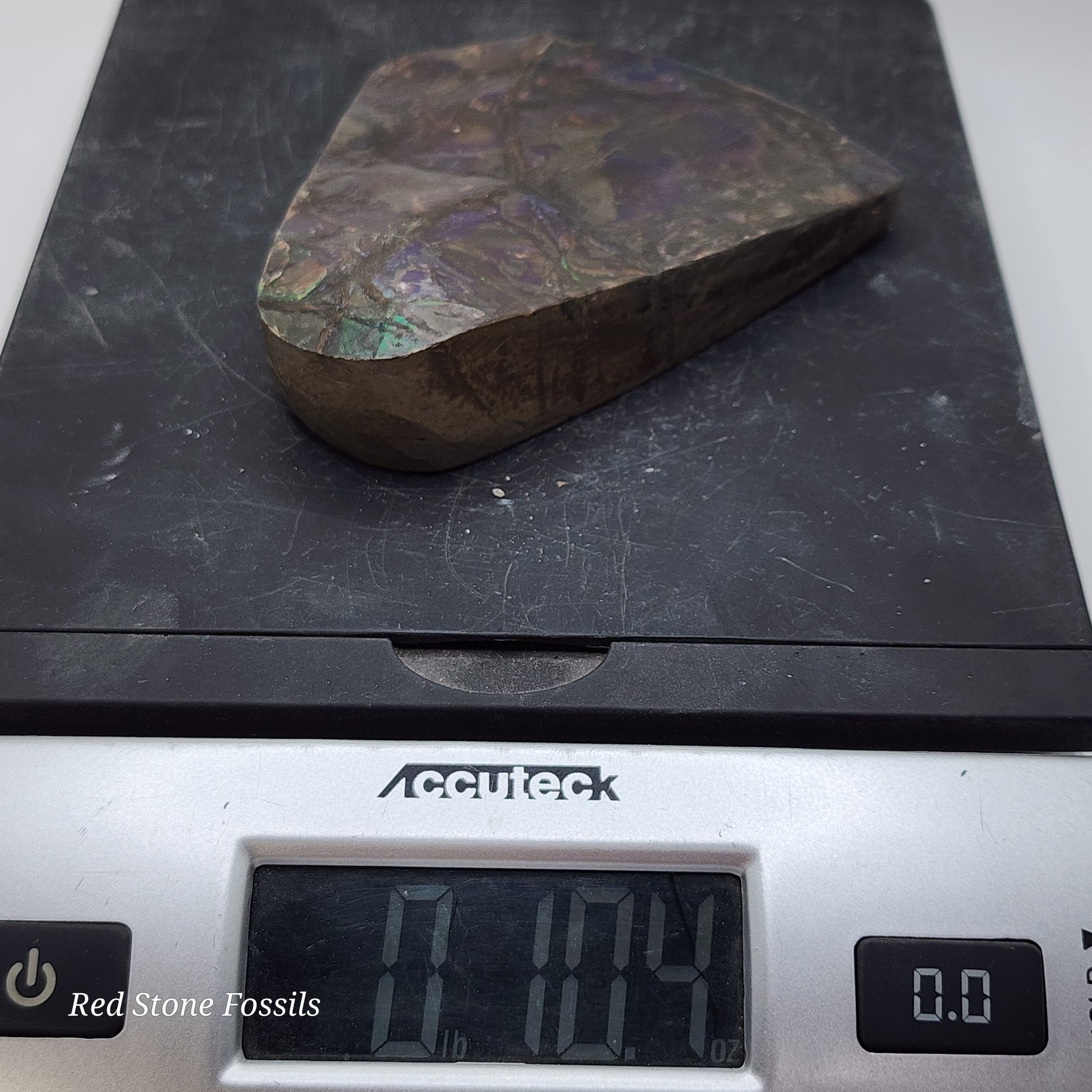 Ammolite is a rare opal-like gemstone made from fossilized ammonite shells. The colorful "flash" can range from red, orange, green, blue or a combination therein.
