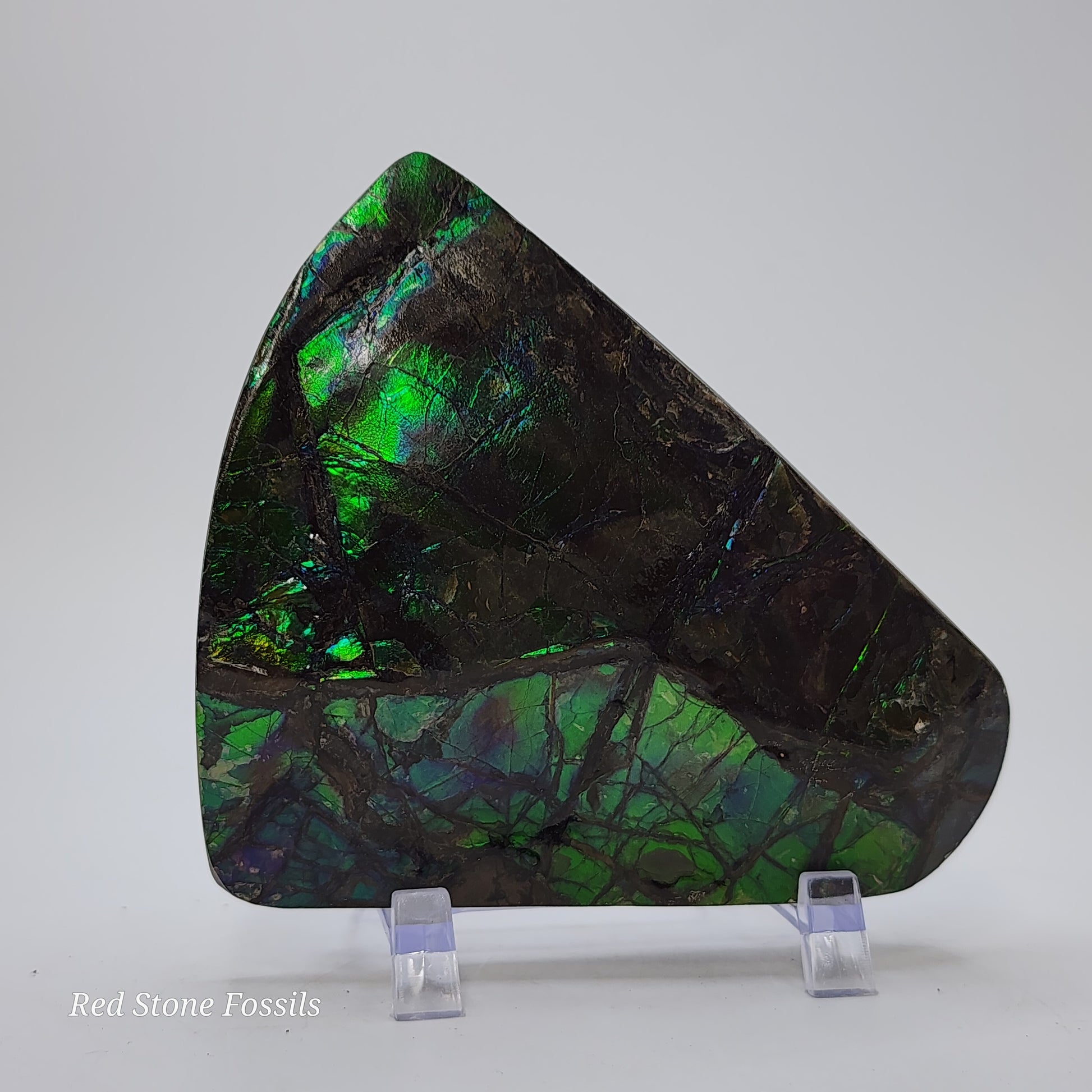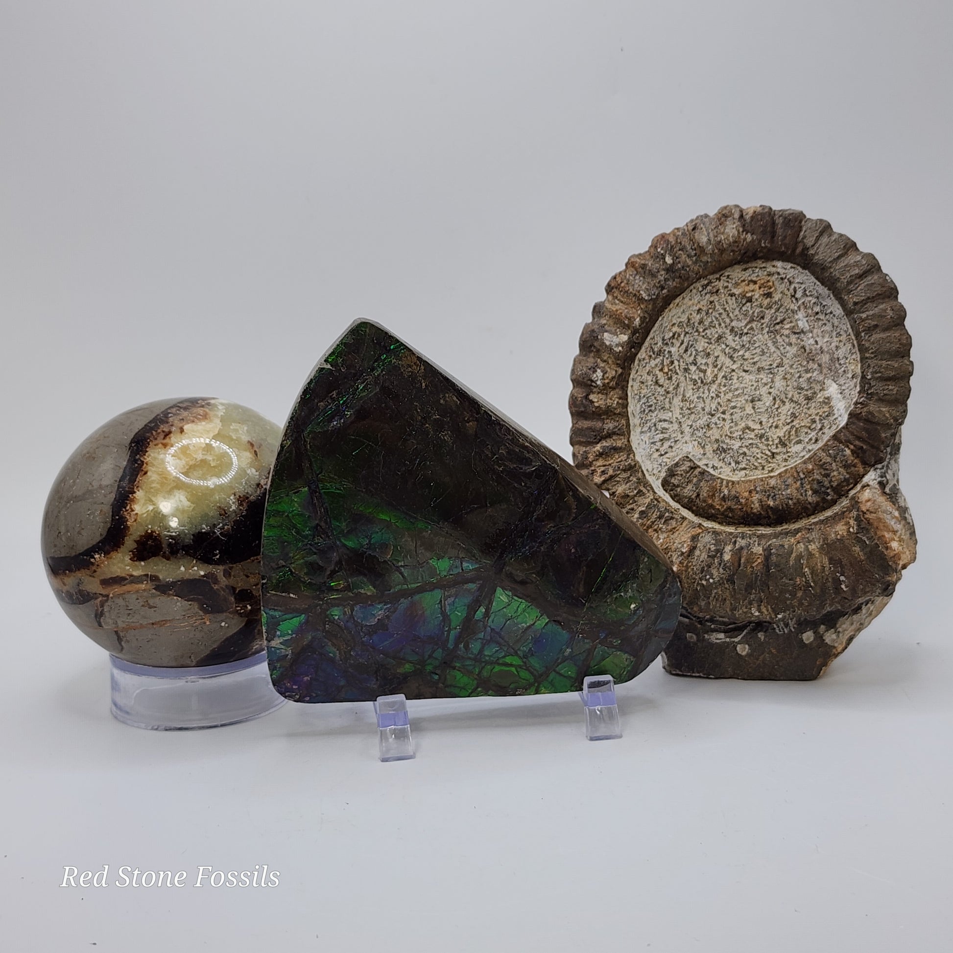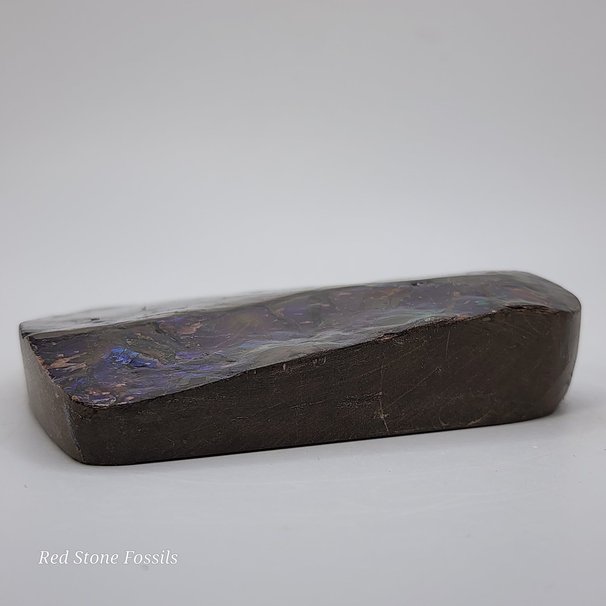 This particular piece has gorgeous blue/green flash and is absolutely stunning! The size is perfect for display on the mantel! Display with our Heteromorph Ammonite and Septarian Sphere for a spectacular fossil arrangement!