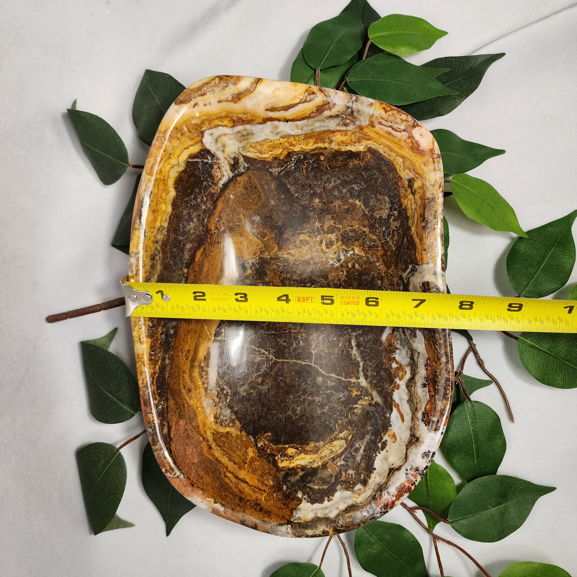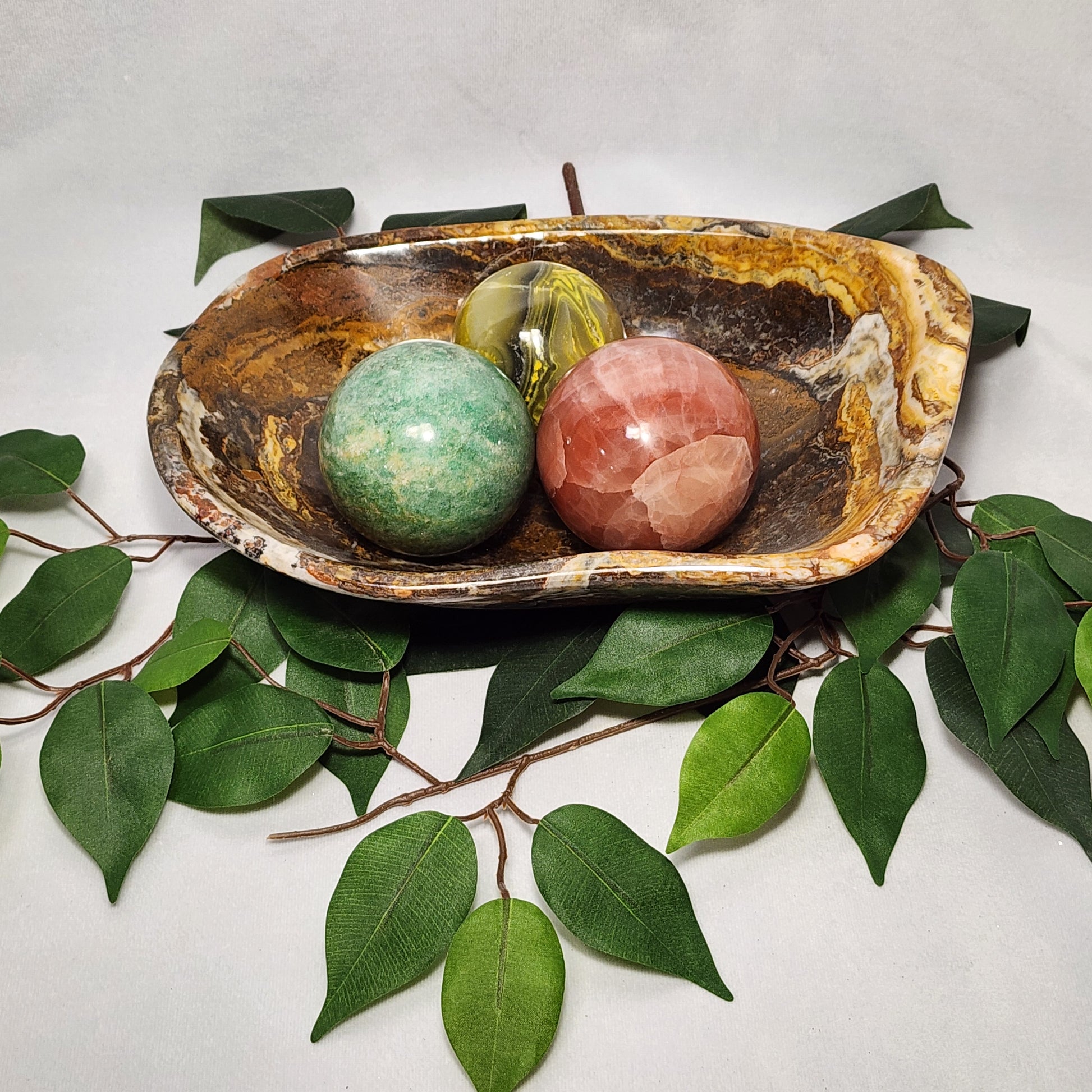 This particular piece has beautiful dark brown and tan coloring with curved corners on the bowl. Pair with our Calcite Spheres or Bumblebee Jasper Spheres for a beautiful piece of table décor!