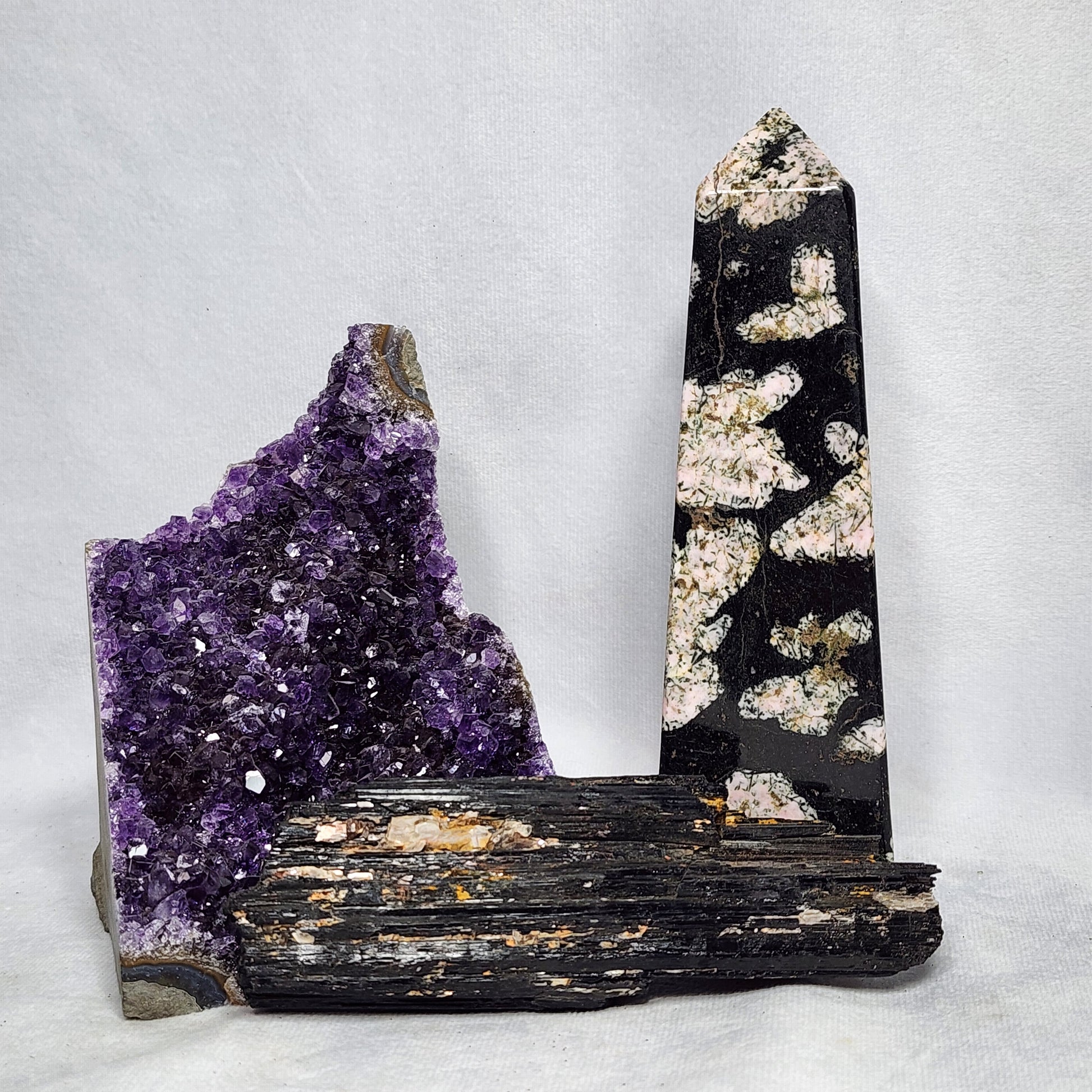 This particular raw specimen is just gorgeous with its shimmery crystals and jet black color! Black Tourmaline looks fascinating next to our Amethyst or Obsidian Towers!