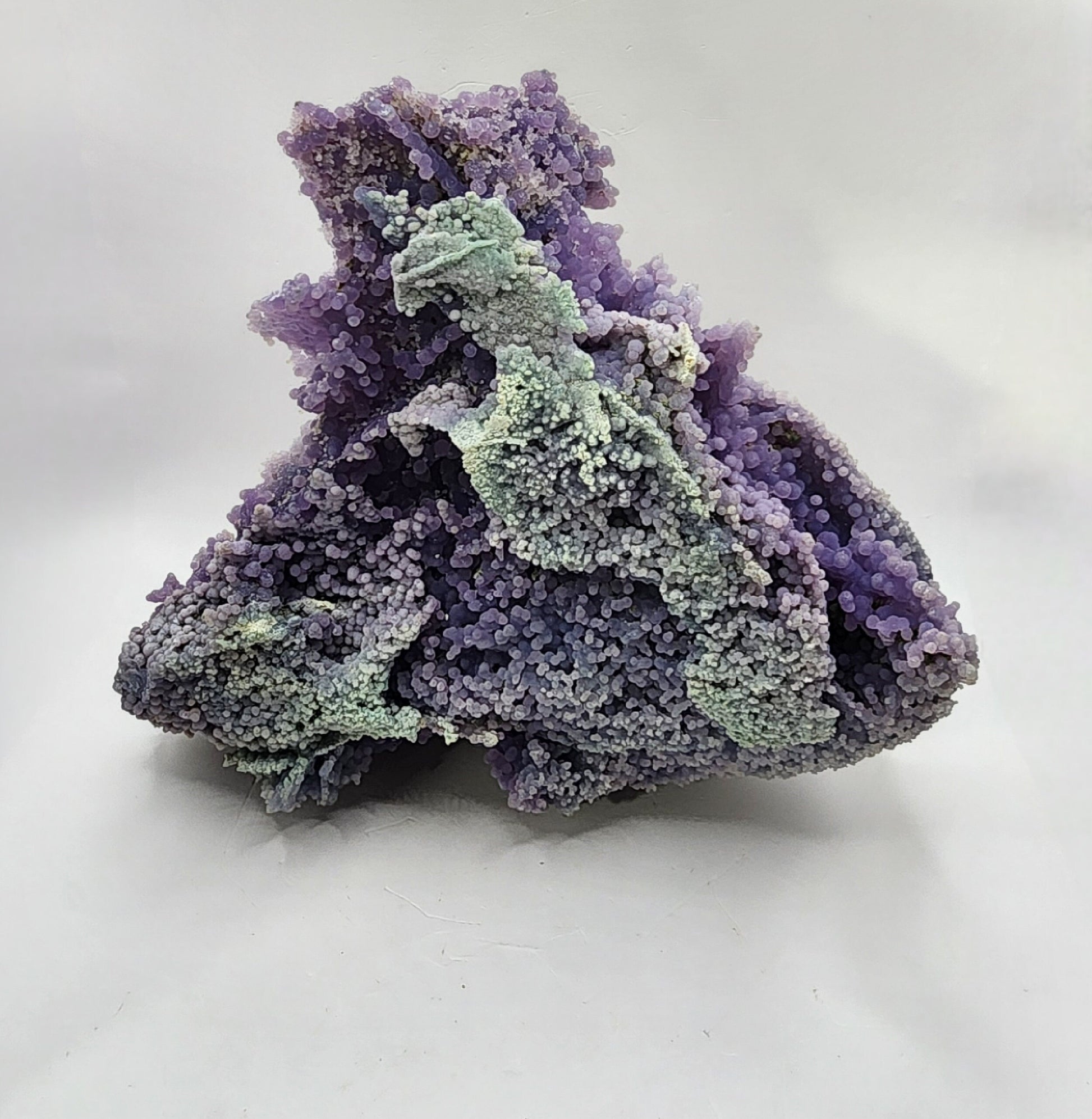Very nice-sized specimen of botryoidal chalcedony from Indonesia, also known as grape agate. Grape agate is a gorgeous, naturally occurring mineral that, as the common name implies, resembles grape clusters. Grape agate is typically priced by size and quality with very large, nice quality specimens getting up into thousands of dollars. This particular specimen has very crisp grapes and beautiful Grape "blades". Makes a gorgeous home decor or conversation starter piece!