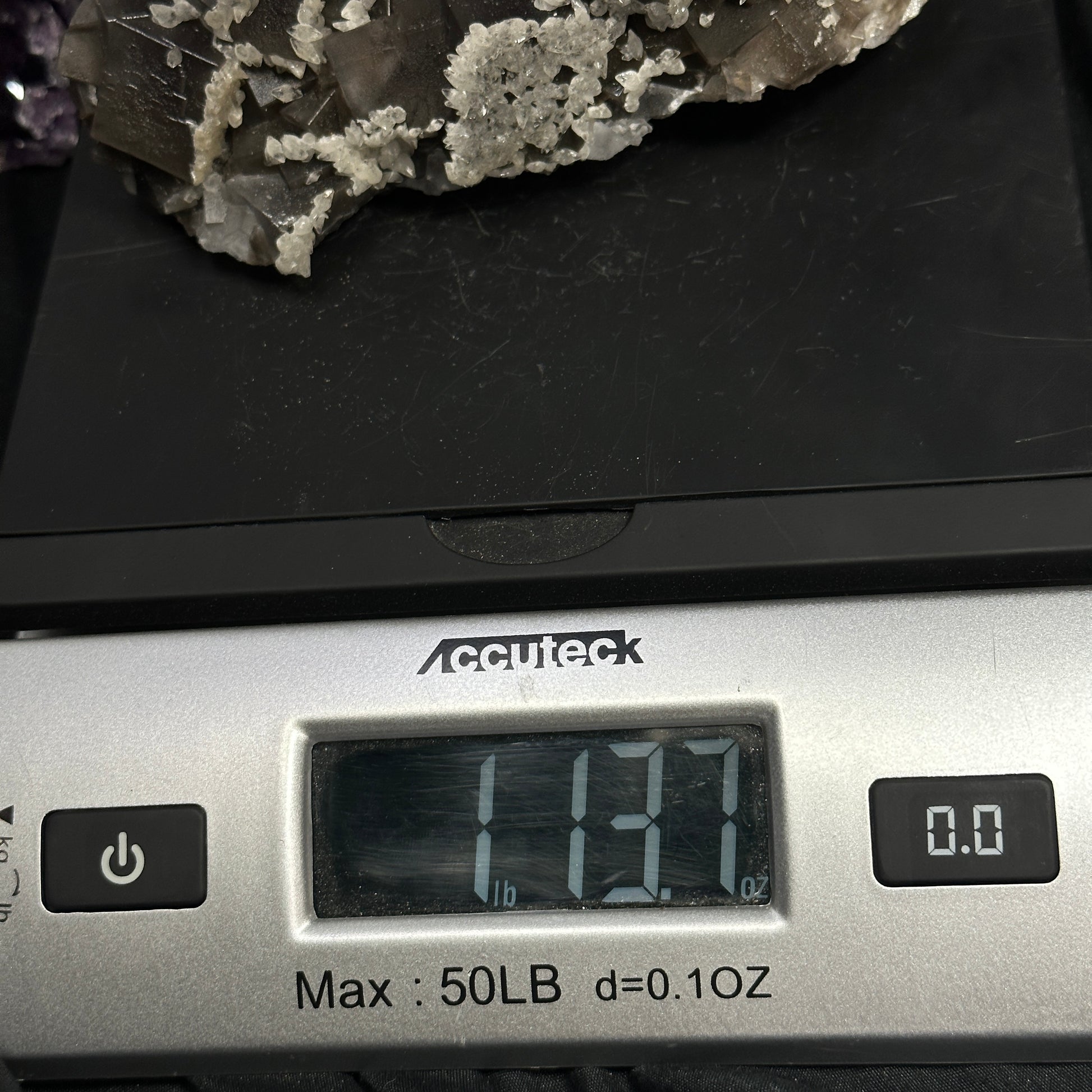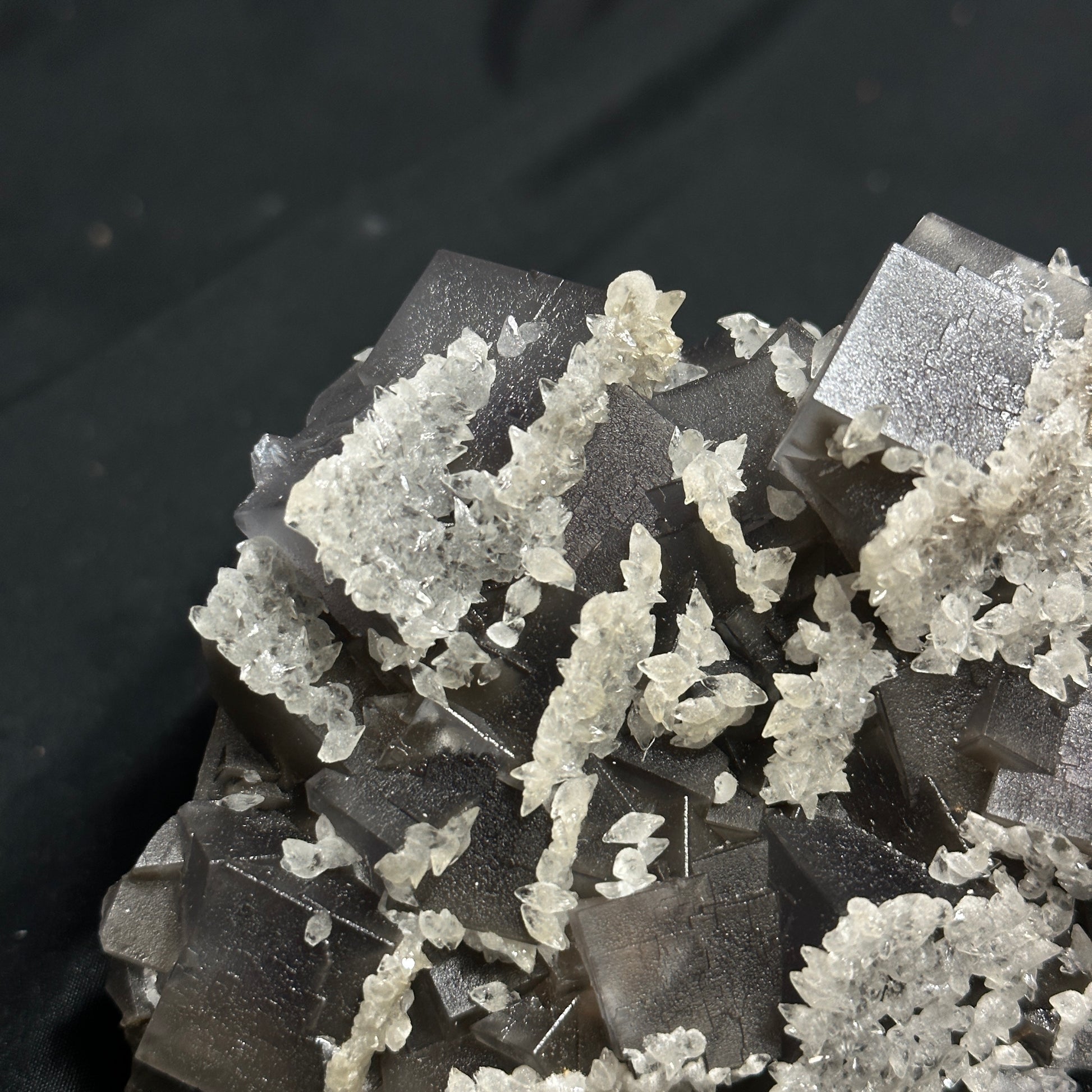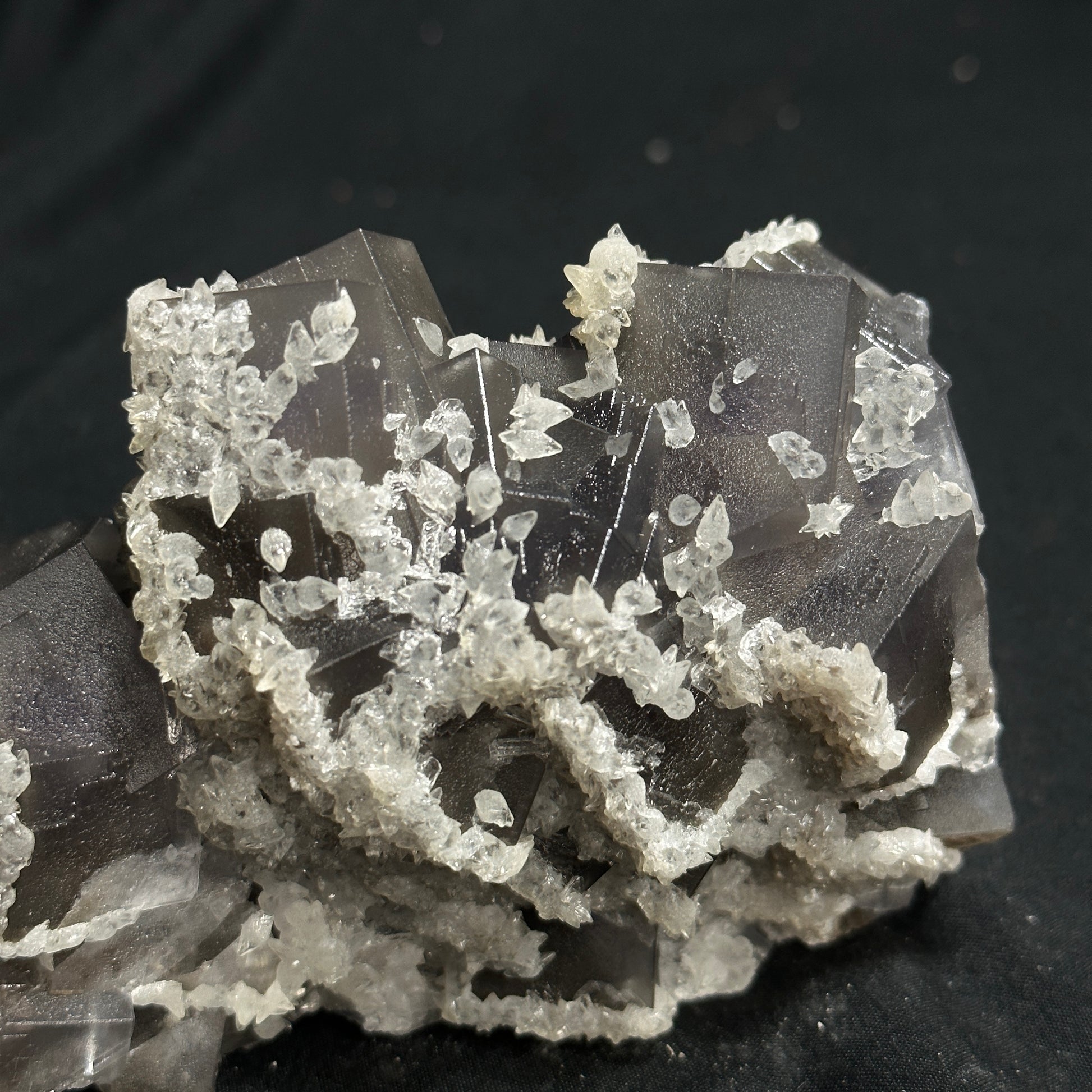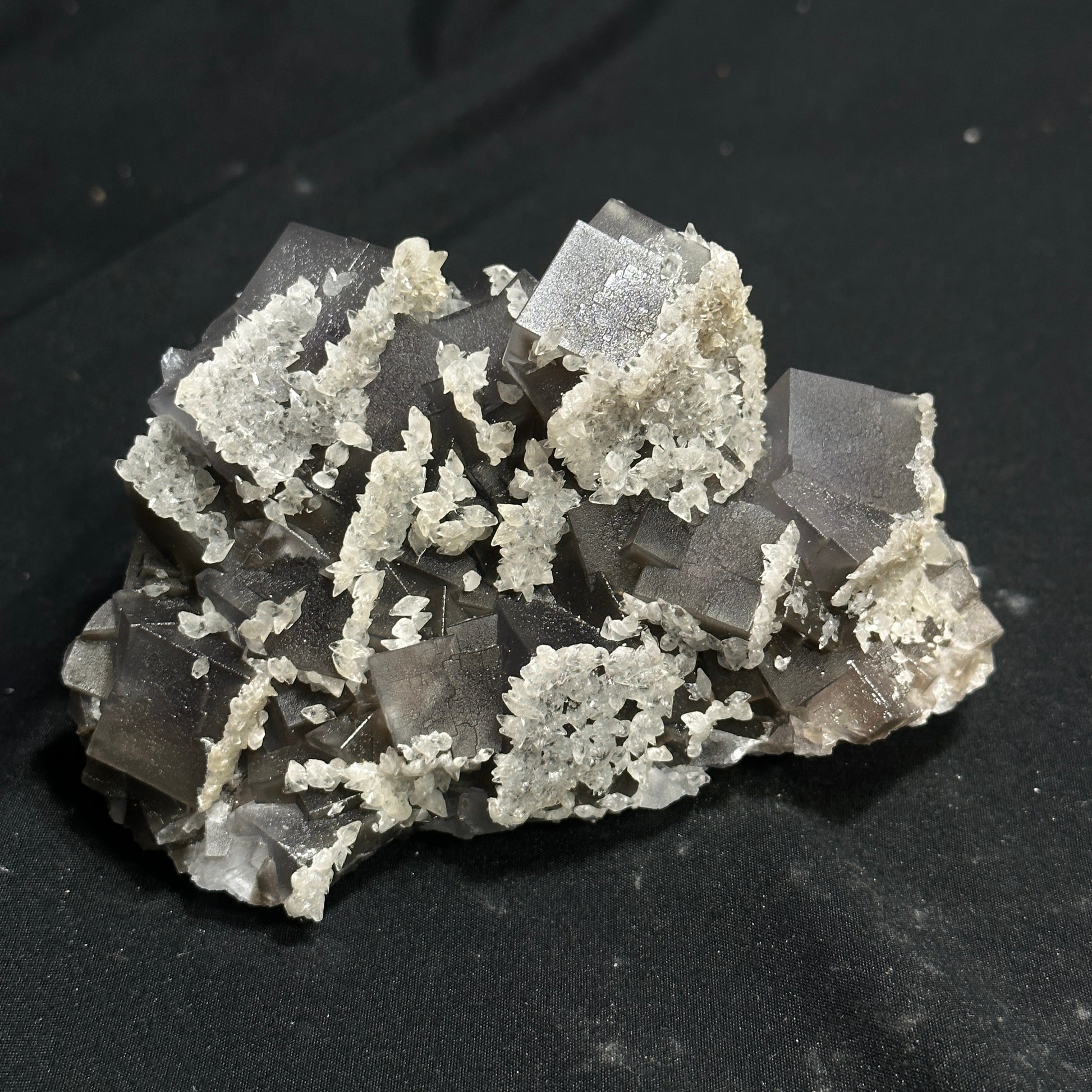 This Fluorite specimen is remarkable! It has many gray cubed layers as well as small Dogtooth Calcite around it!