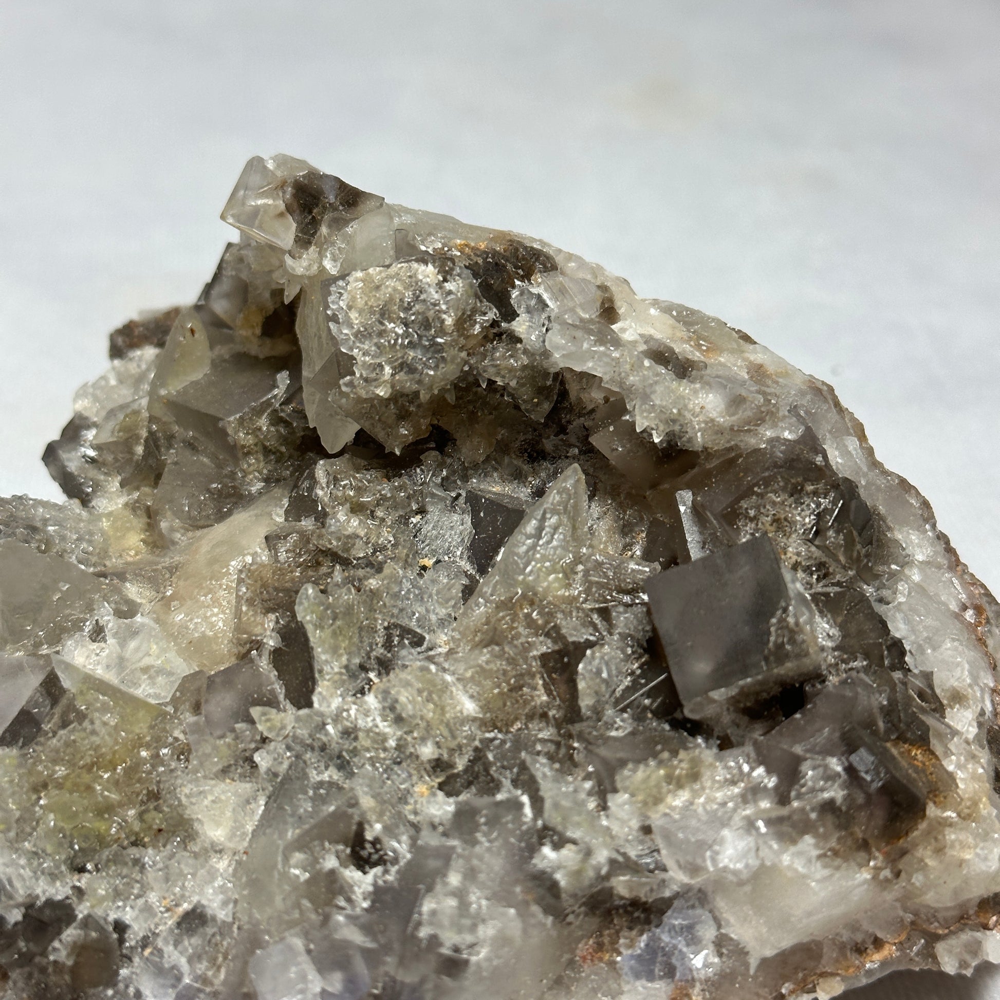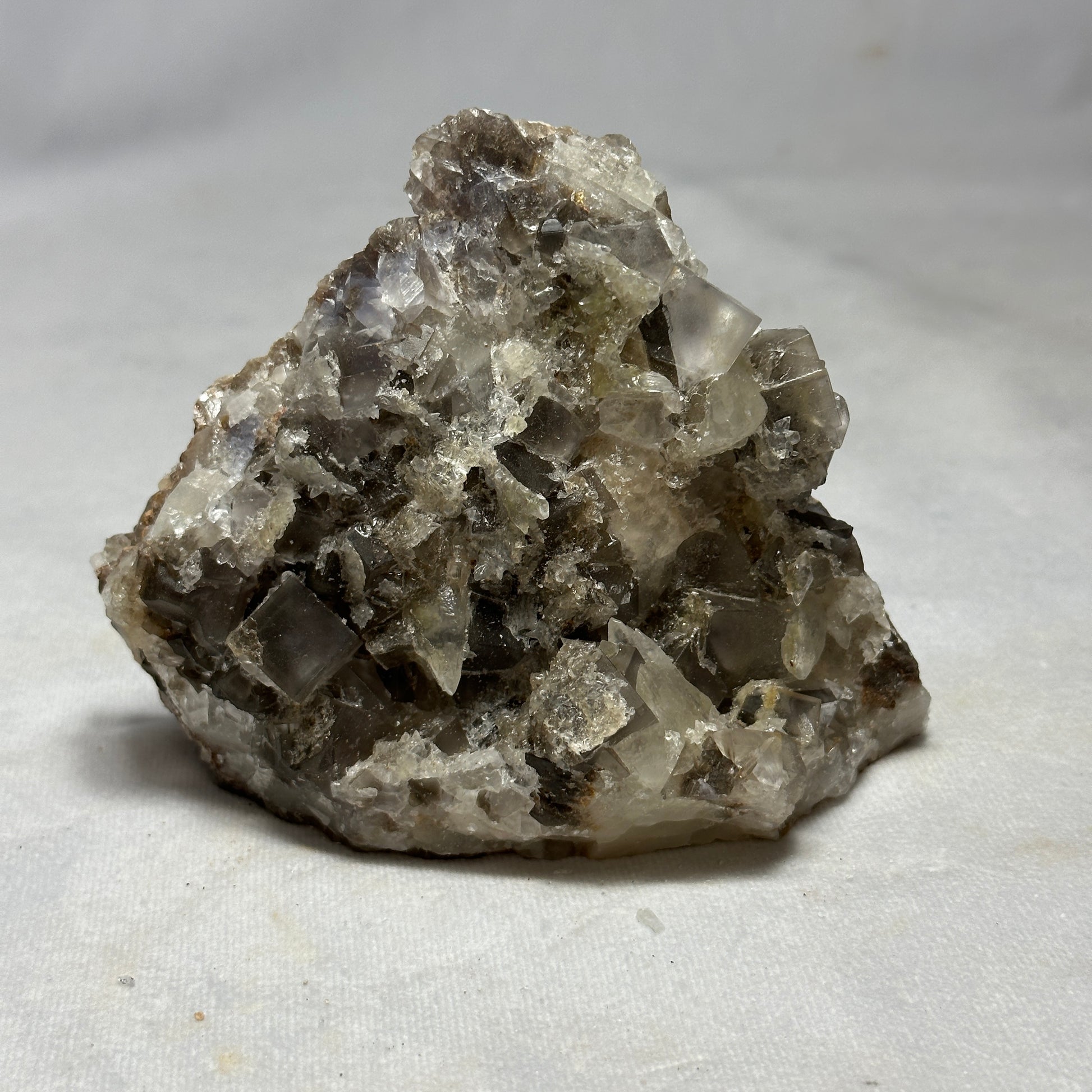 This Fluorite specimen is beautiful! It has many gray cubed layers as well as small Dogtooth Calcite shards around it!