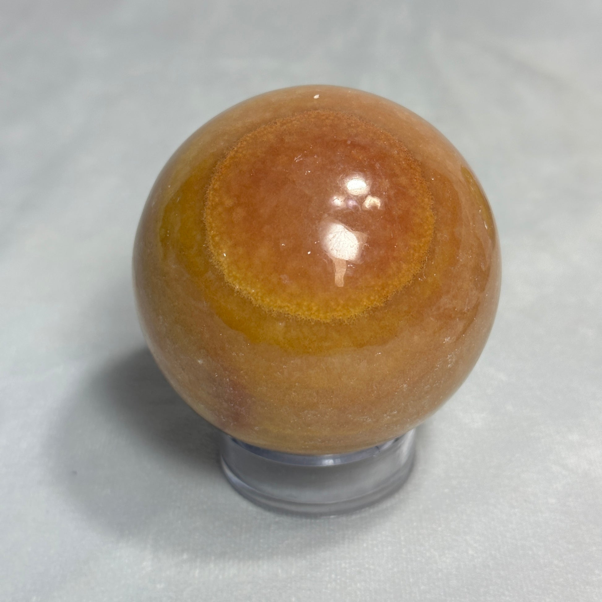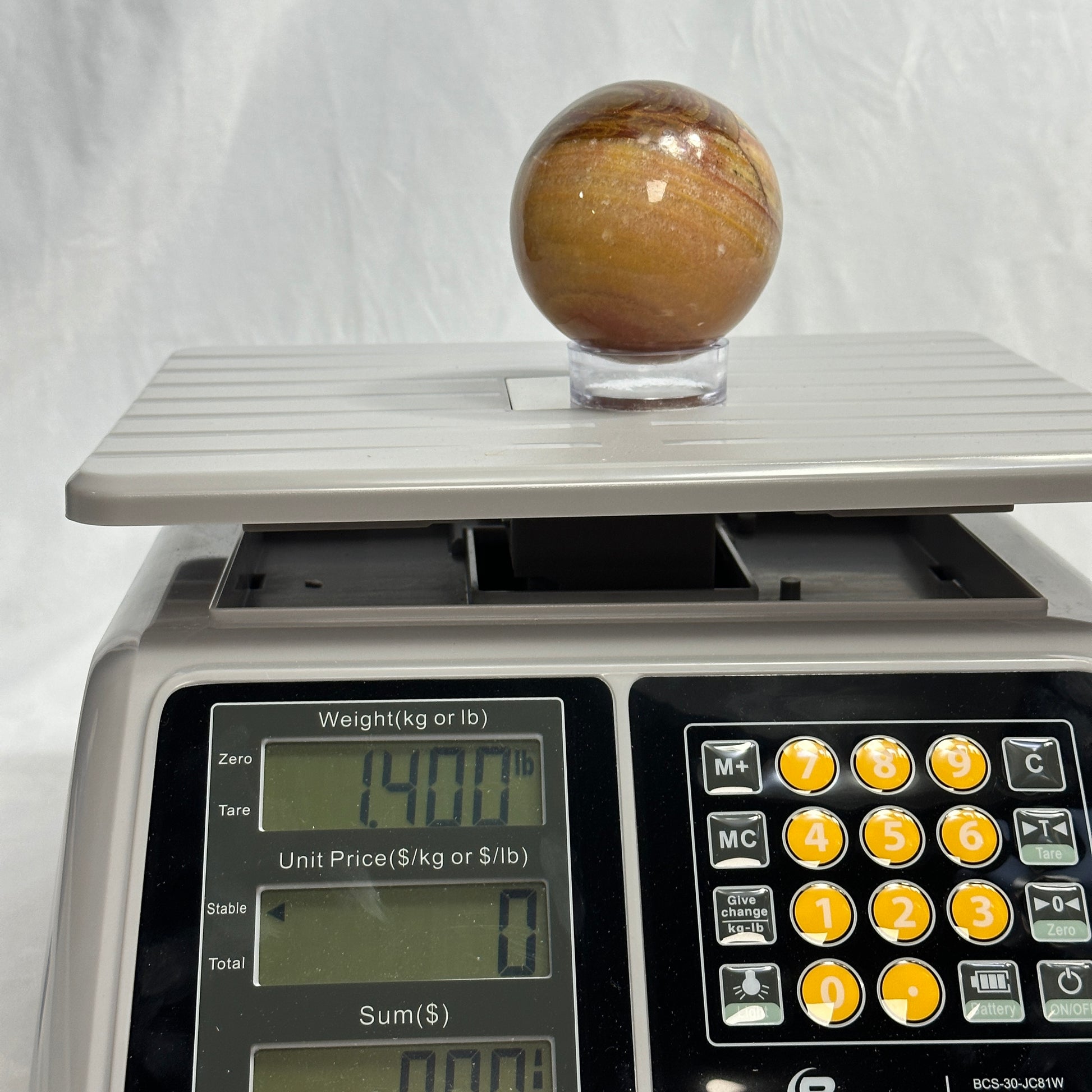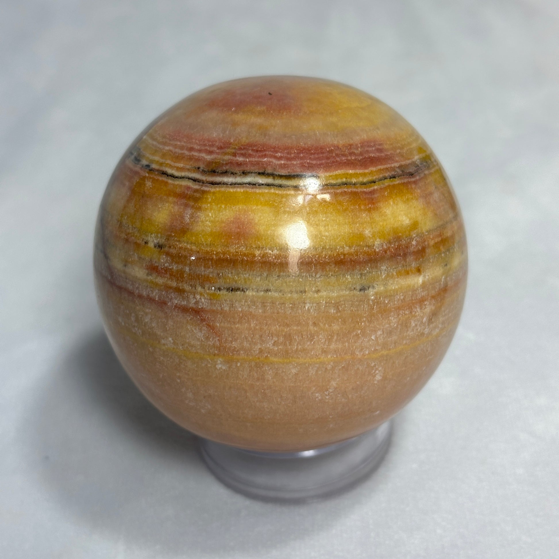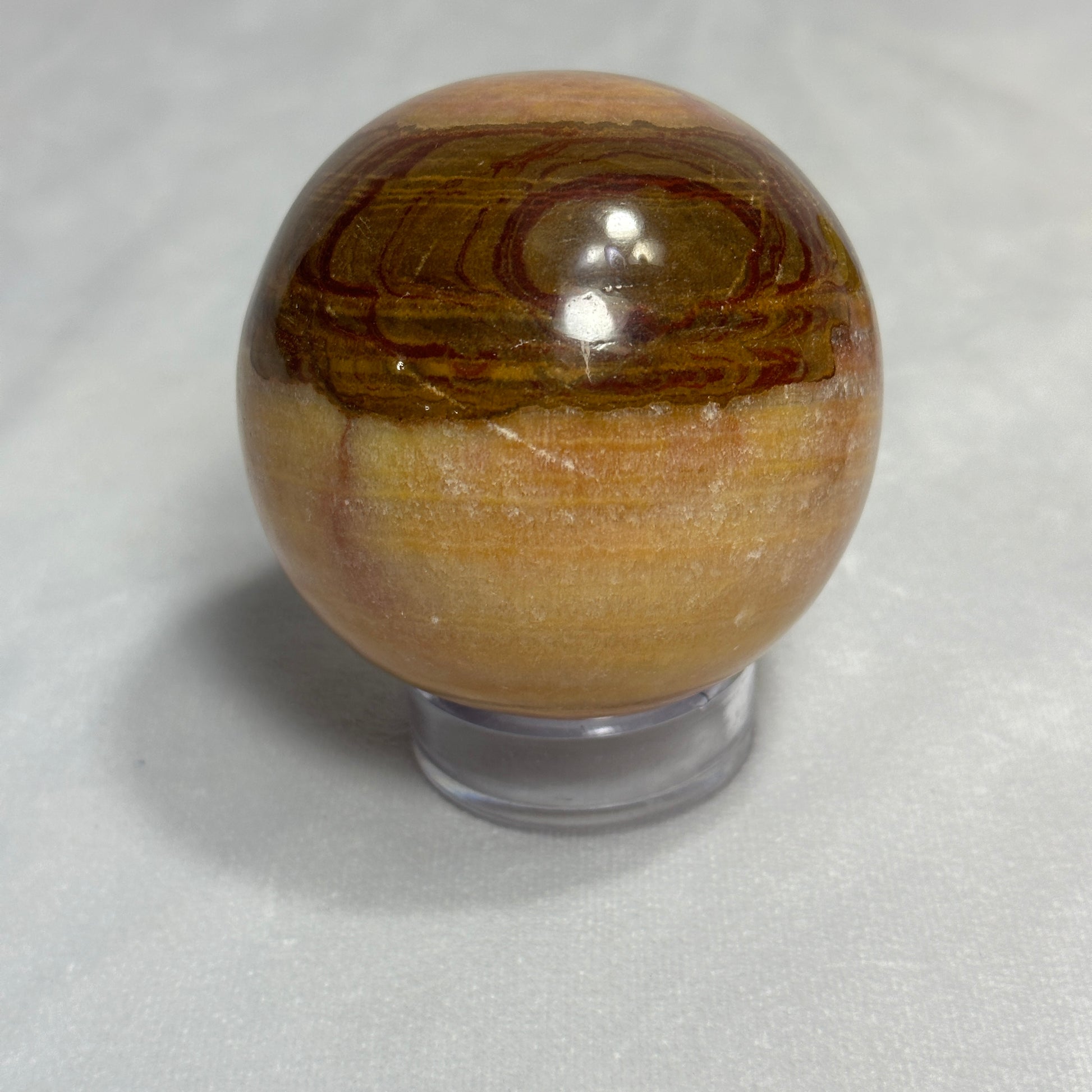This Brown Banded Calcite Sphere has many distinct shades of orange, red, yellow, and brown and makes for a beautiful shelf of bookcase decor!