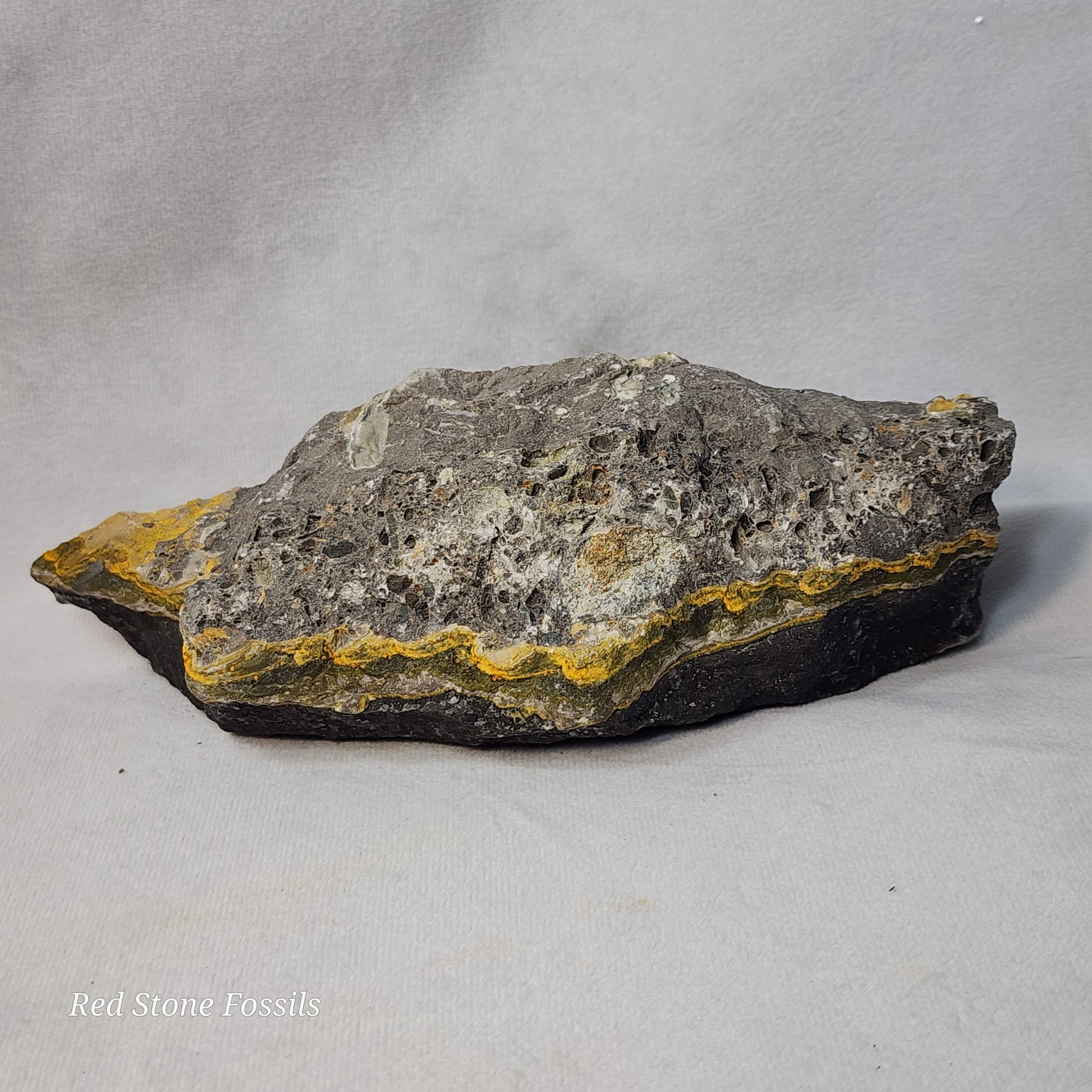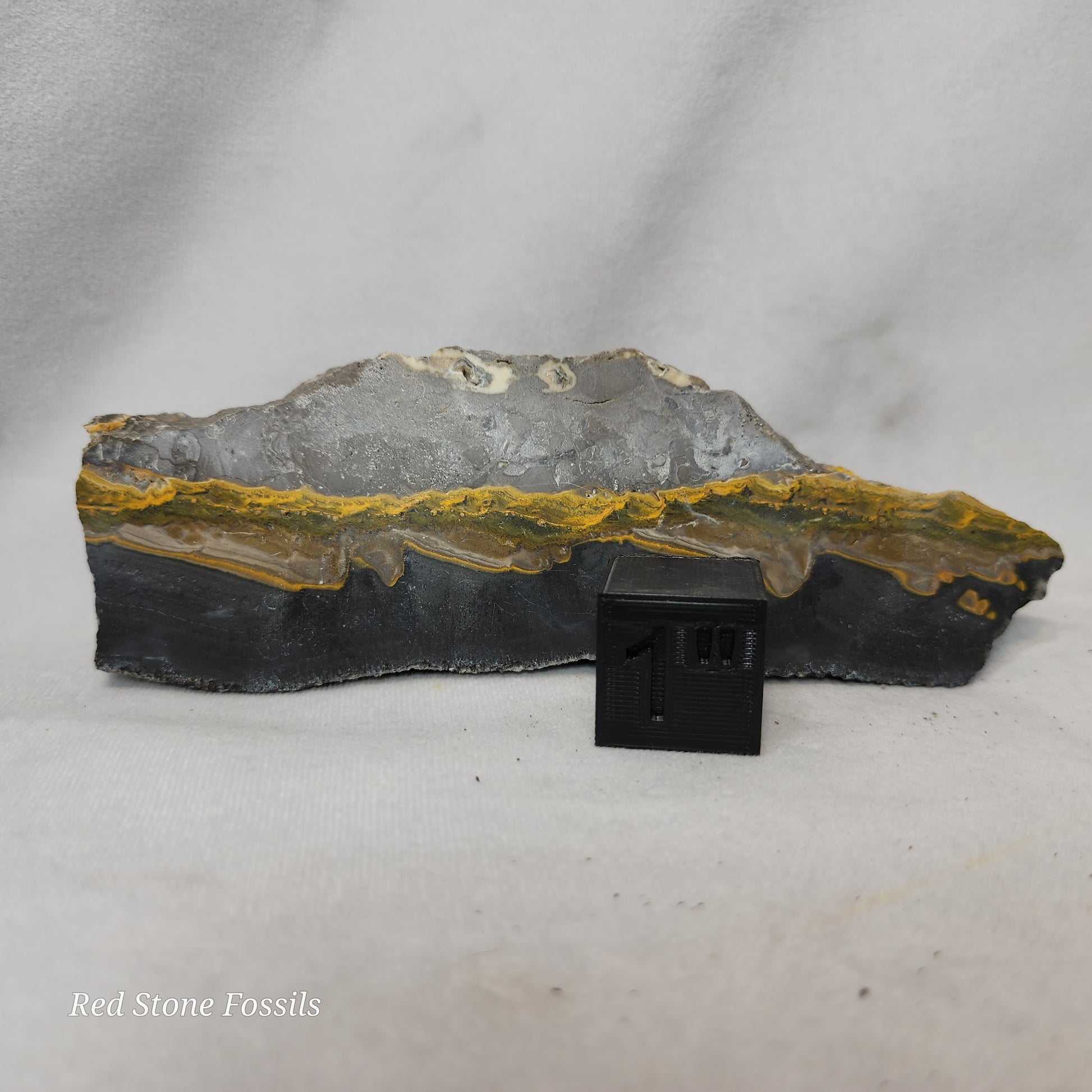 Bumblebee Jasper has mineral bands of sulfur (yellow), calcium and aragonite (white), realgar (orange) and iron pyrite (black).