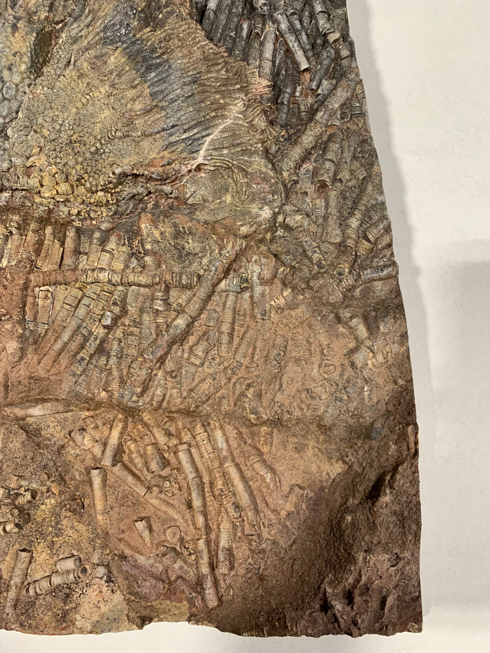 This fossil piece is a mega crinoid plate! This specimen has been repaired, but that doesn't take away from its beauty!