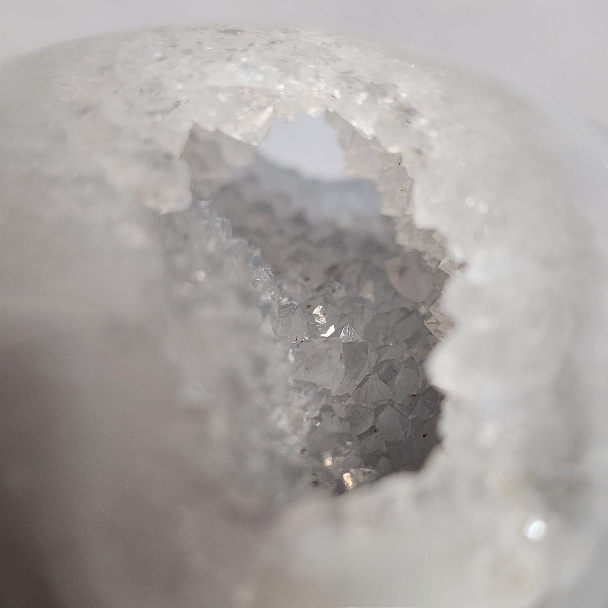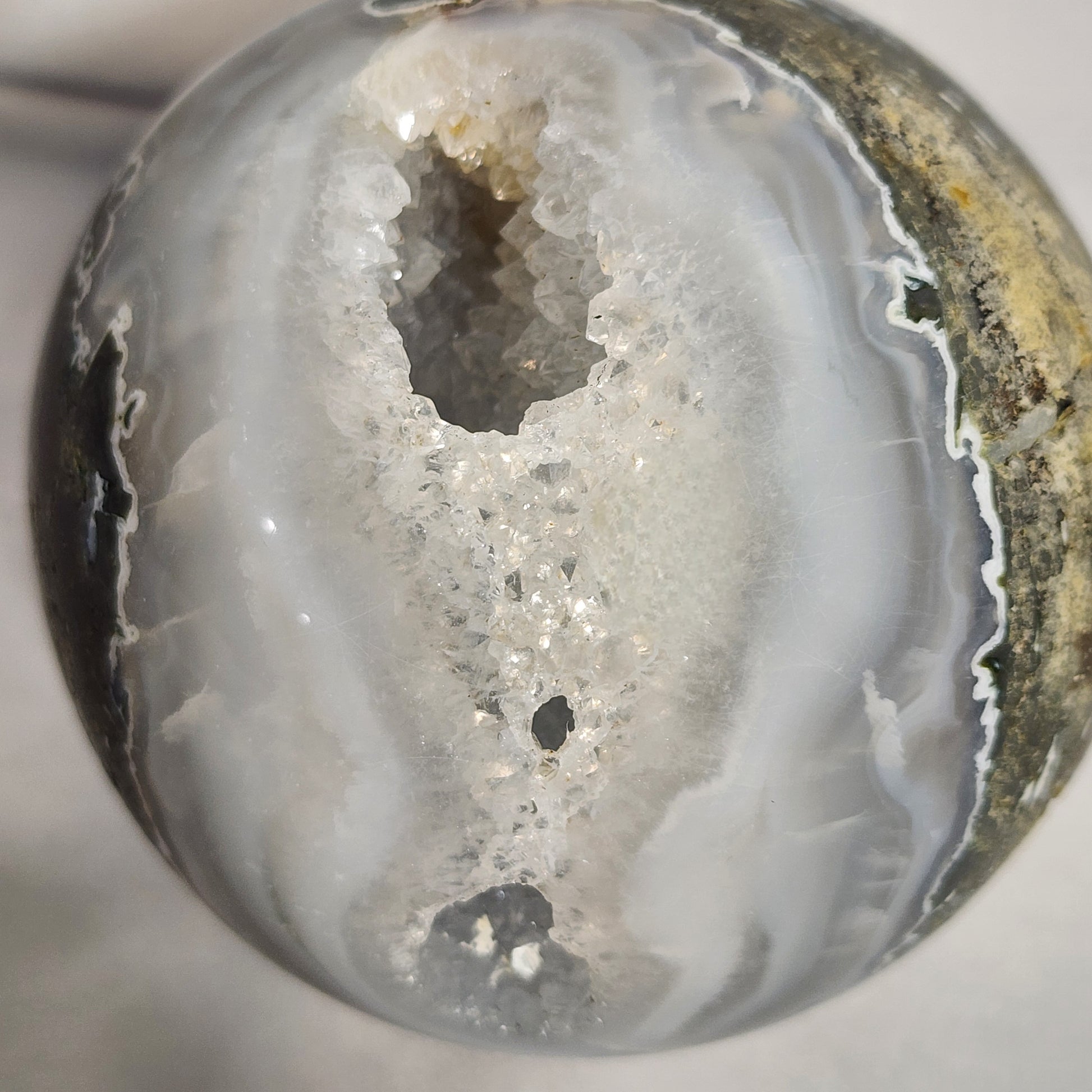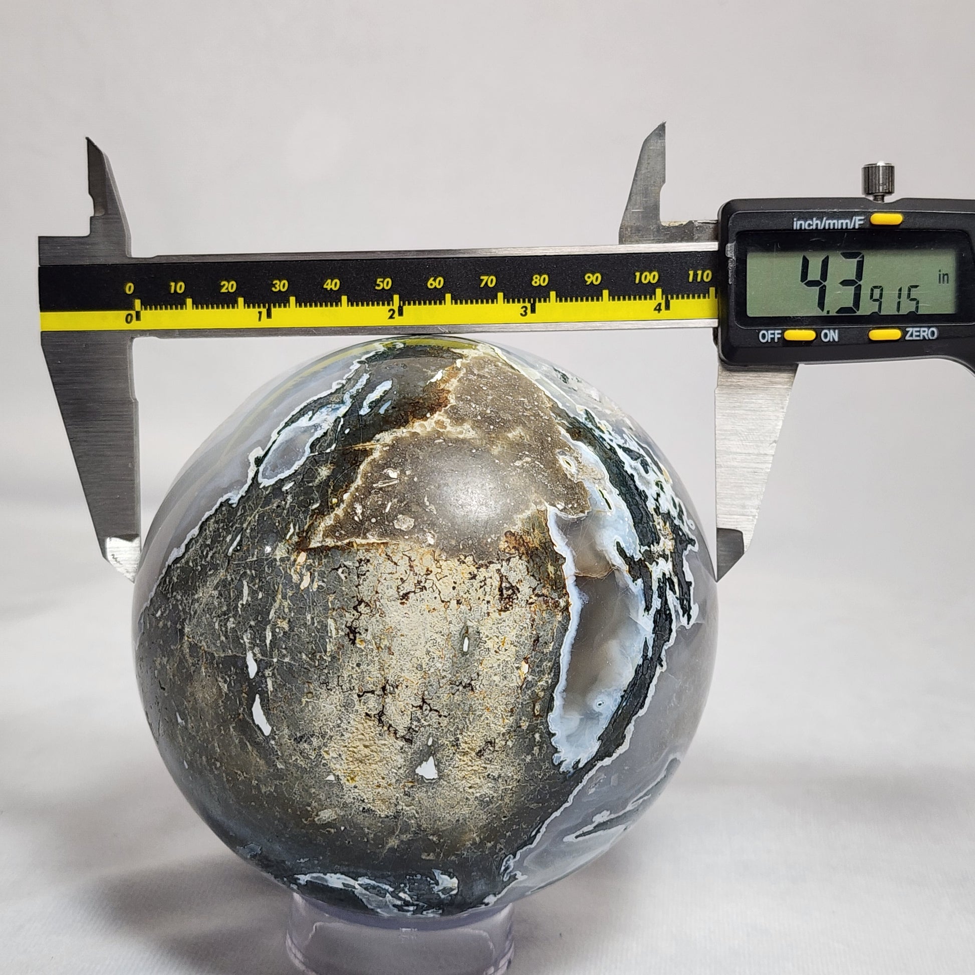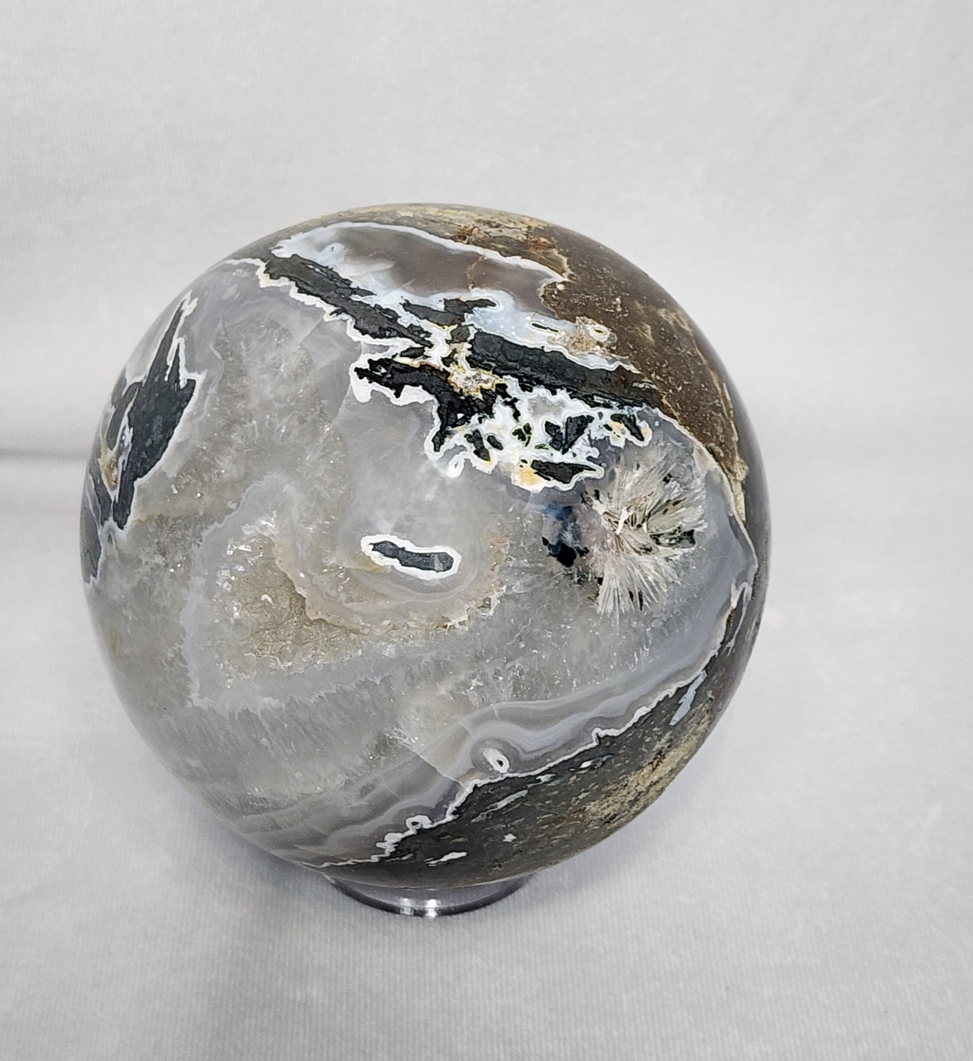 This particular sphere has many spectacular features! There is a geode-like cavity in the sphere with beautiful, sparkling crystals that shine all the way through! The amazing natural colors catch the eye from across a room!