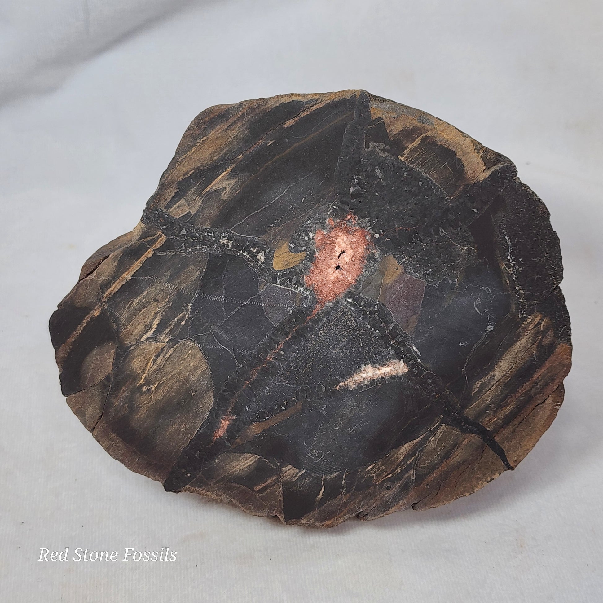 This split polished Septarian Nodule is unique with its dark, natural, color. The "starfish" mineral cracks make this a captivating piece to look at.