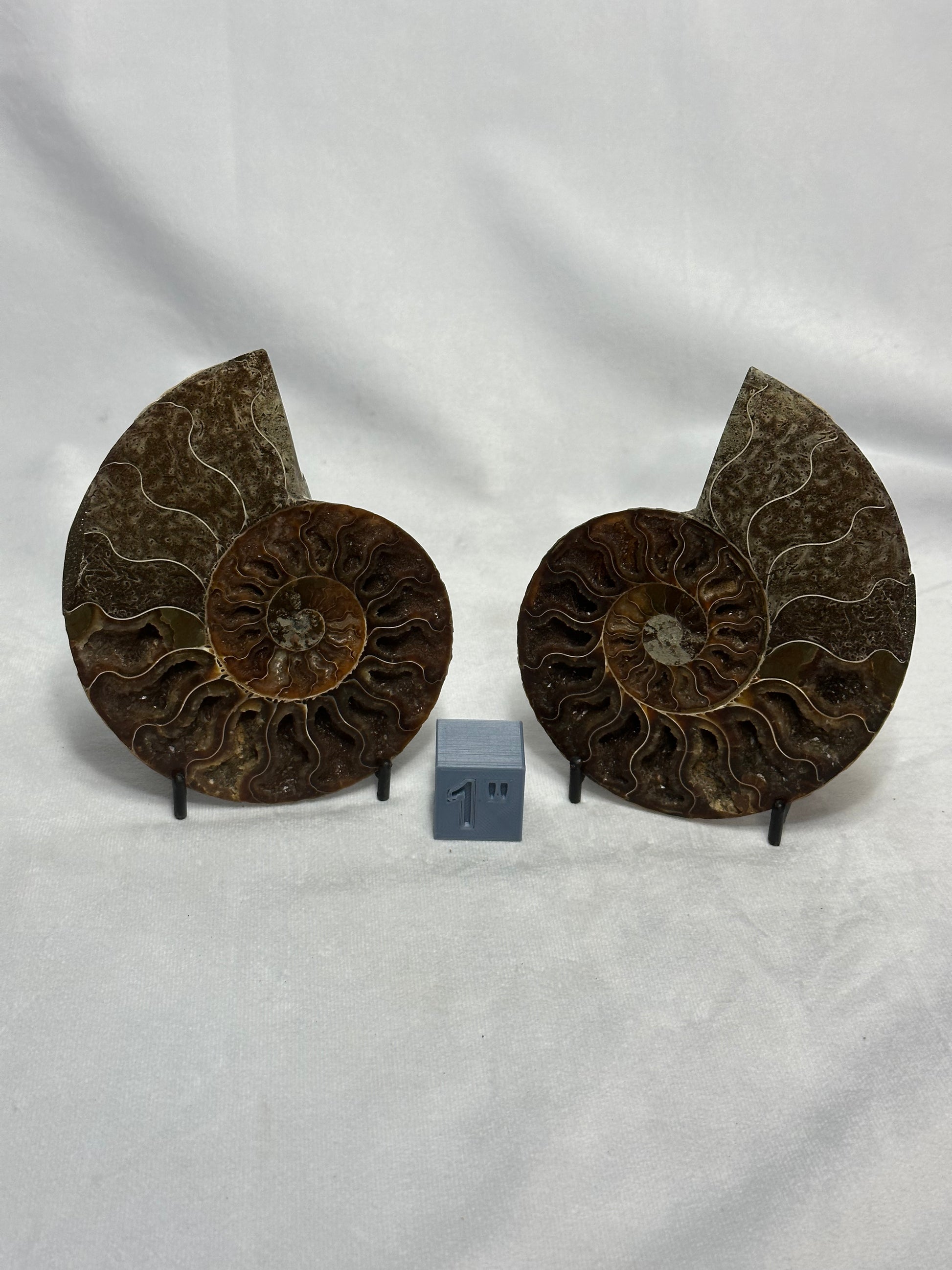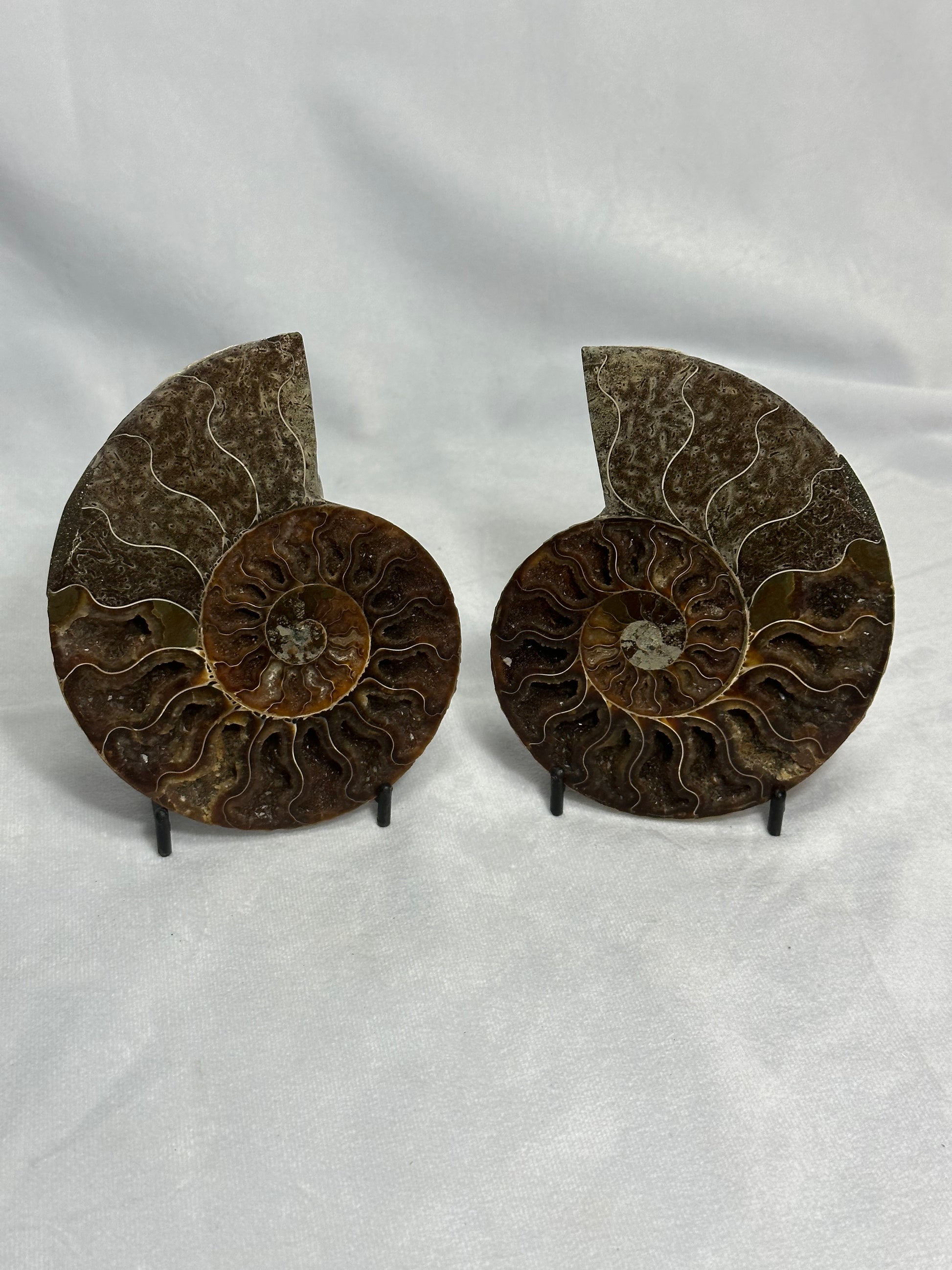 This is a high grade Split Polished Ammonite pair. The different shades of brown and the beautiful detail in the cavities make this a great piece to display side by side! The color scheme builds a fun, earthy theme for your home!