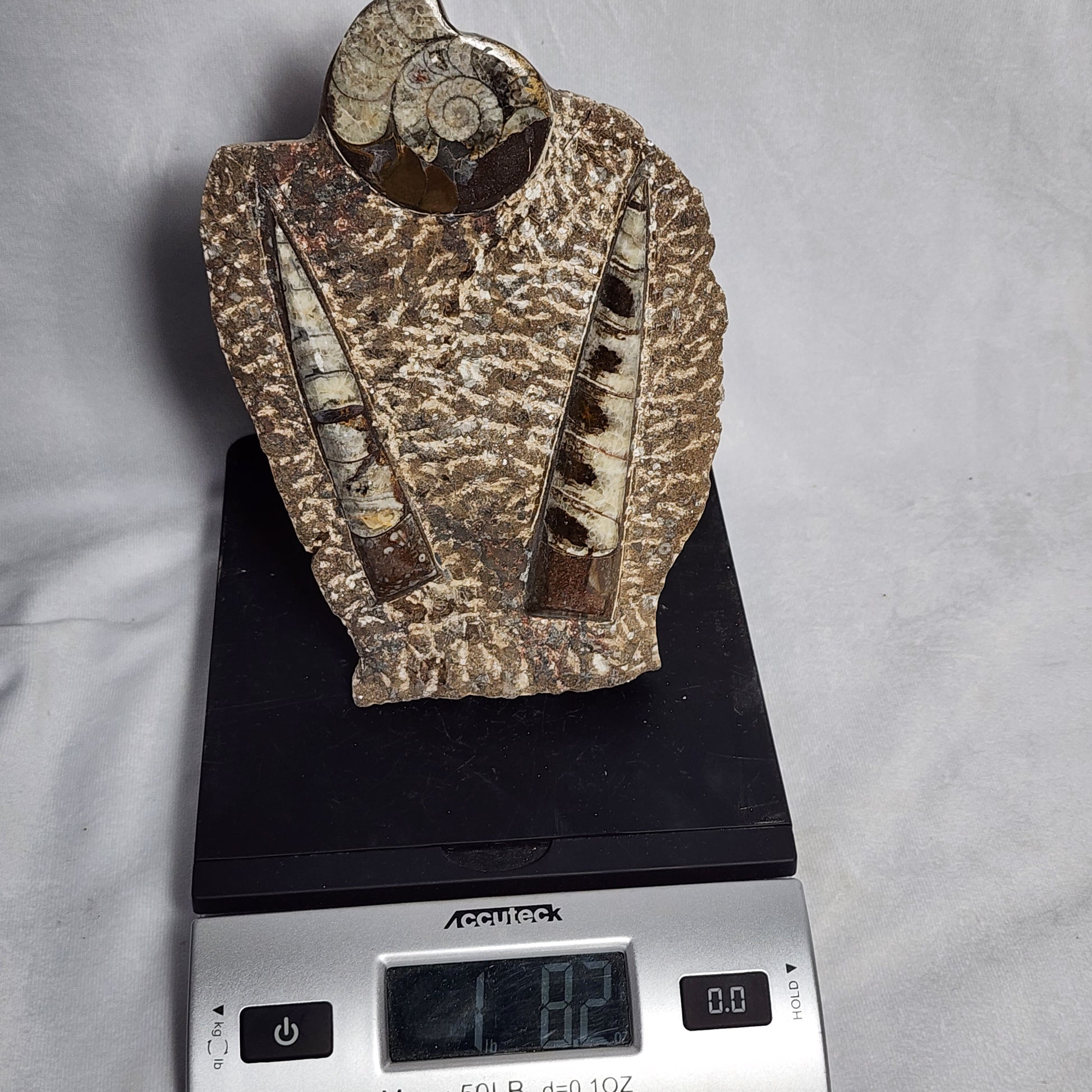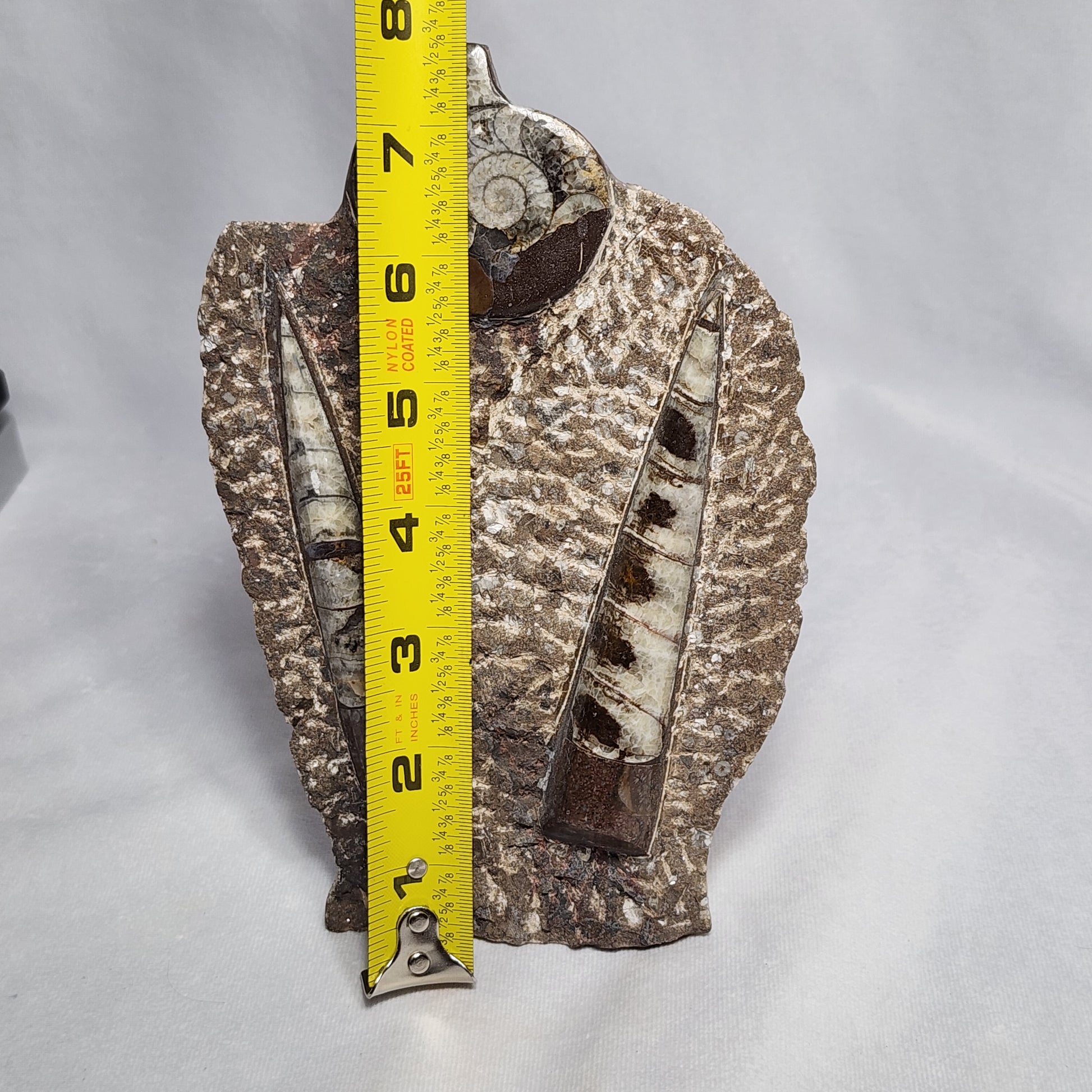 The details on this specimen is remarkable and the polish just adds to the beauty. The 2 Orthoceras segments are stunning and the Goniatite in the middle just pulls this specimen together. See also the amazing Orthoceras on the back!