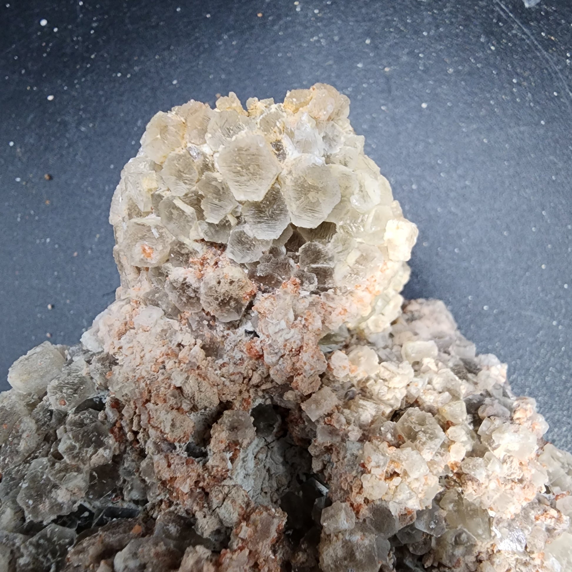 This Aragonite cluster has translucent hexagon crystals and a rusty red coloring on it.