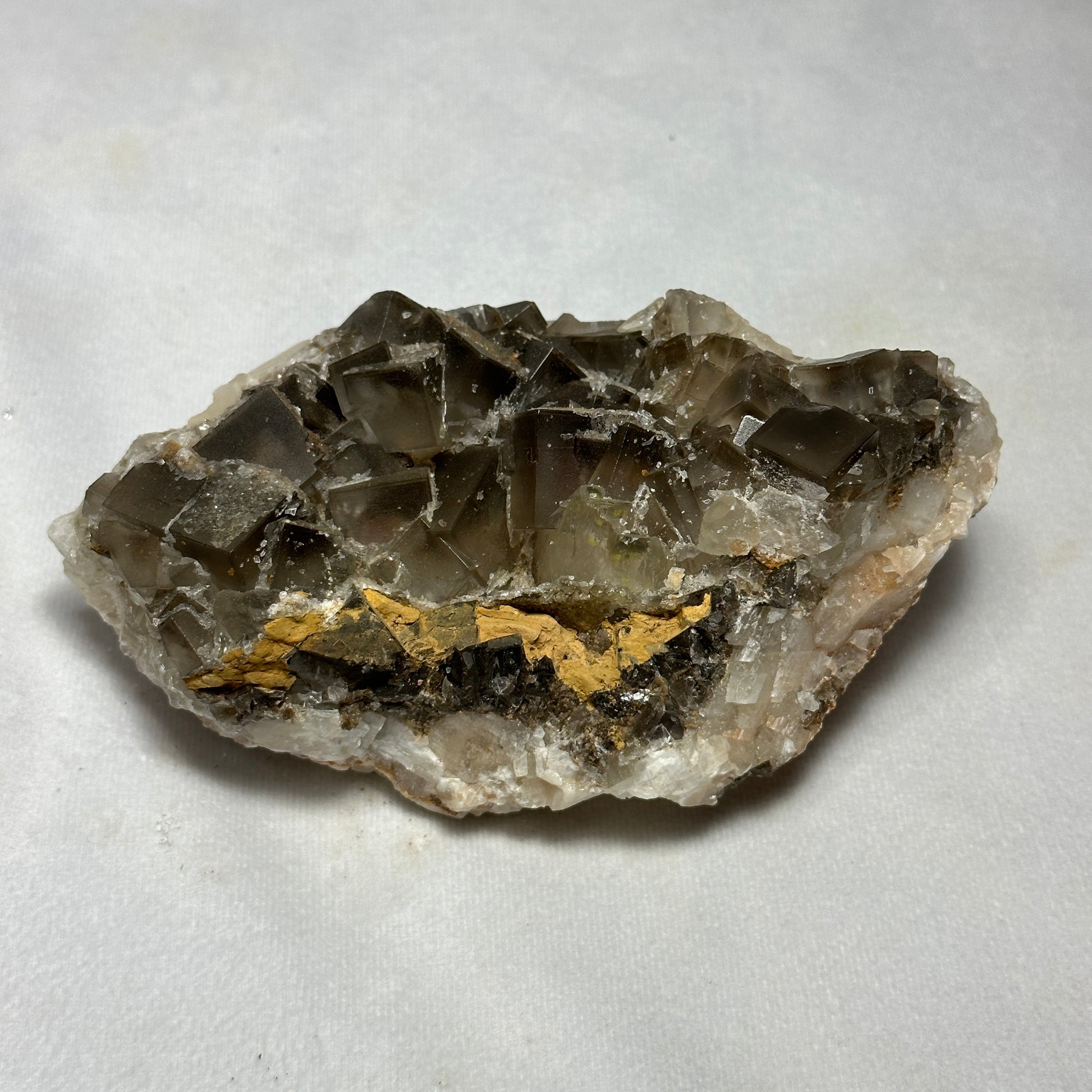 This Fluorite specimen is remarkable! It has many gray cubed layers as well as small Dogtooth Calcite around it!