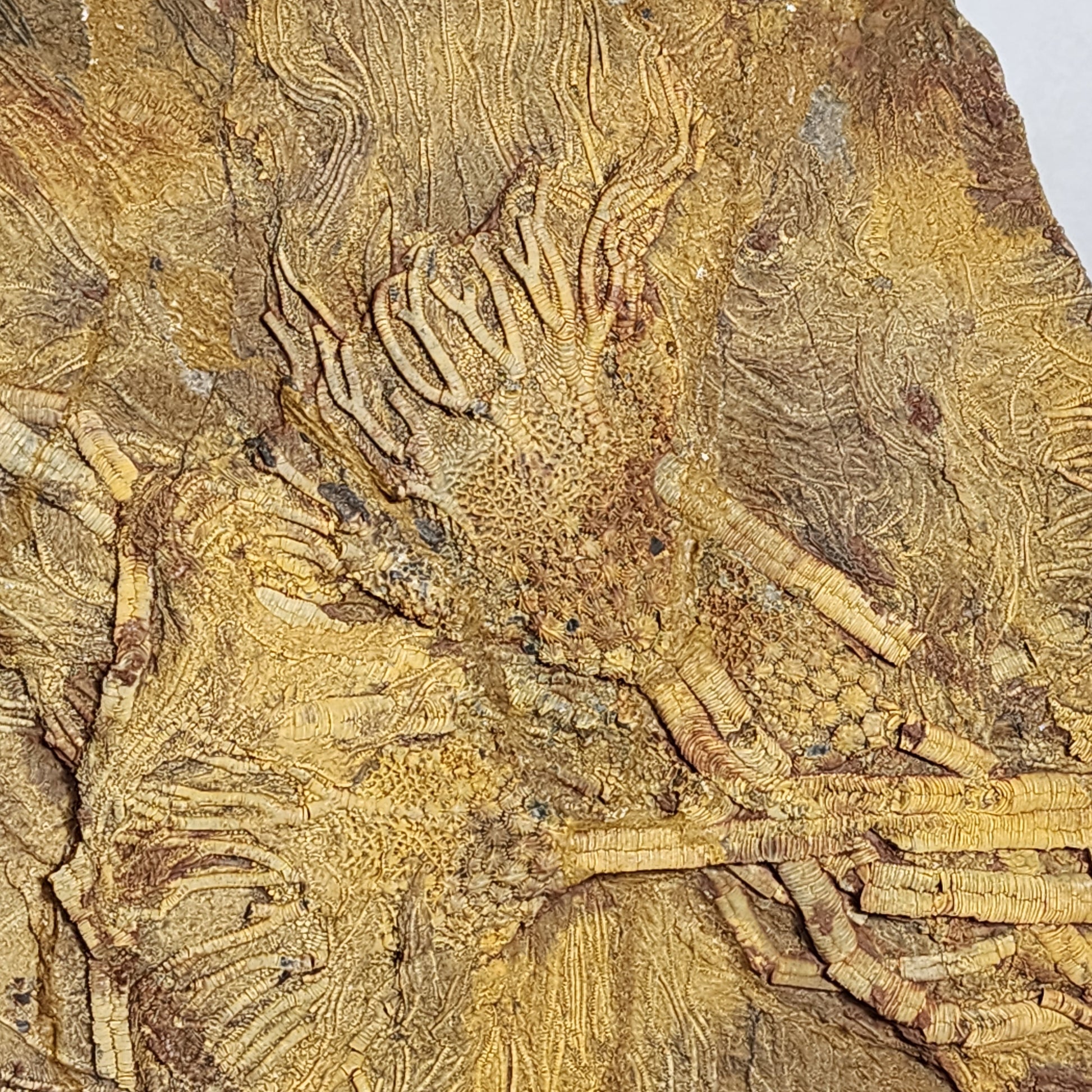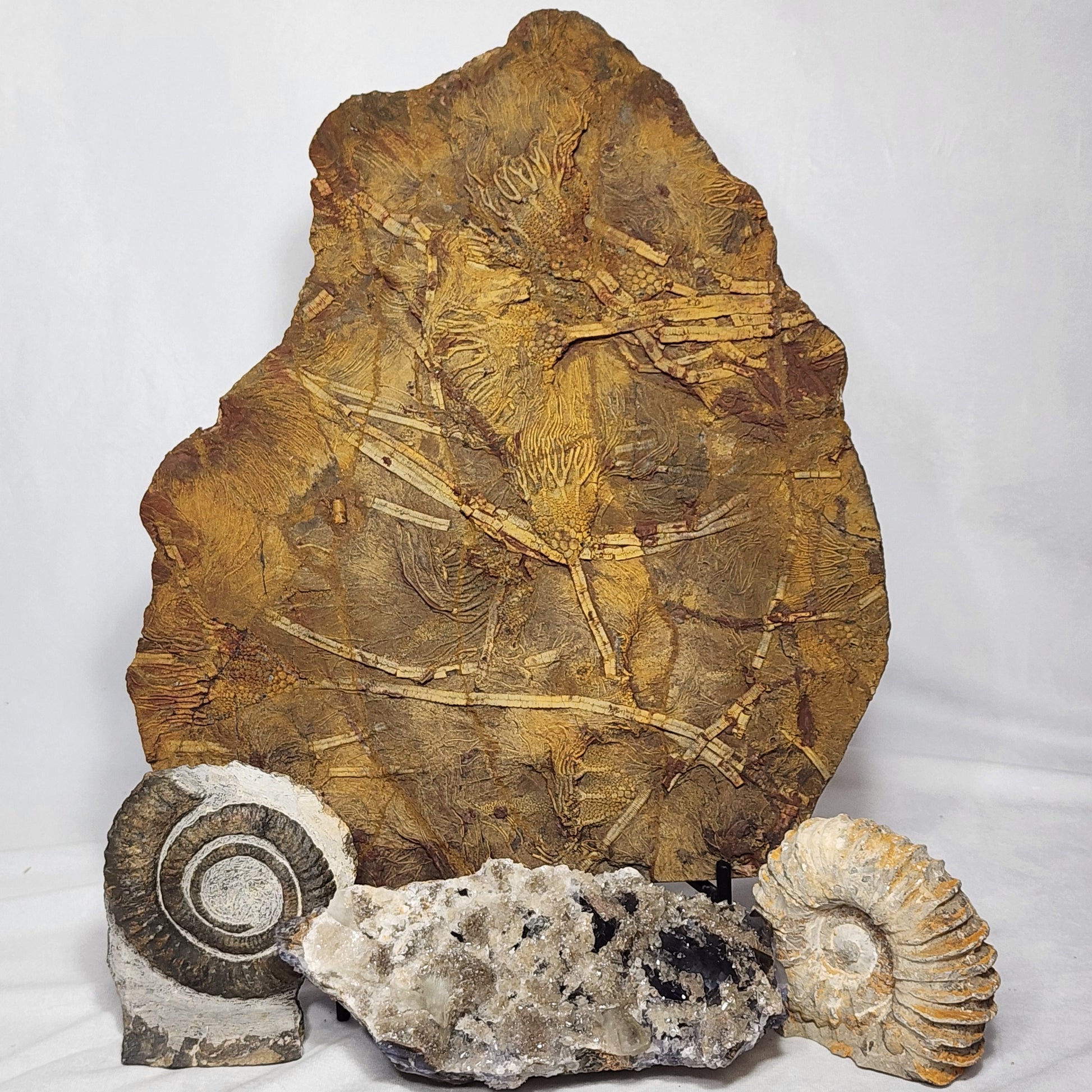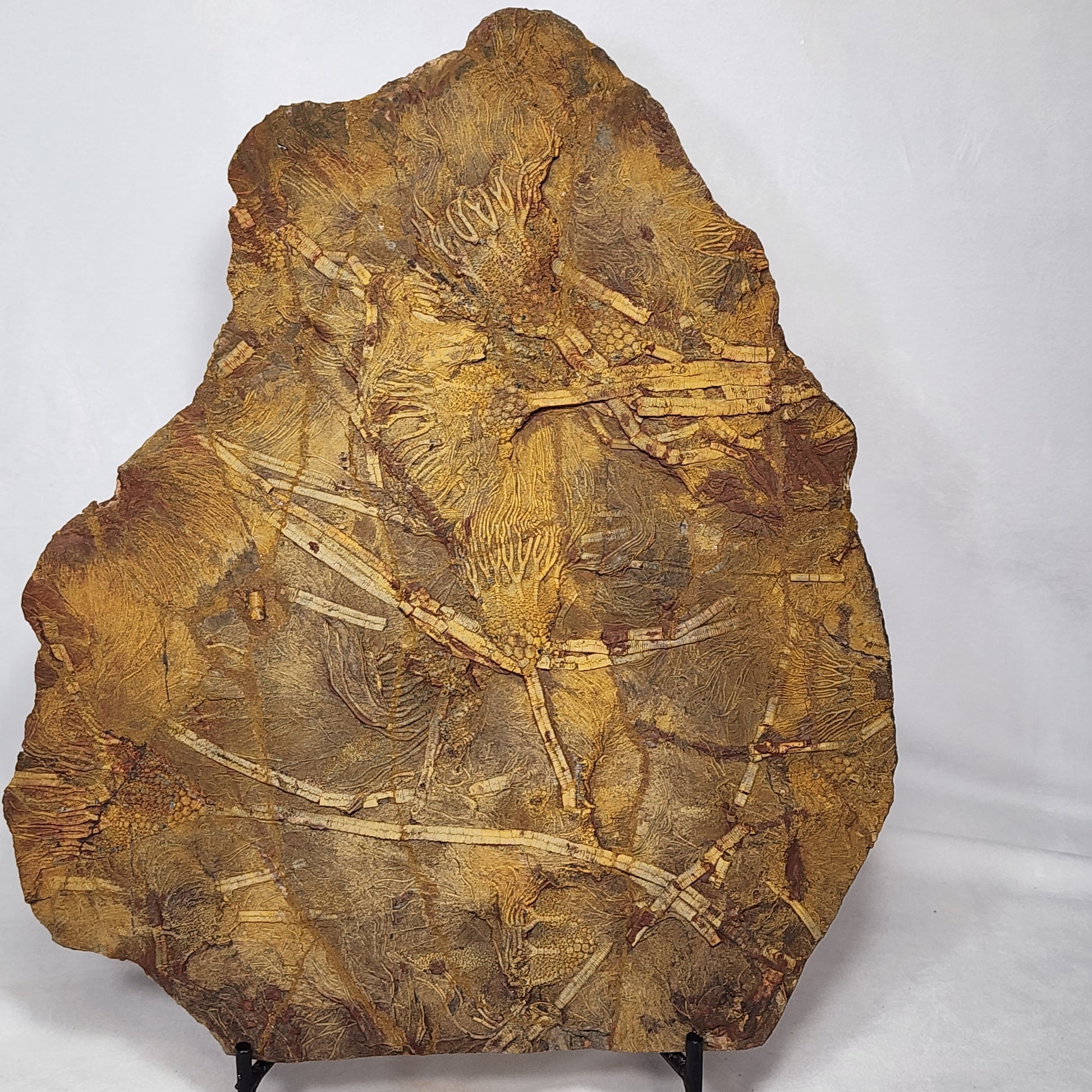 This fancy fossil is a Crinoid Plate. Crinoids are sometimes called "Sea Lillies" because of their flower like appearance. These free-floating animals lived on the sea floor filtering the water for their food.