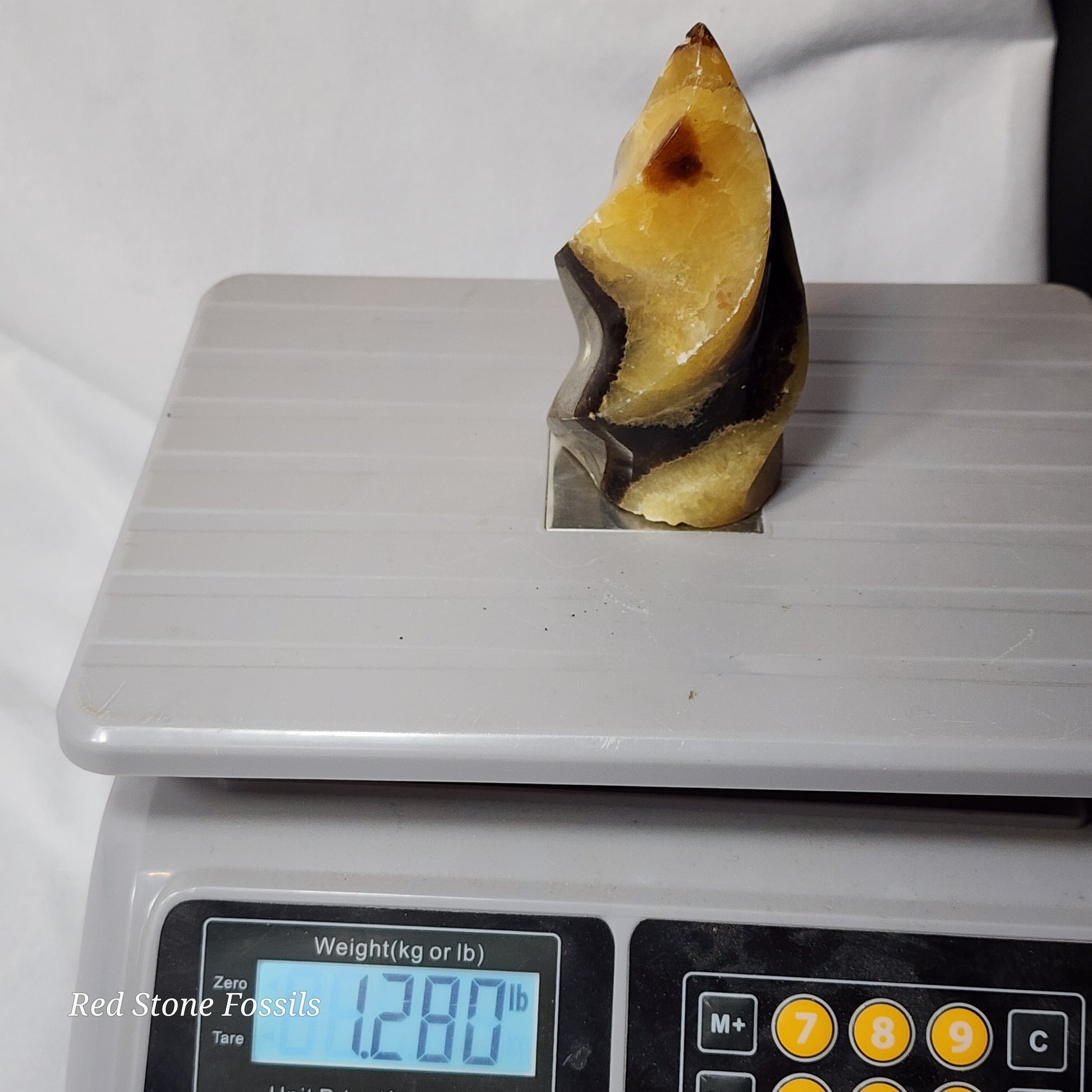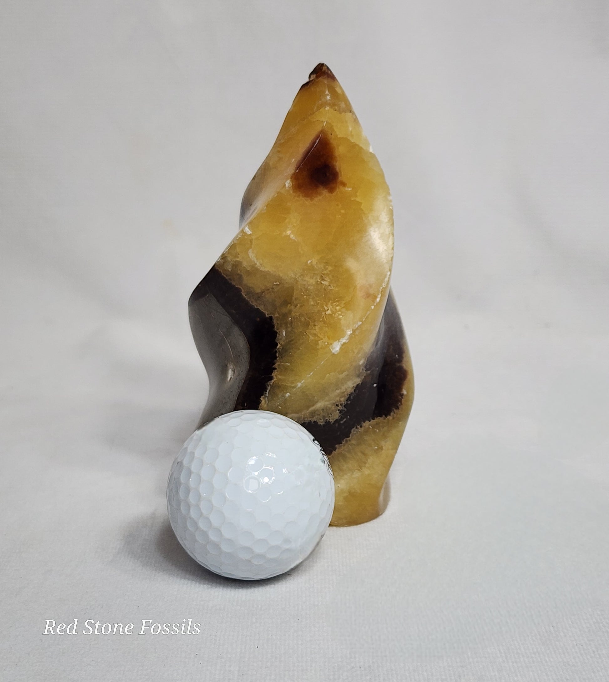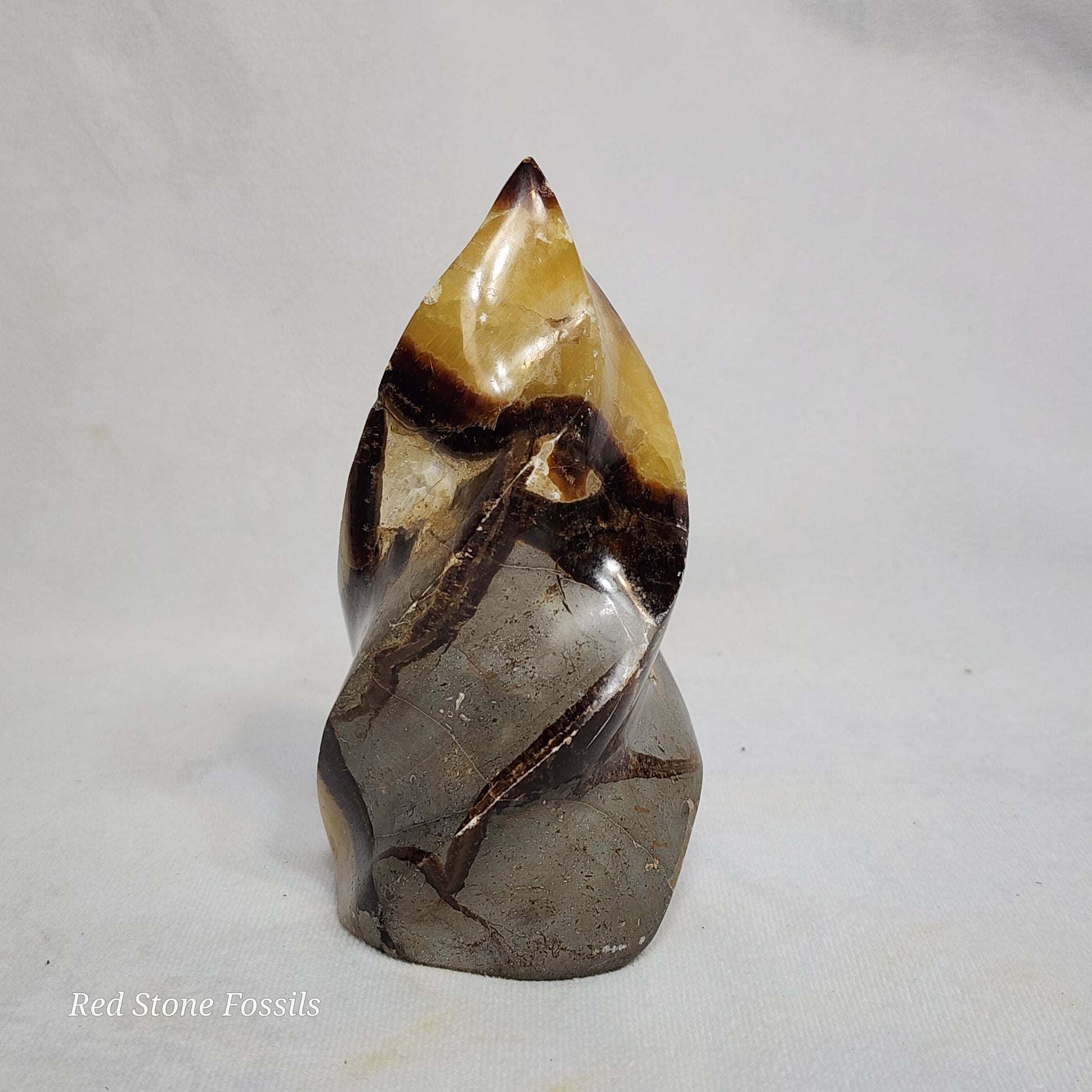 Septarian Flames are Septarian nodules that have been carved and polished. The natural pattern of the Septarian looks like dragon skin, hence where the name "Dragon Stone" comes from.