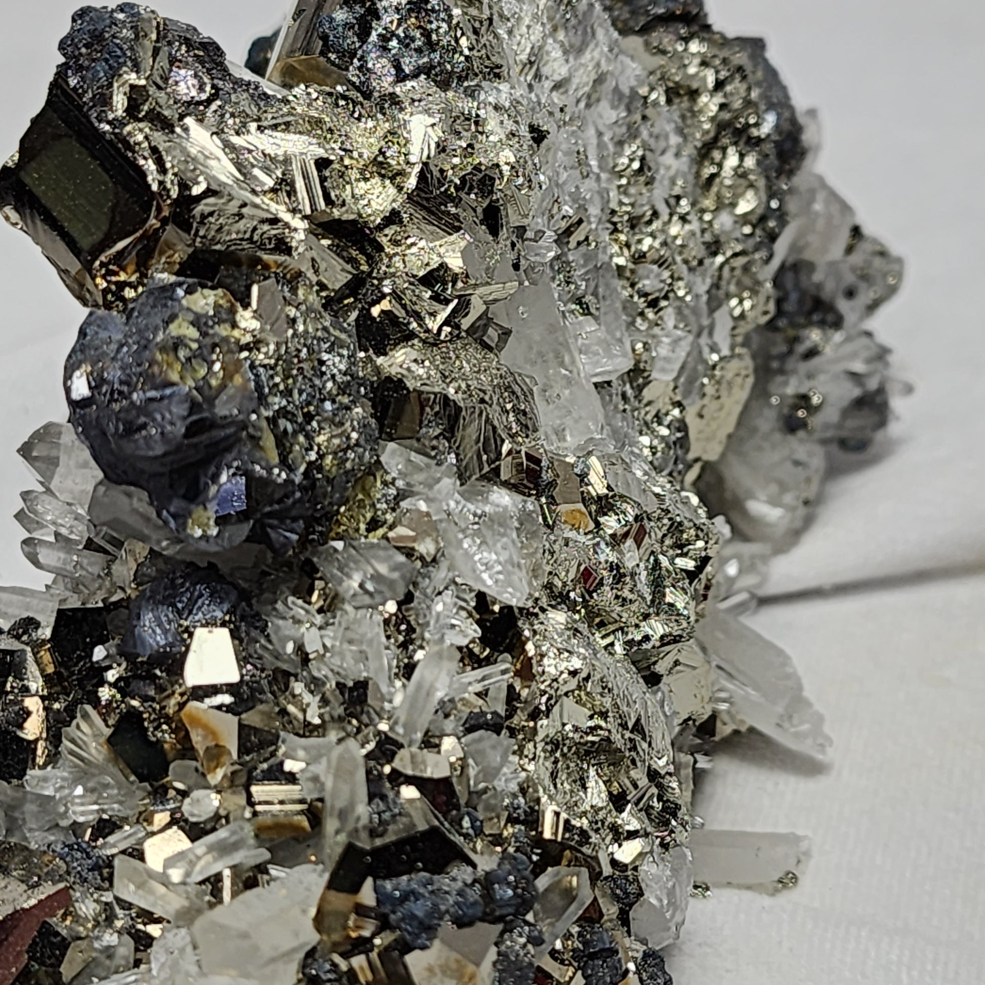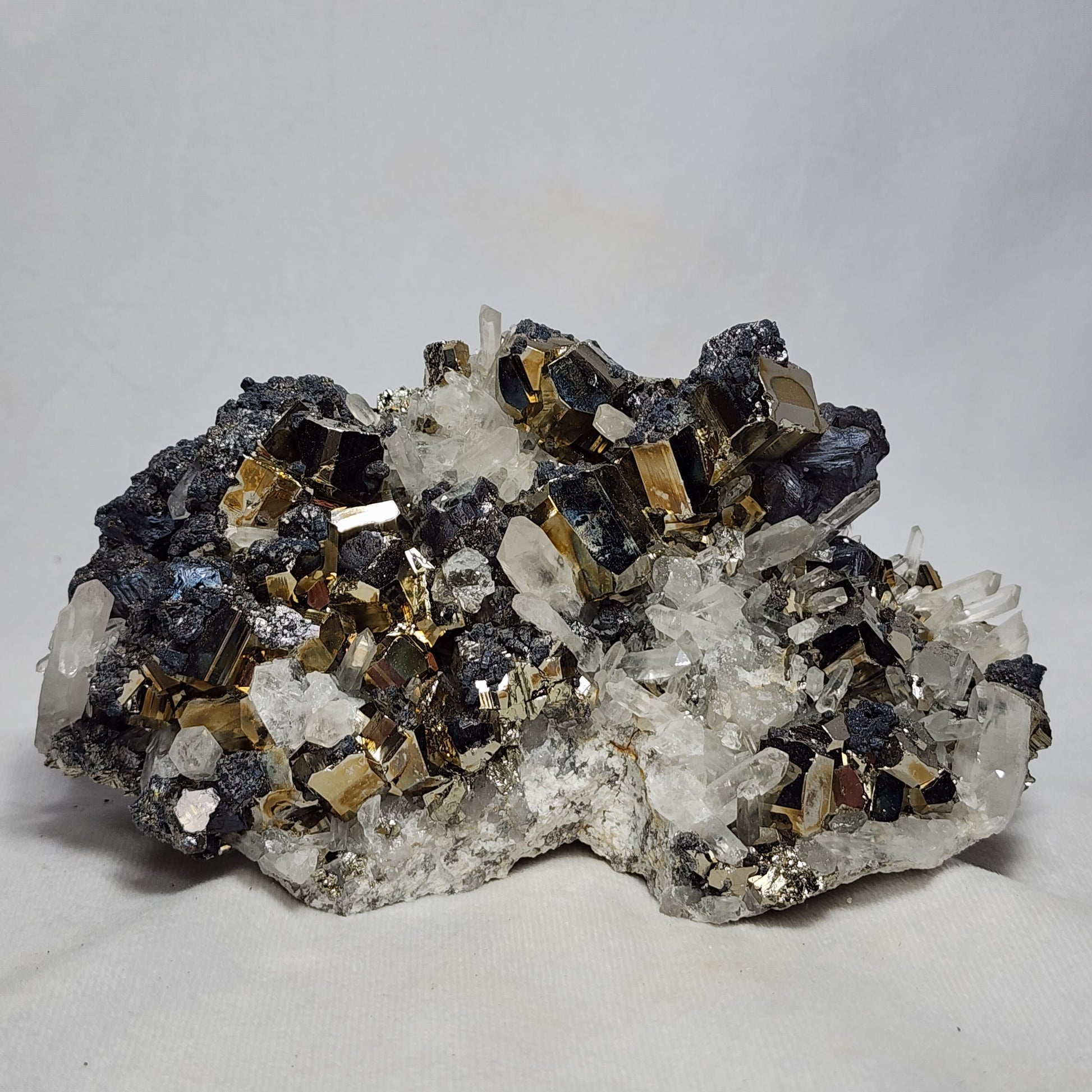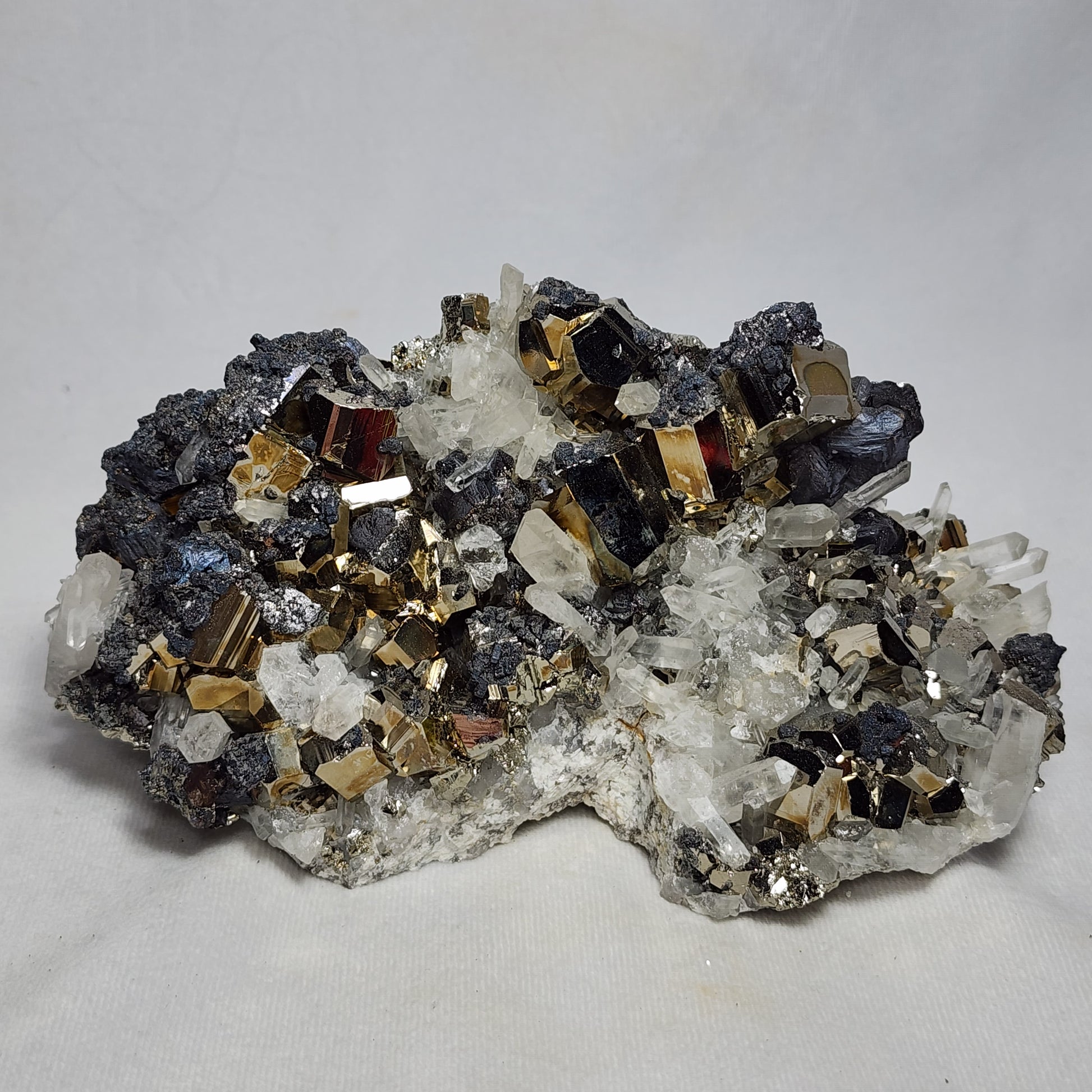 This remarkable specimen is pyrite on quartz. This particular piece has several sparkling, rainbow pyrite cubes, a few Galena chunks and crisp, clear Quartz points of various sizes.