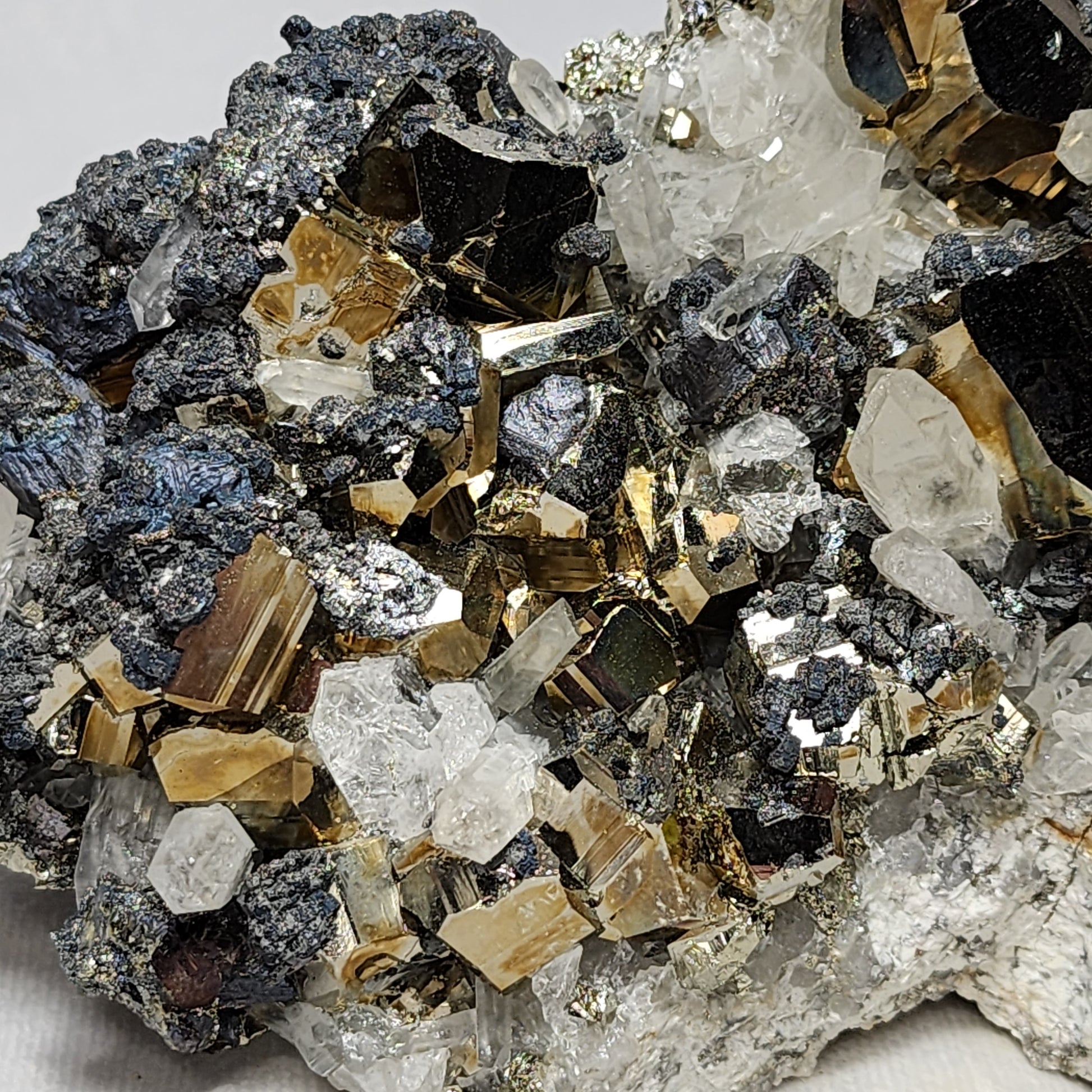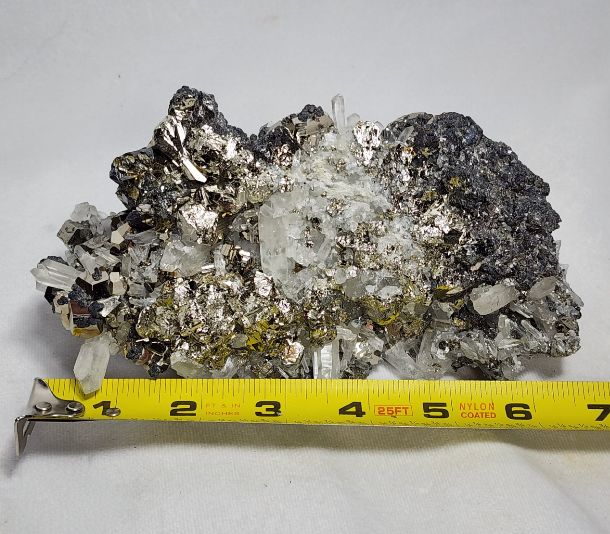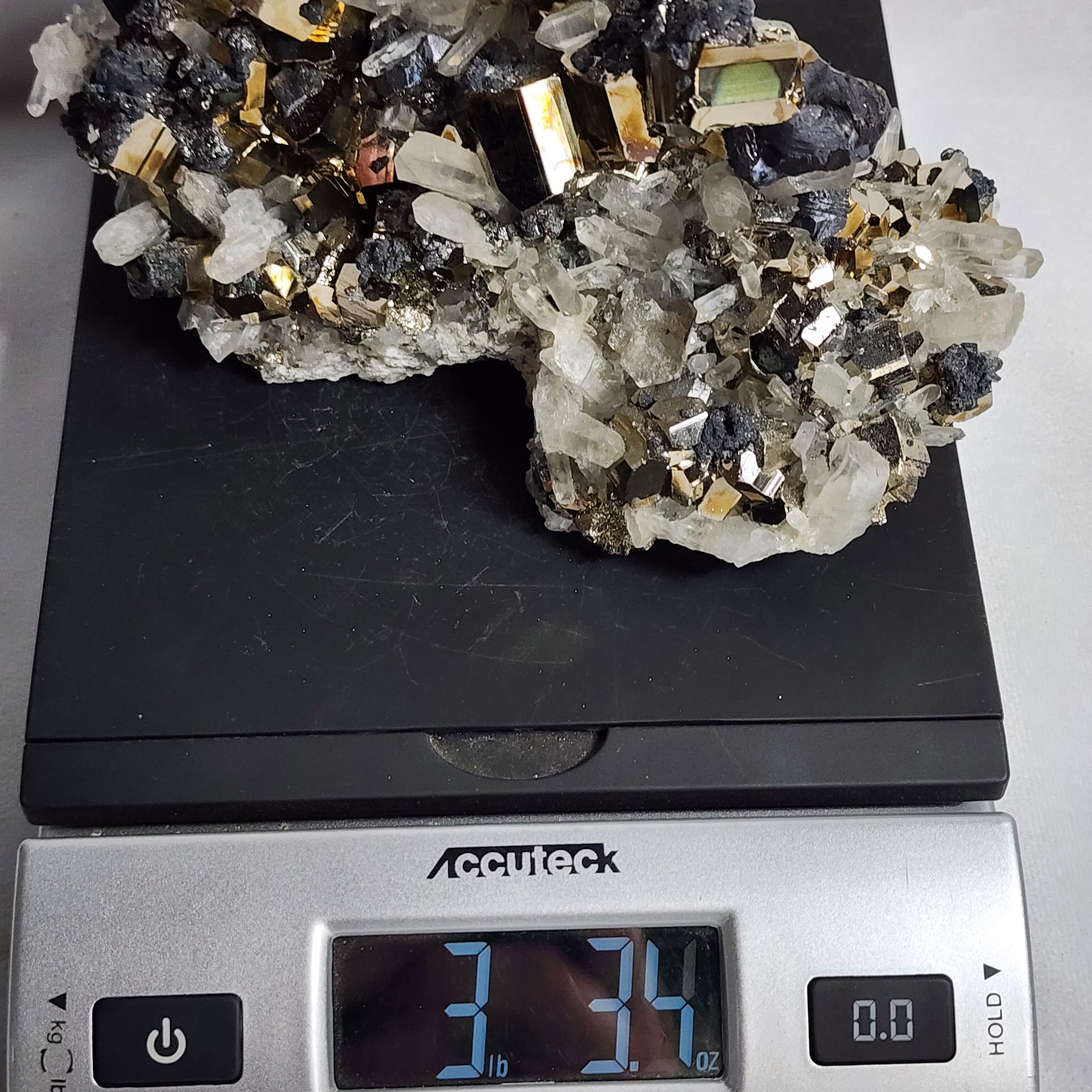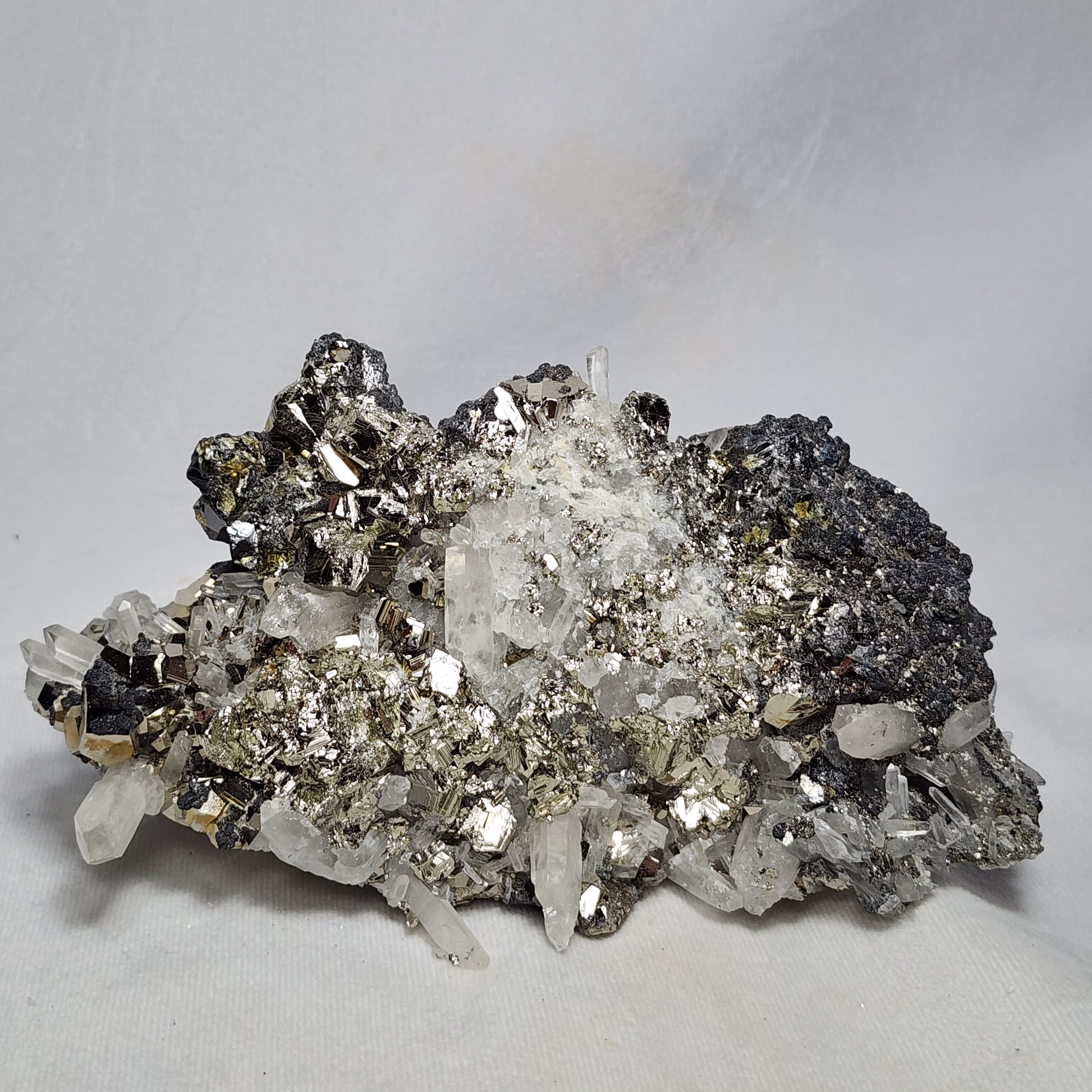 This remarkable specimen is pyrite on quartz. This particular piece has several sparkling, rainbow pyrite cubes, a few Galena chunks and crisp, clear Quartz points of various sizes.