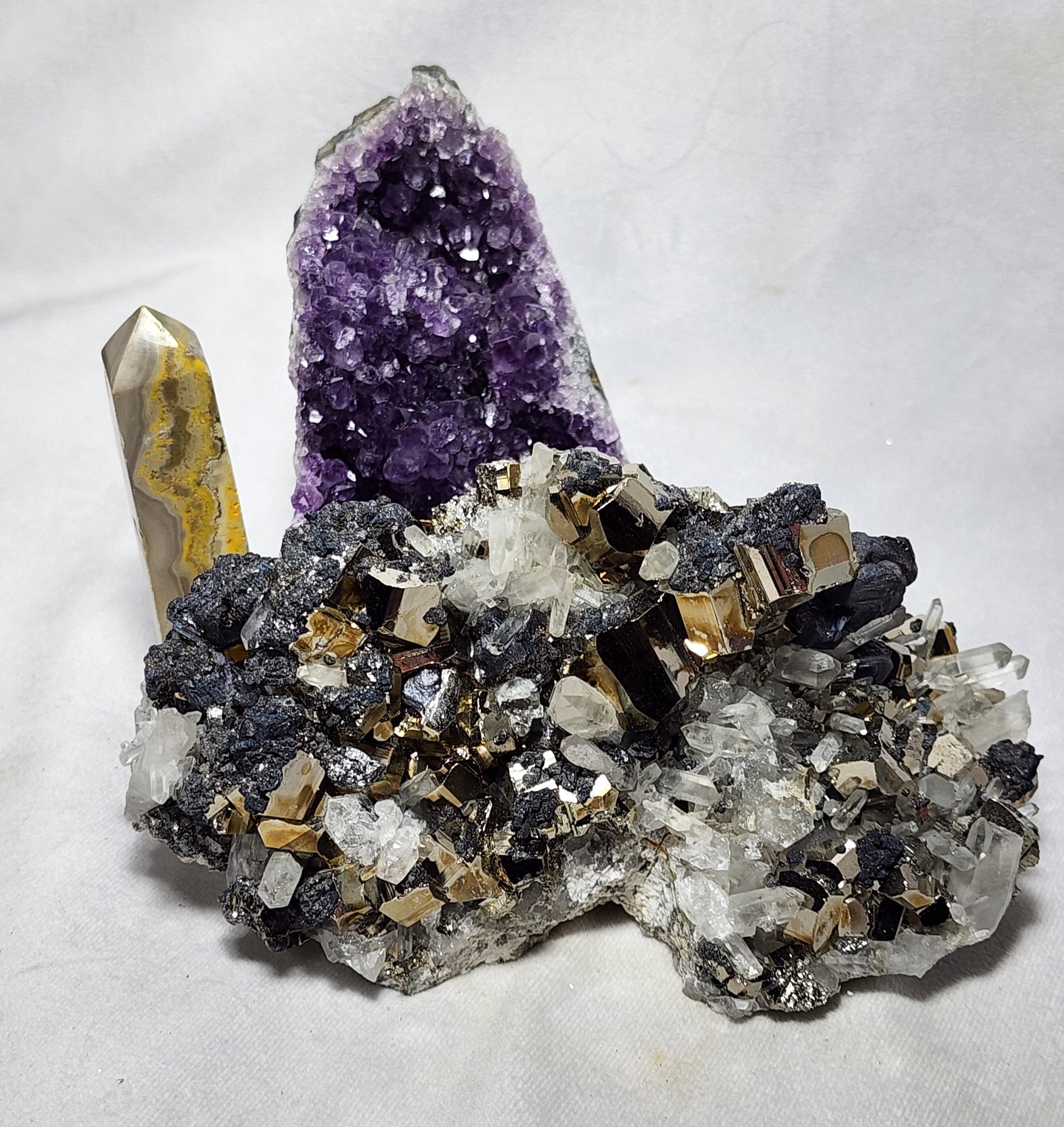 Pyrite on quartz looks amazing on it's own or paired with our Amethyst and Bumblebee Jasper Tower.