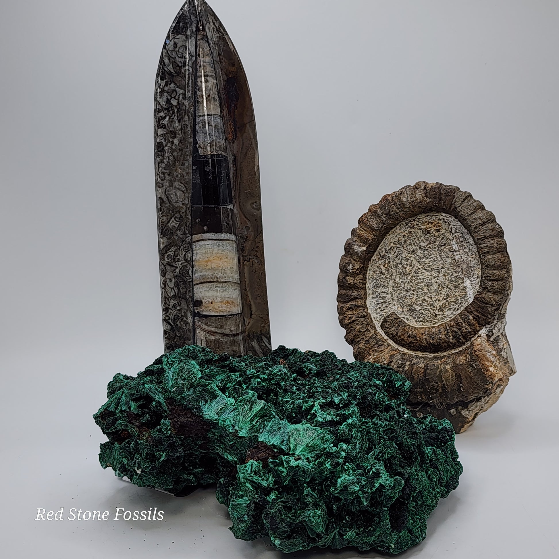 This piece is just fascinating on display alone, but also pairs nicely with our Anetoceras Heteromorph and Orthoceras Single!