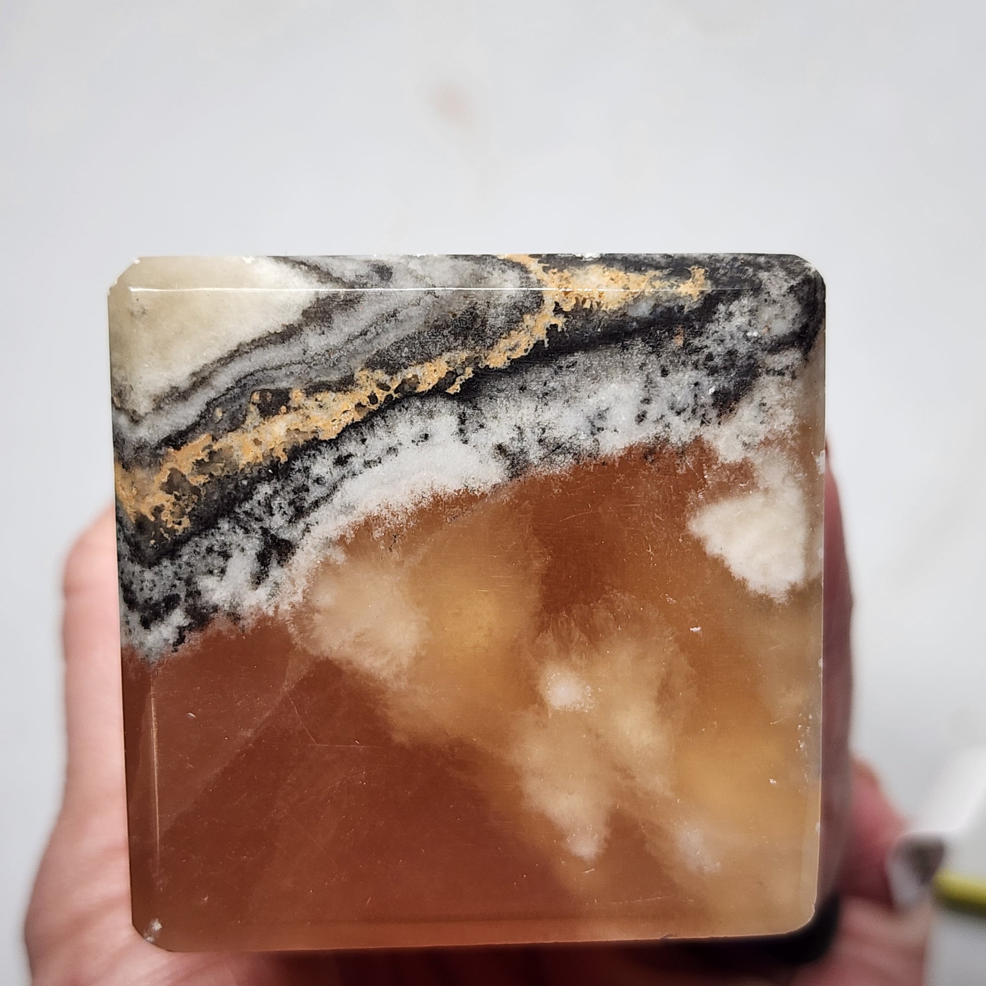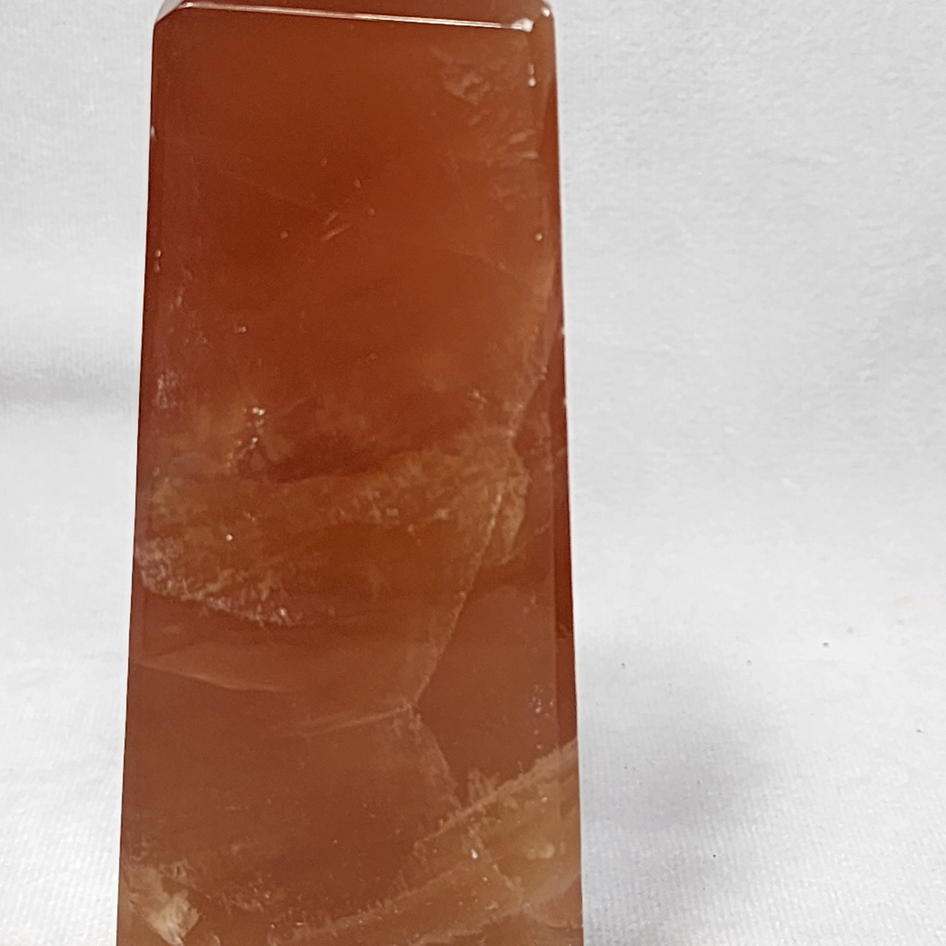 This Calcite tower has a gorgeous "rusted honey" color! Looking closely you can see several "veins" around the tower and a stunning black and white calcite band on the bottom!