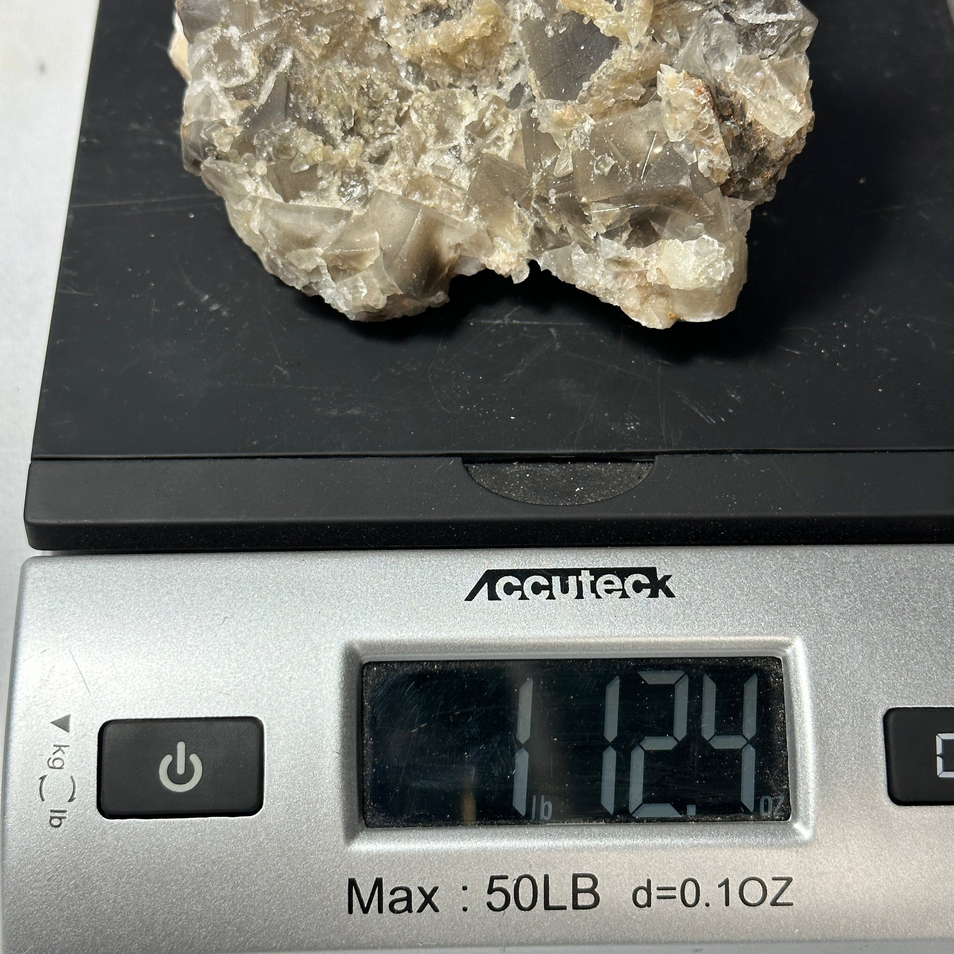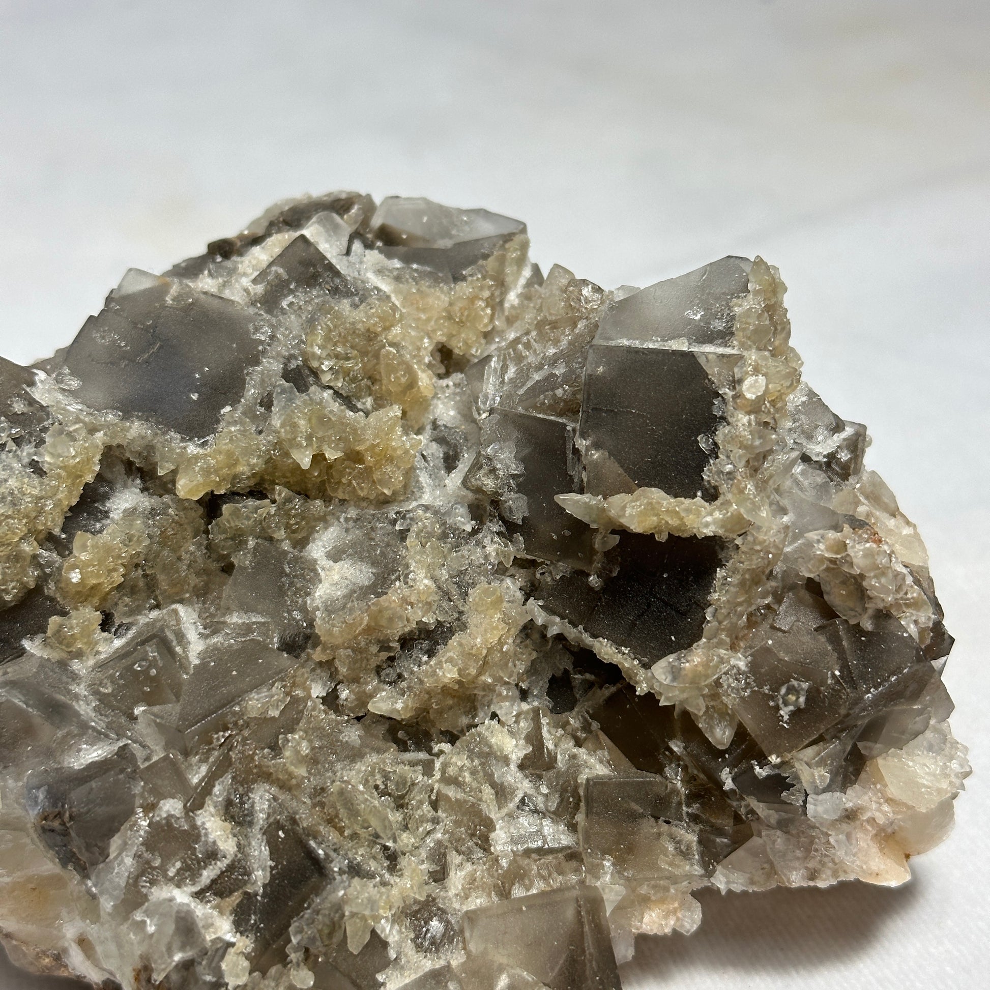 This Fluorite and Dogtooth specimen is stunning! It has many gray cubed layers as well as several small Dogtooth Calcite shards around it!