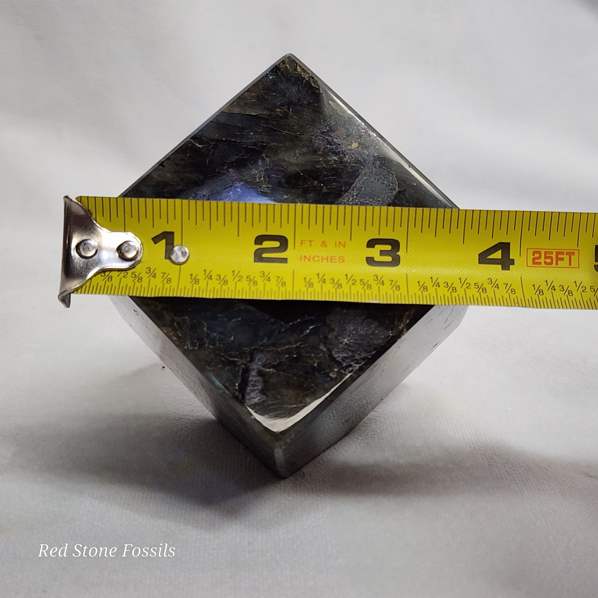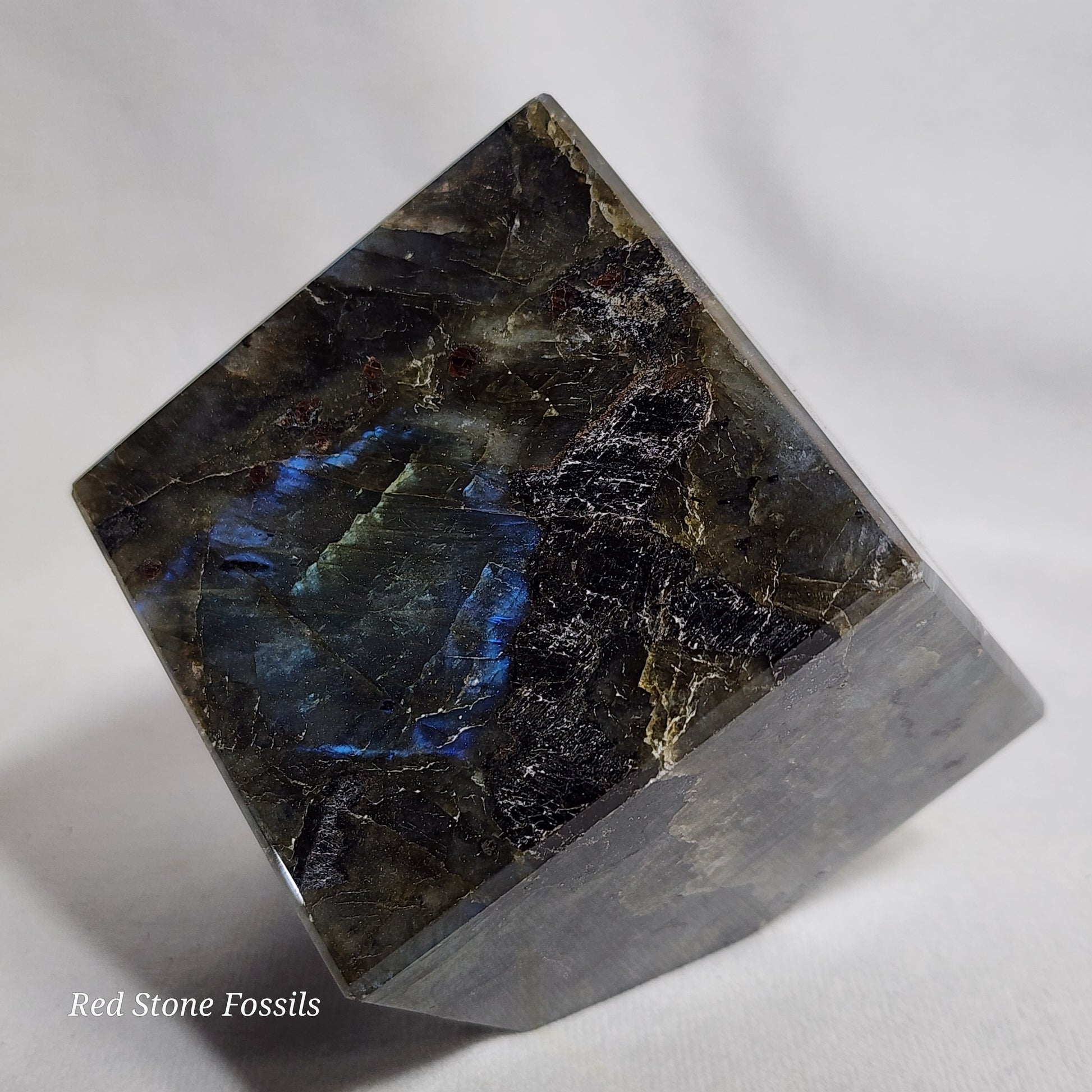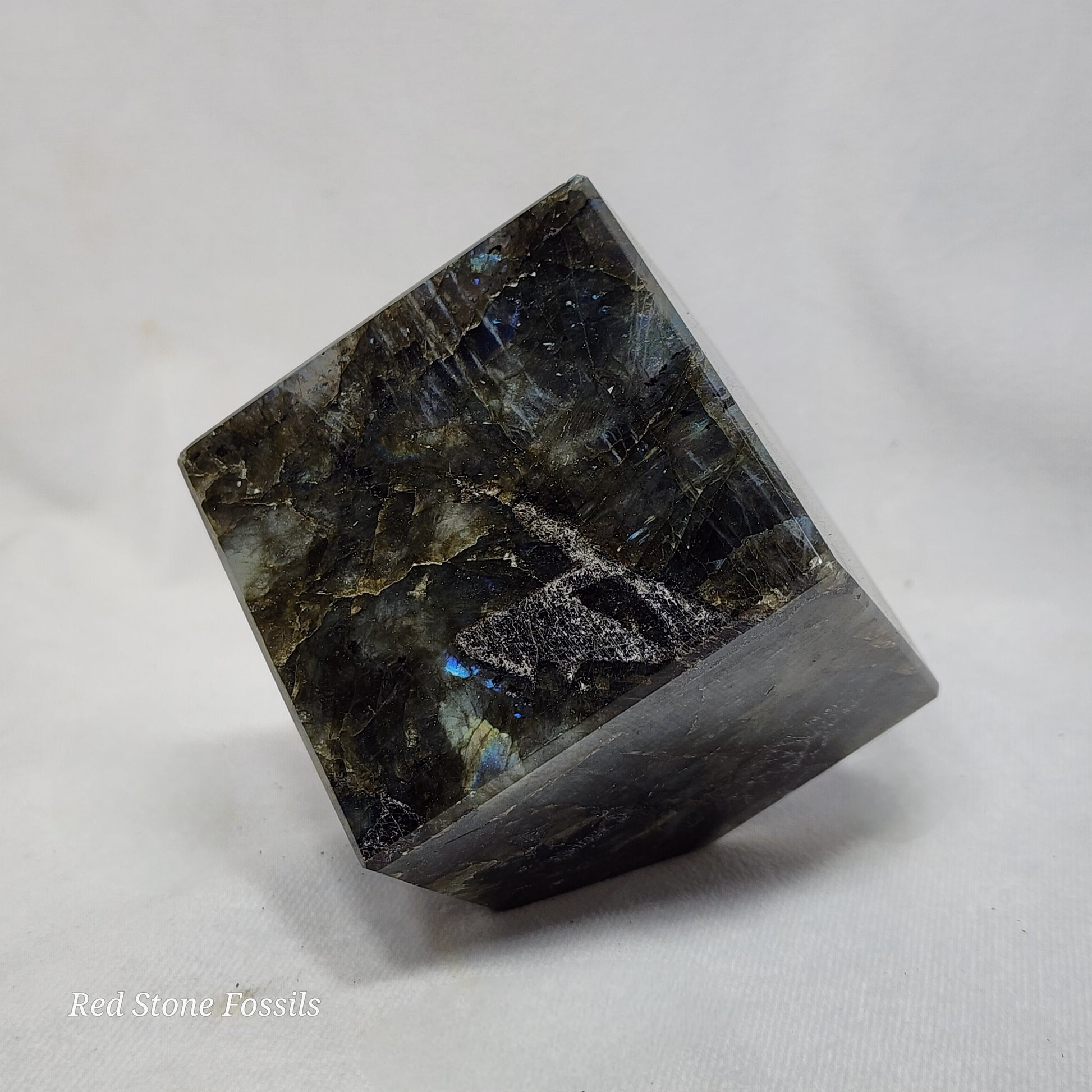 This particular specimen is a Labradorite Cube with one corner shaved to stand on its own! This is the perfect mineral to display on the desk or entry table!