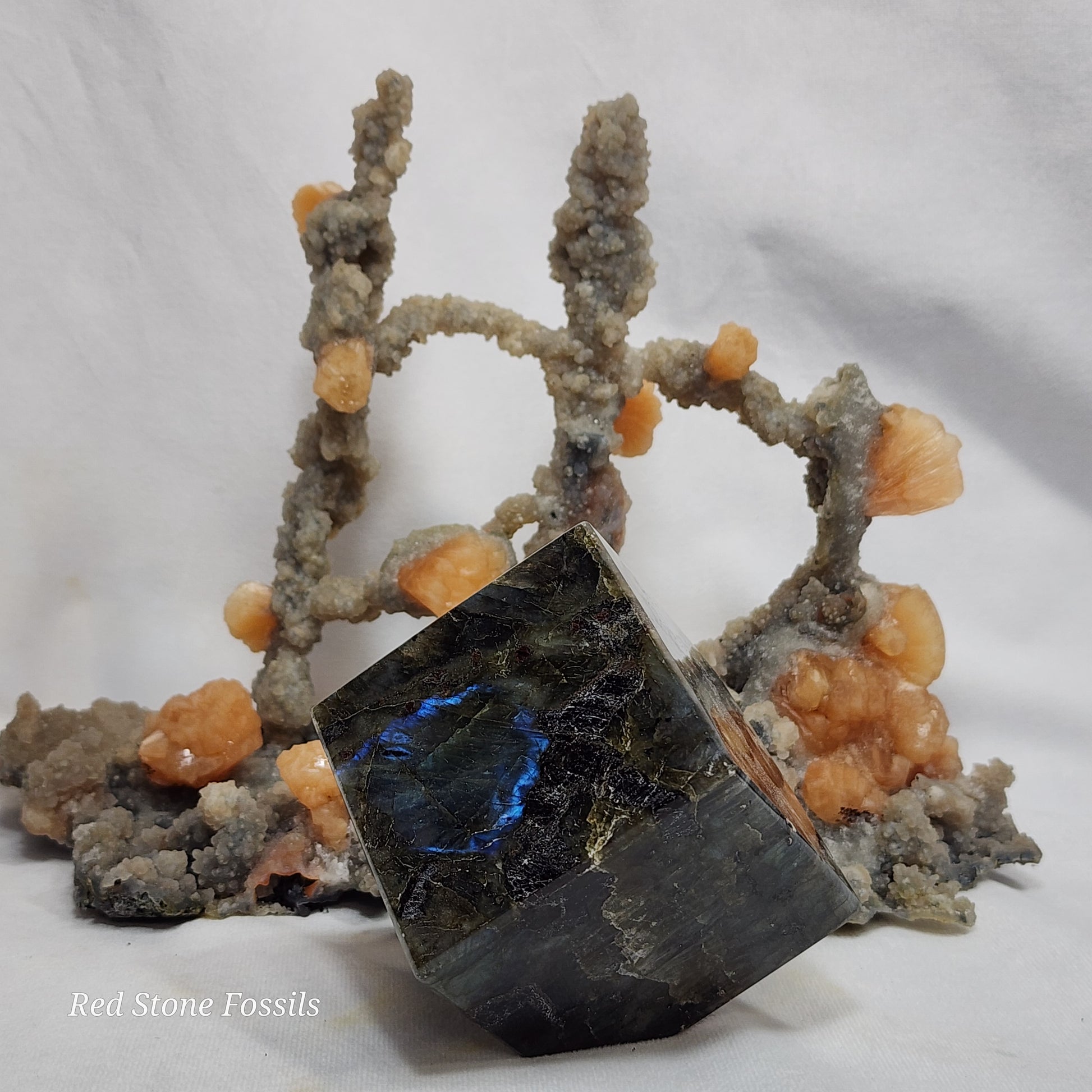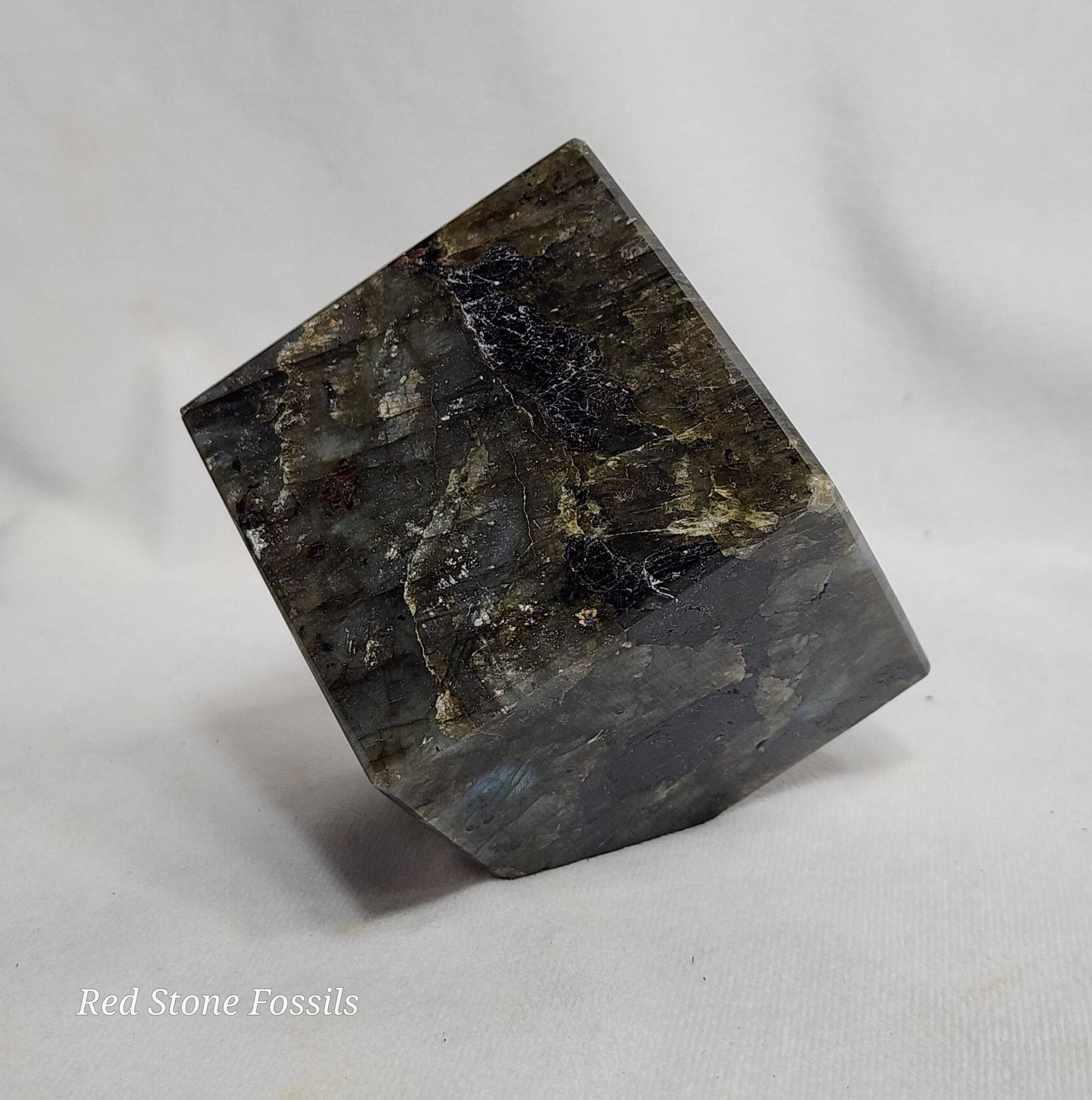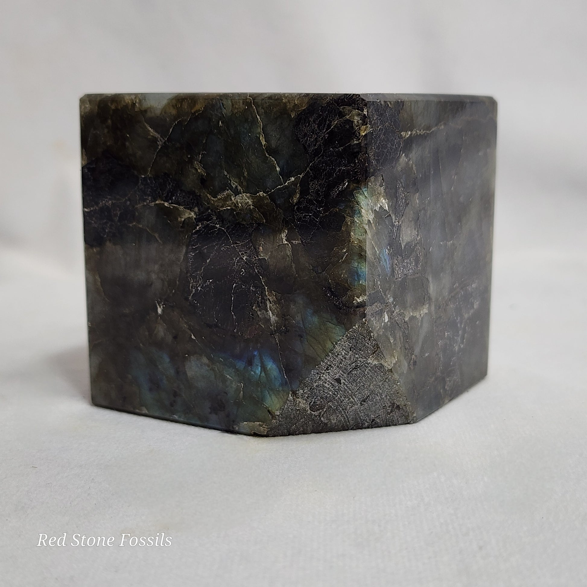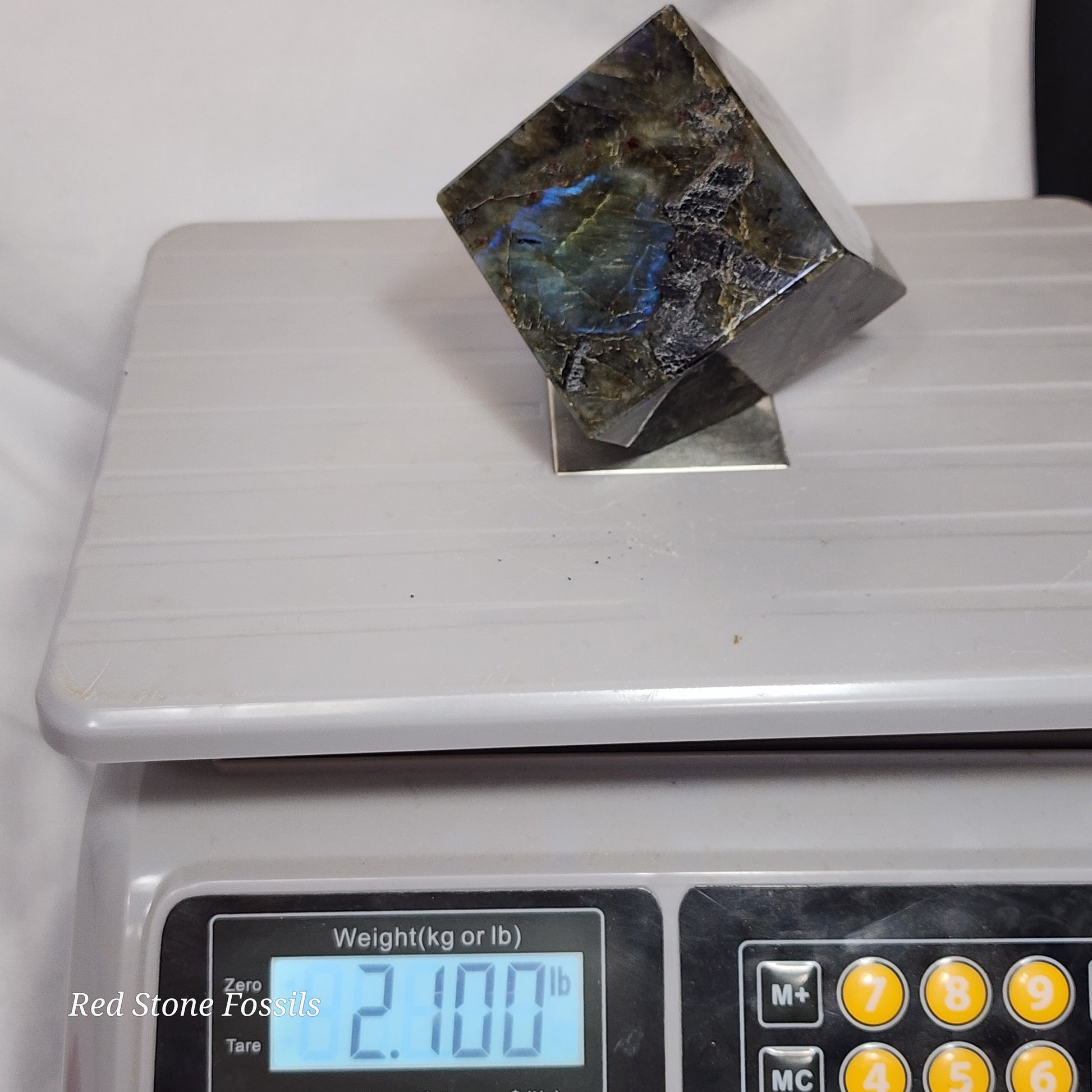 This particular specimen is a Labradorite Cube with one corner shaved to stand on its own! This is the perfect mineral to display on the desk or entry table!