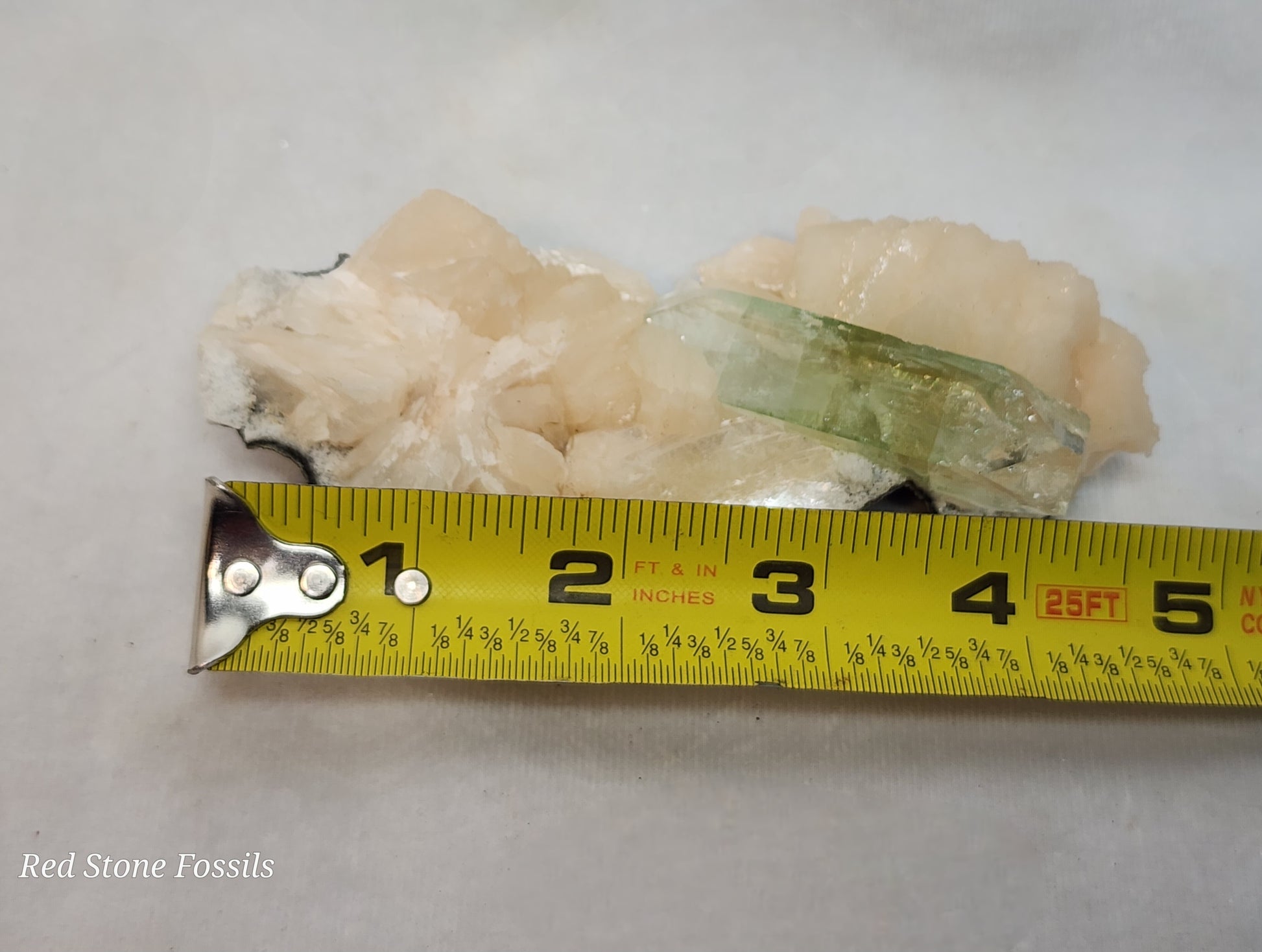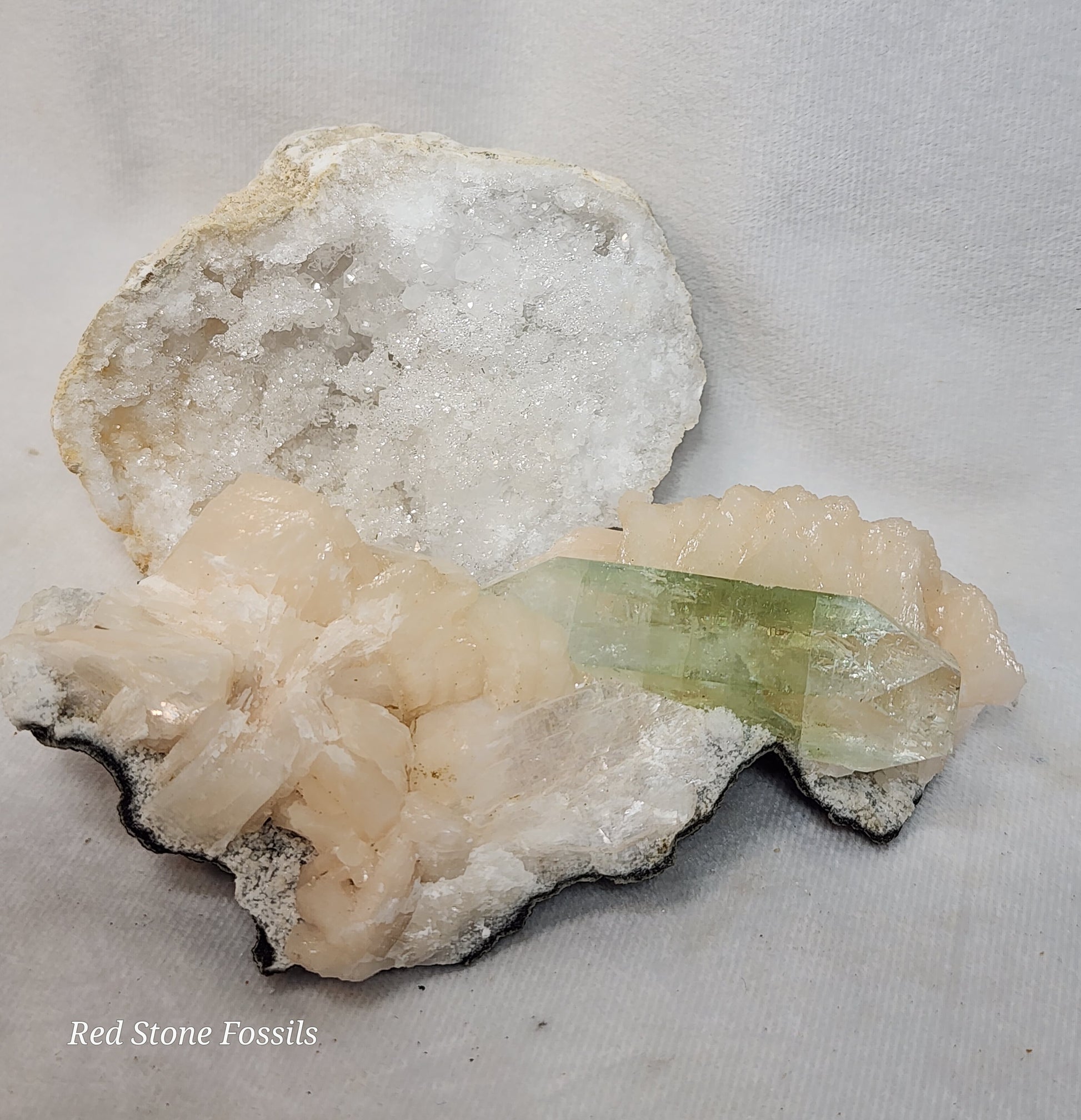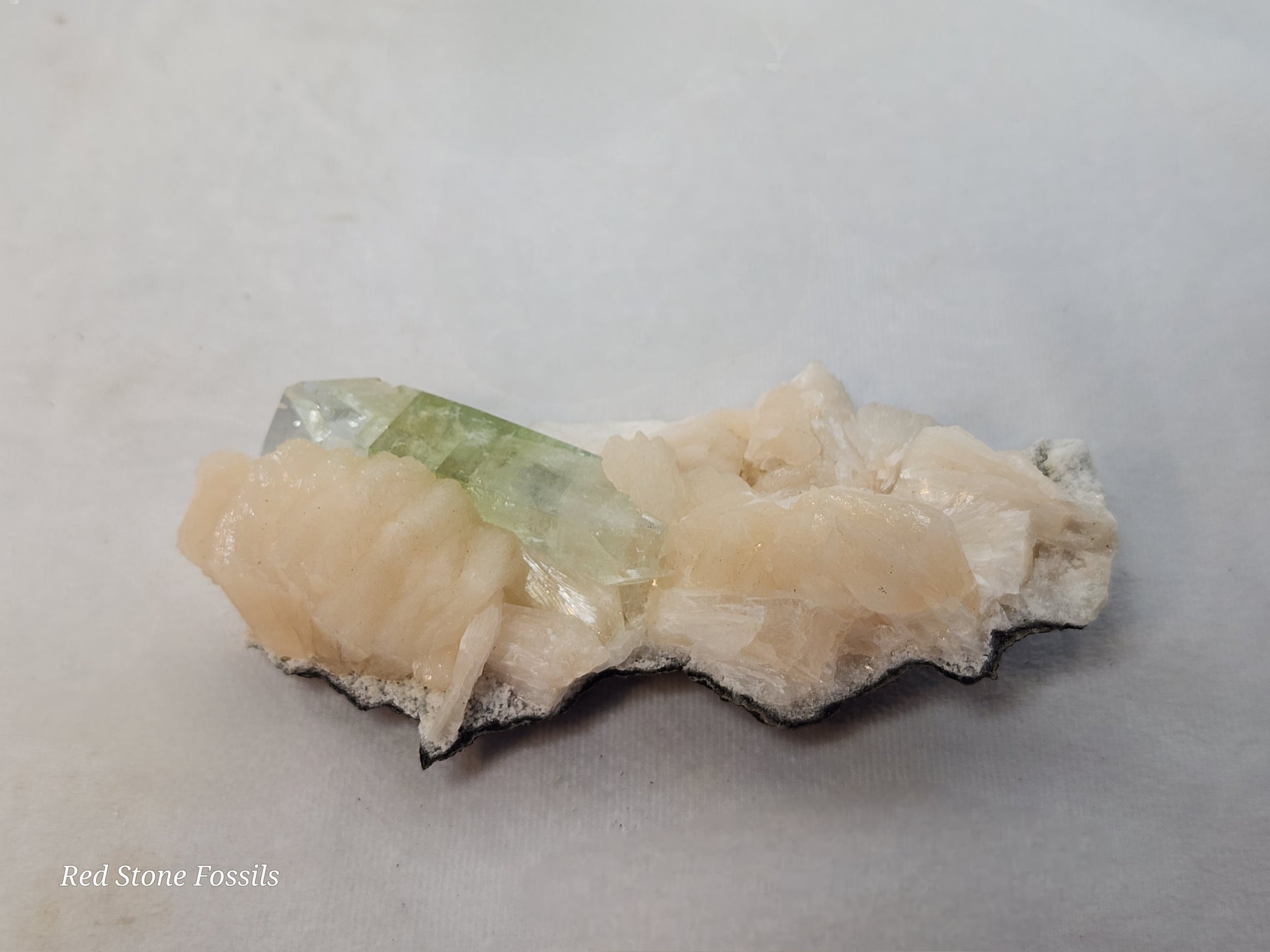 This very unique specimen from India has stunning peach-pink Stilbite next to a gorgeous green Apophyllite crystal point!