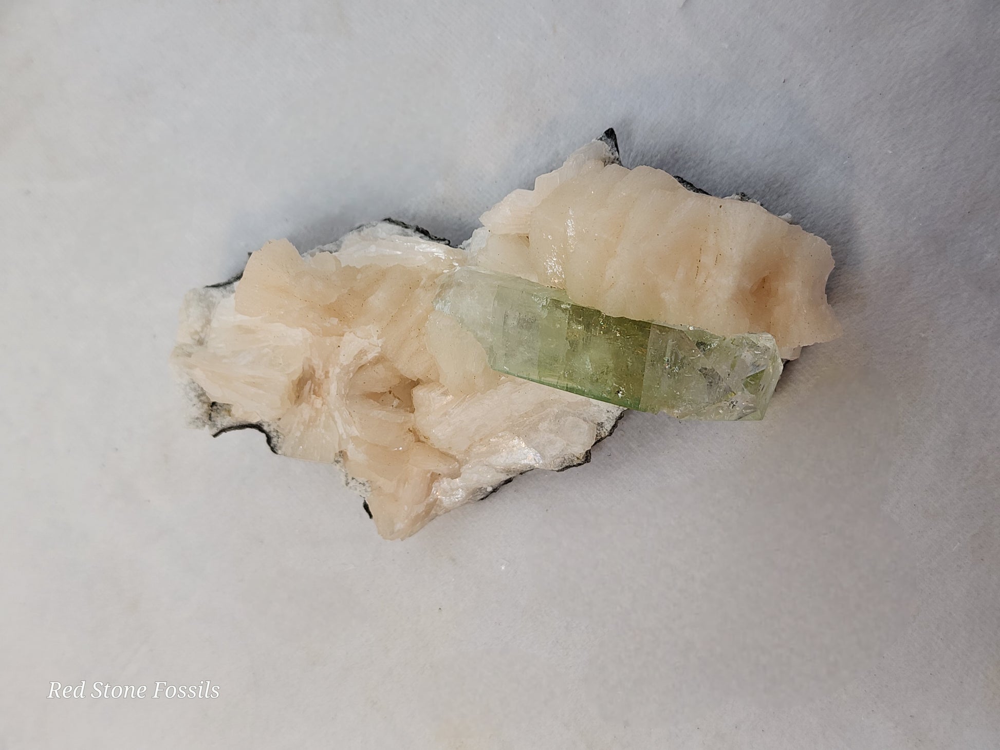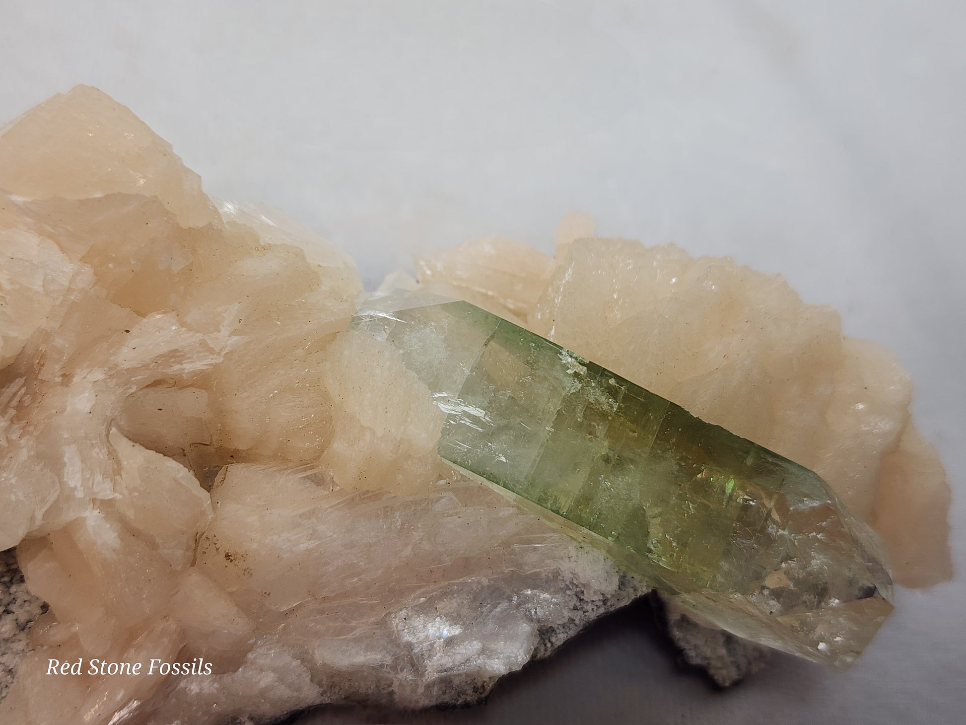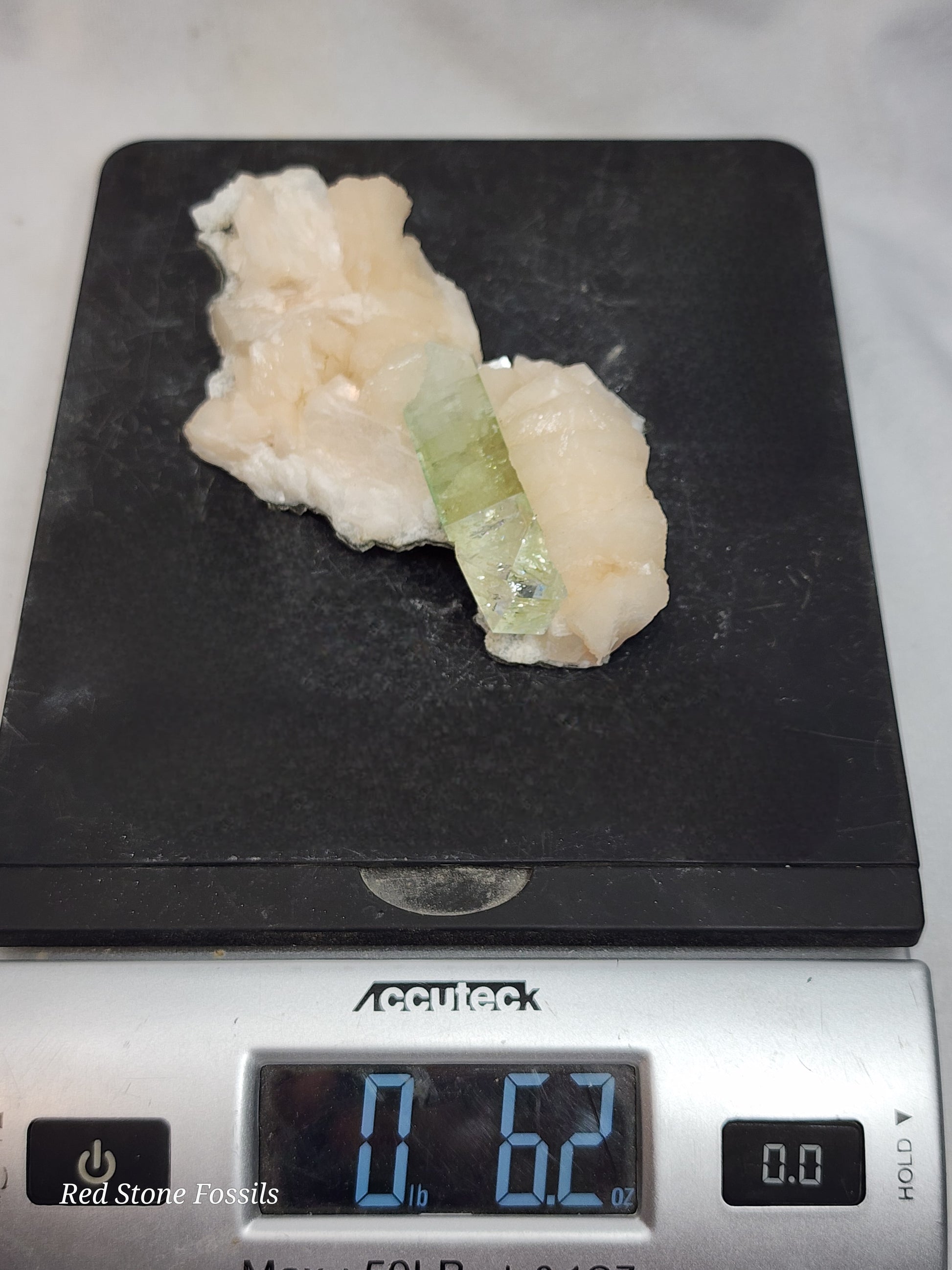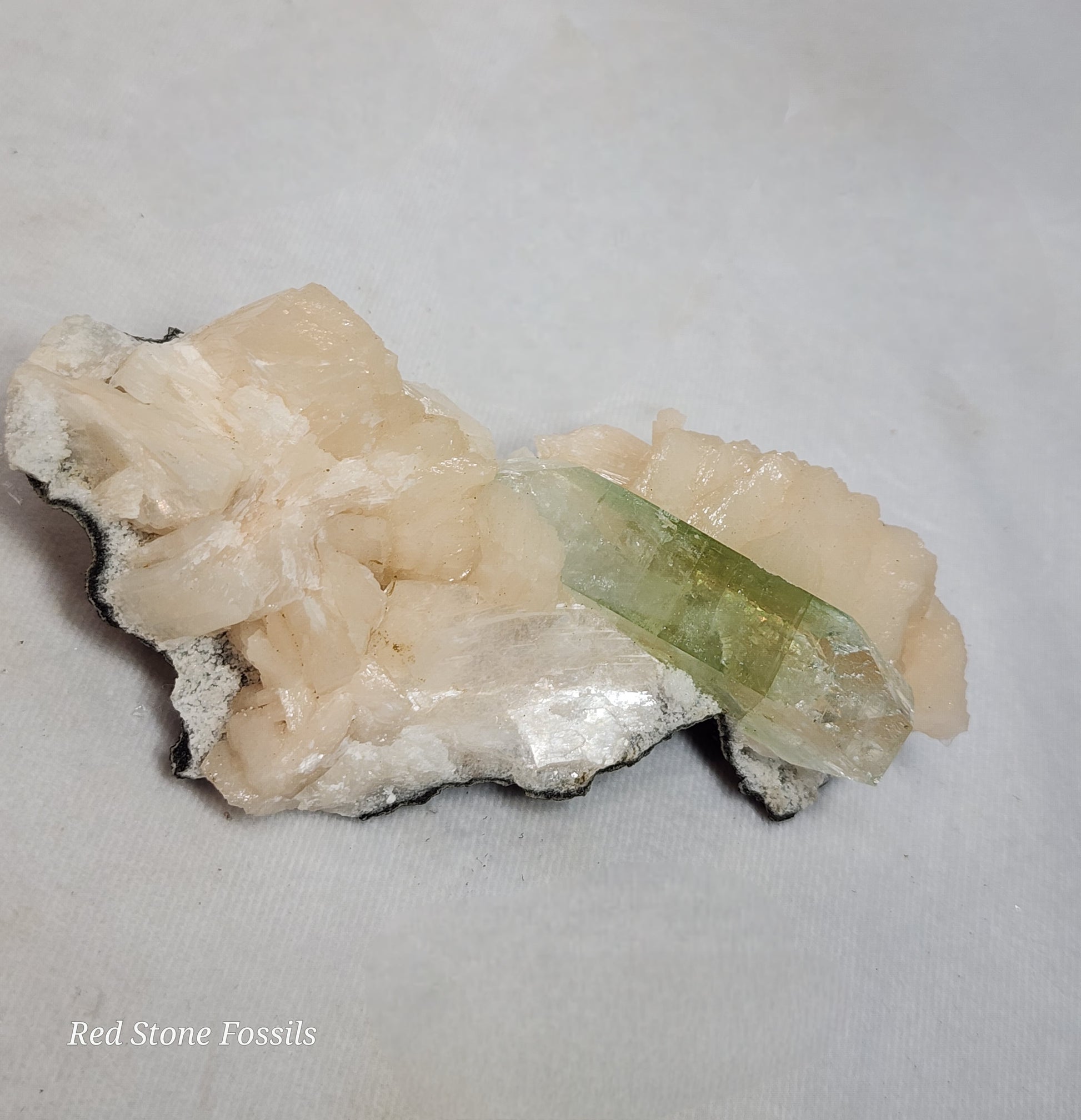 This very unique specimen from India has stunning peach-pink Stilbite next to a gorgeous green Apophyllite crystal point!