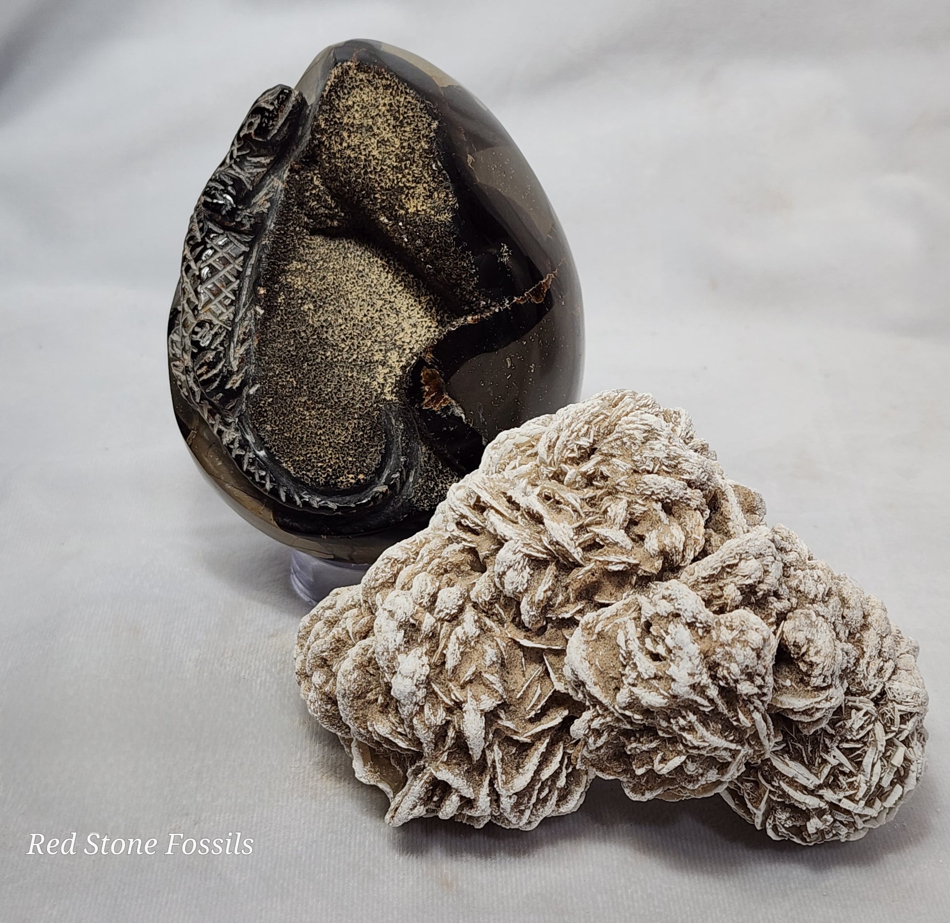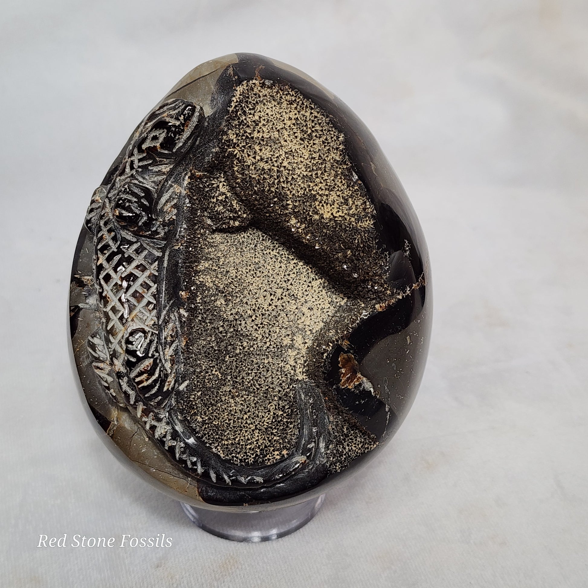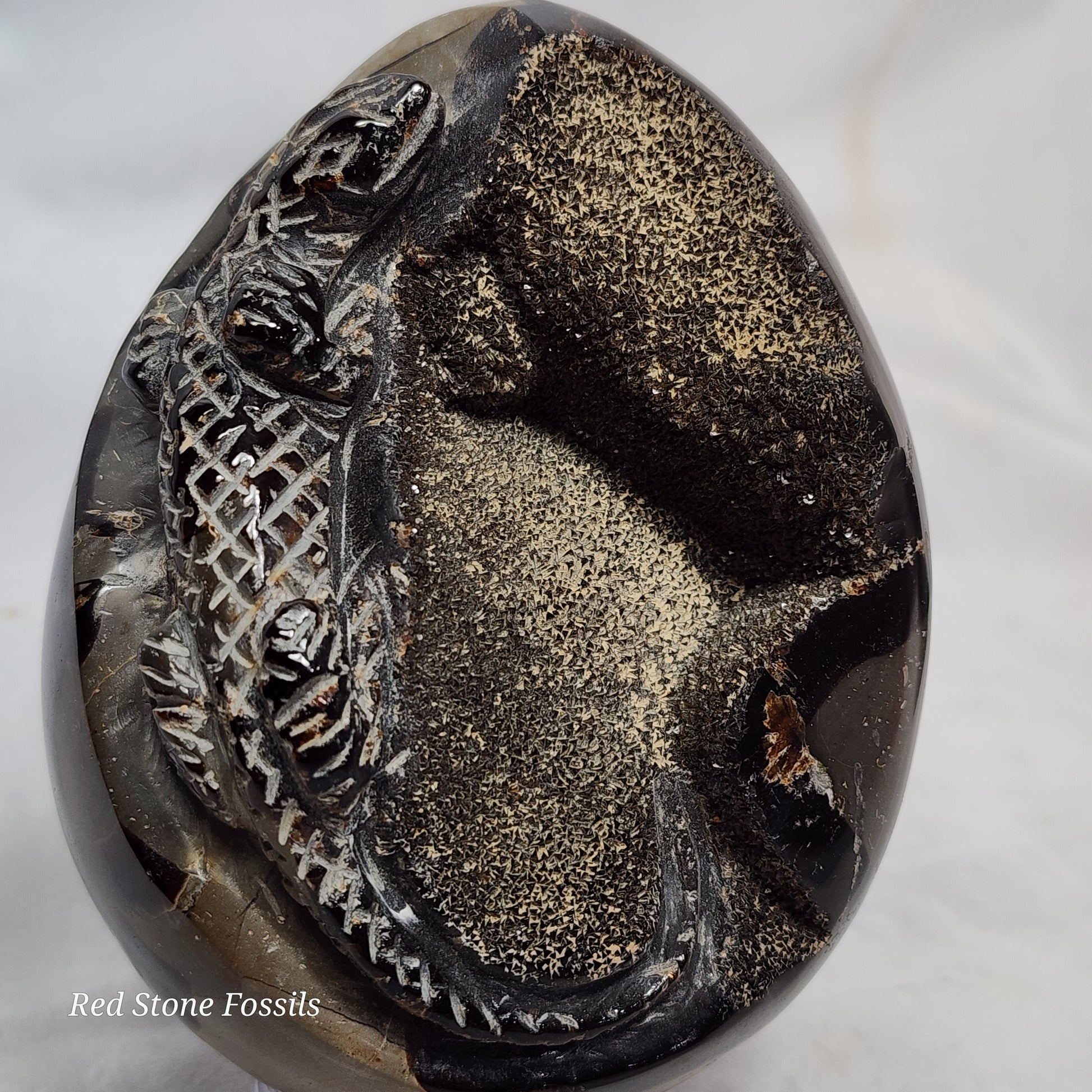 This particular specimen has an amazing lizard carved along the edge of the egg and beautiful druzy black and white crystals inside. Although this egg looks great on a shelf displayed by itself, it also pairs nicely with our Desert Rose!