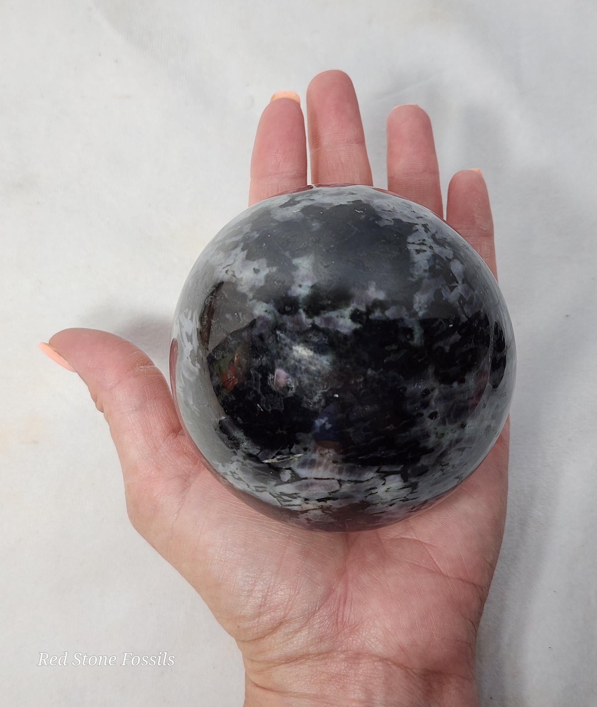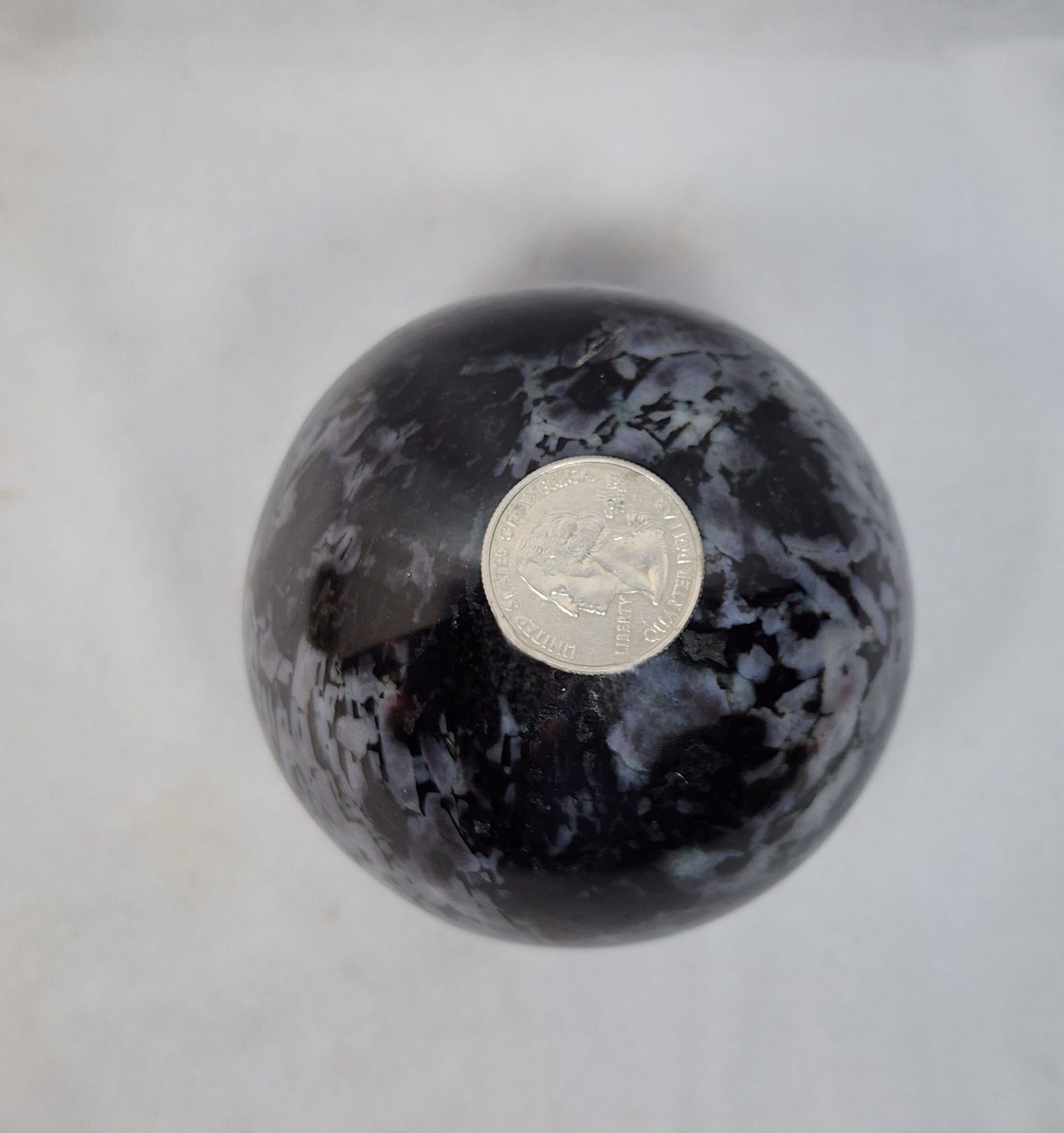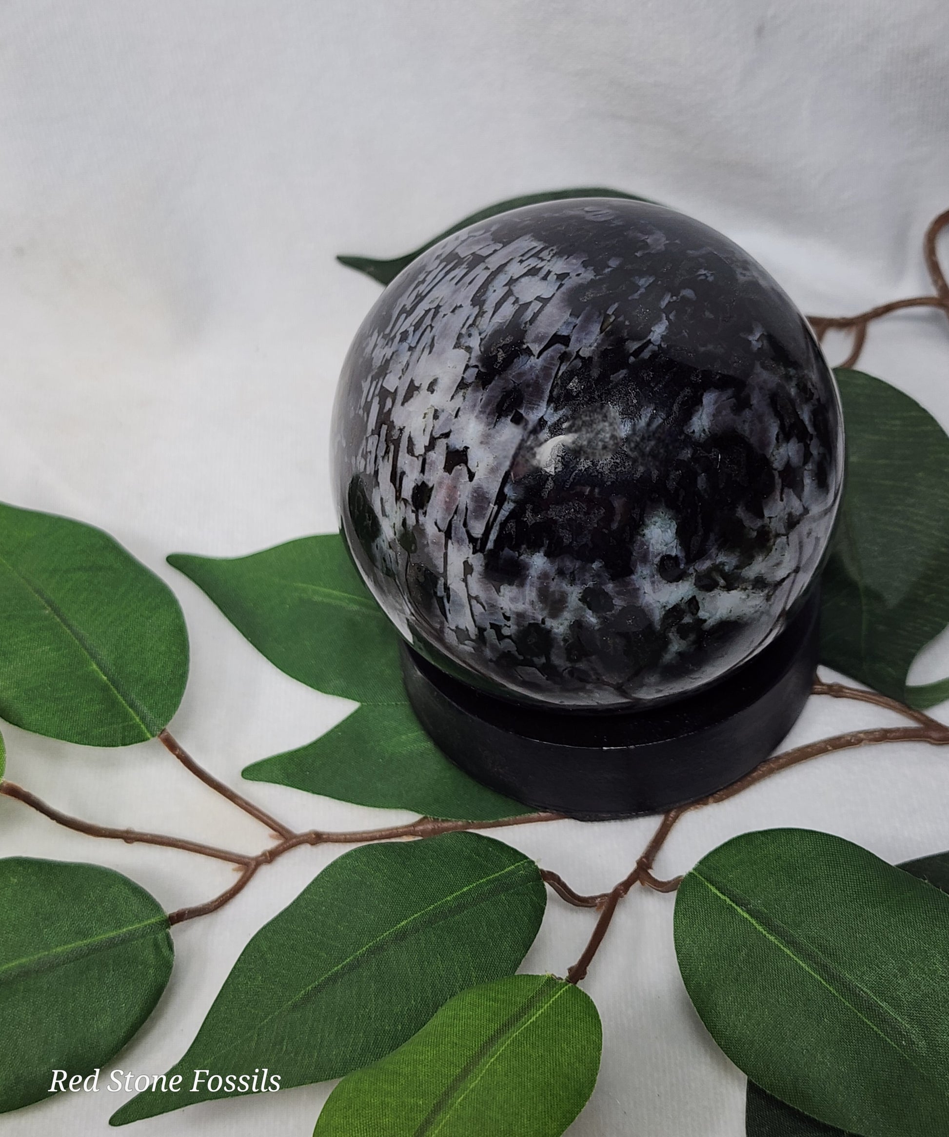This Indigo Gabbro Sphere has a stunning mix of deep indigo, smoky black, and stormy gray! Indigo Gabbro, also known as Merlinite, brings a bold and dramatic display to any collection!