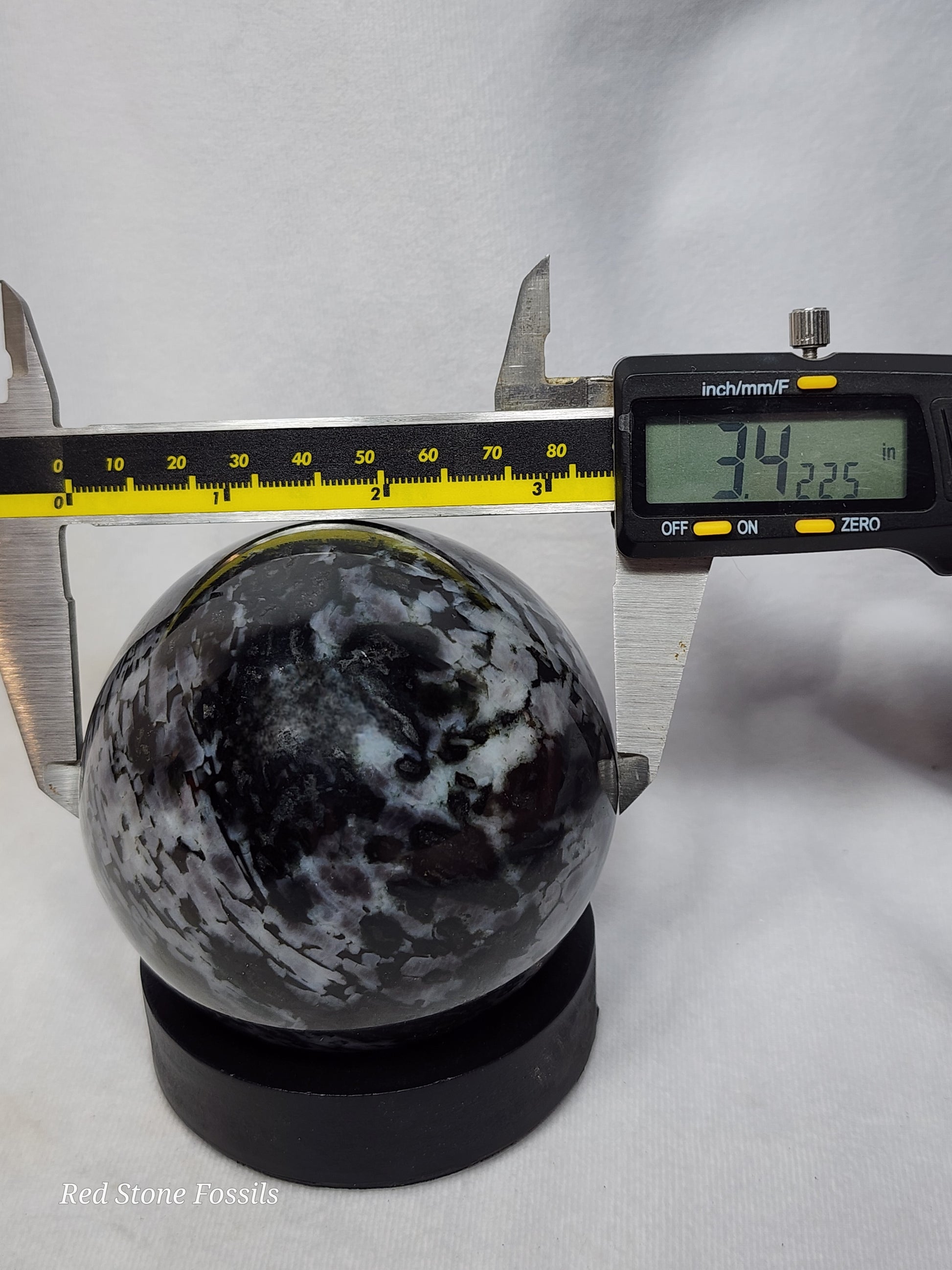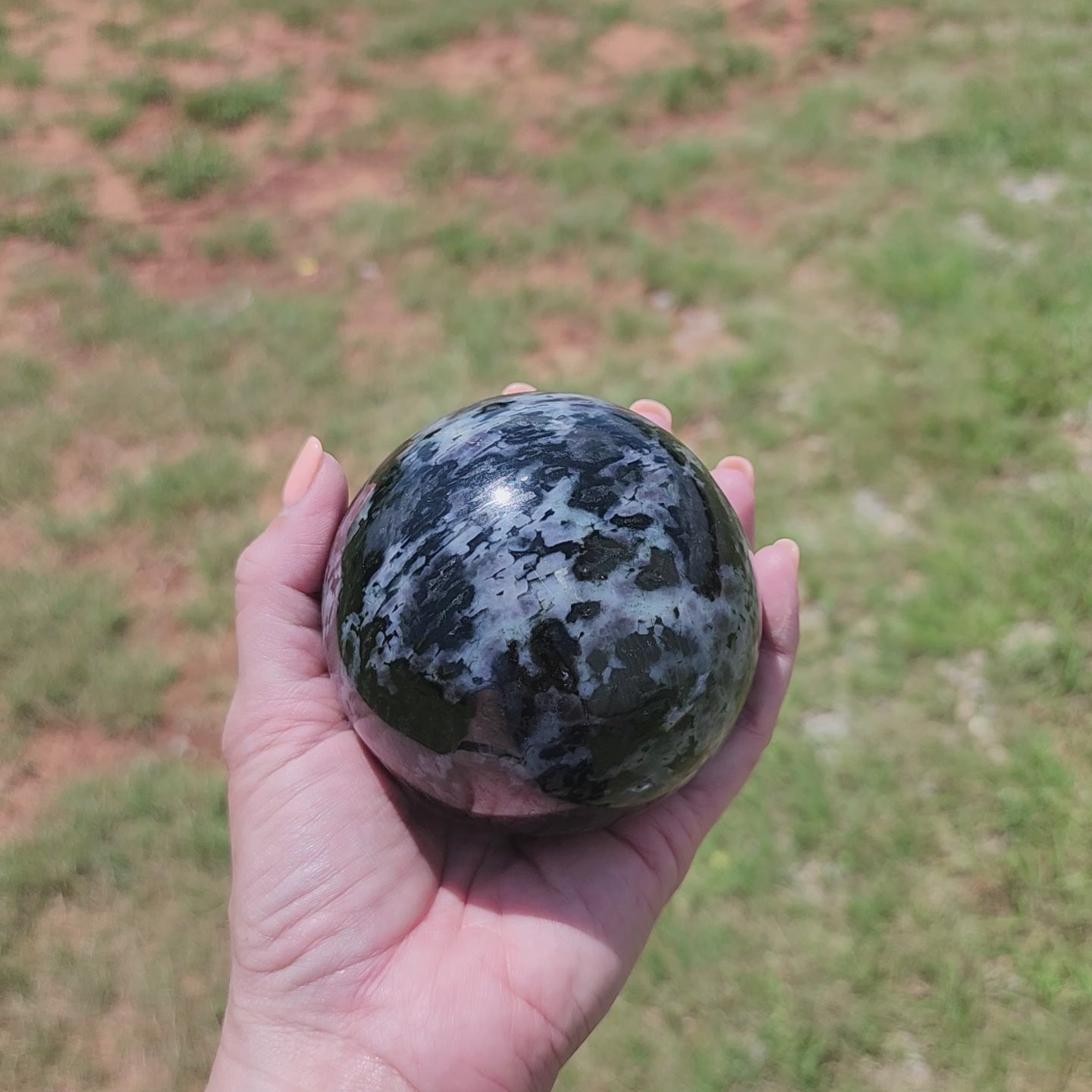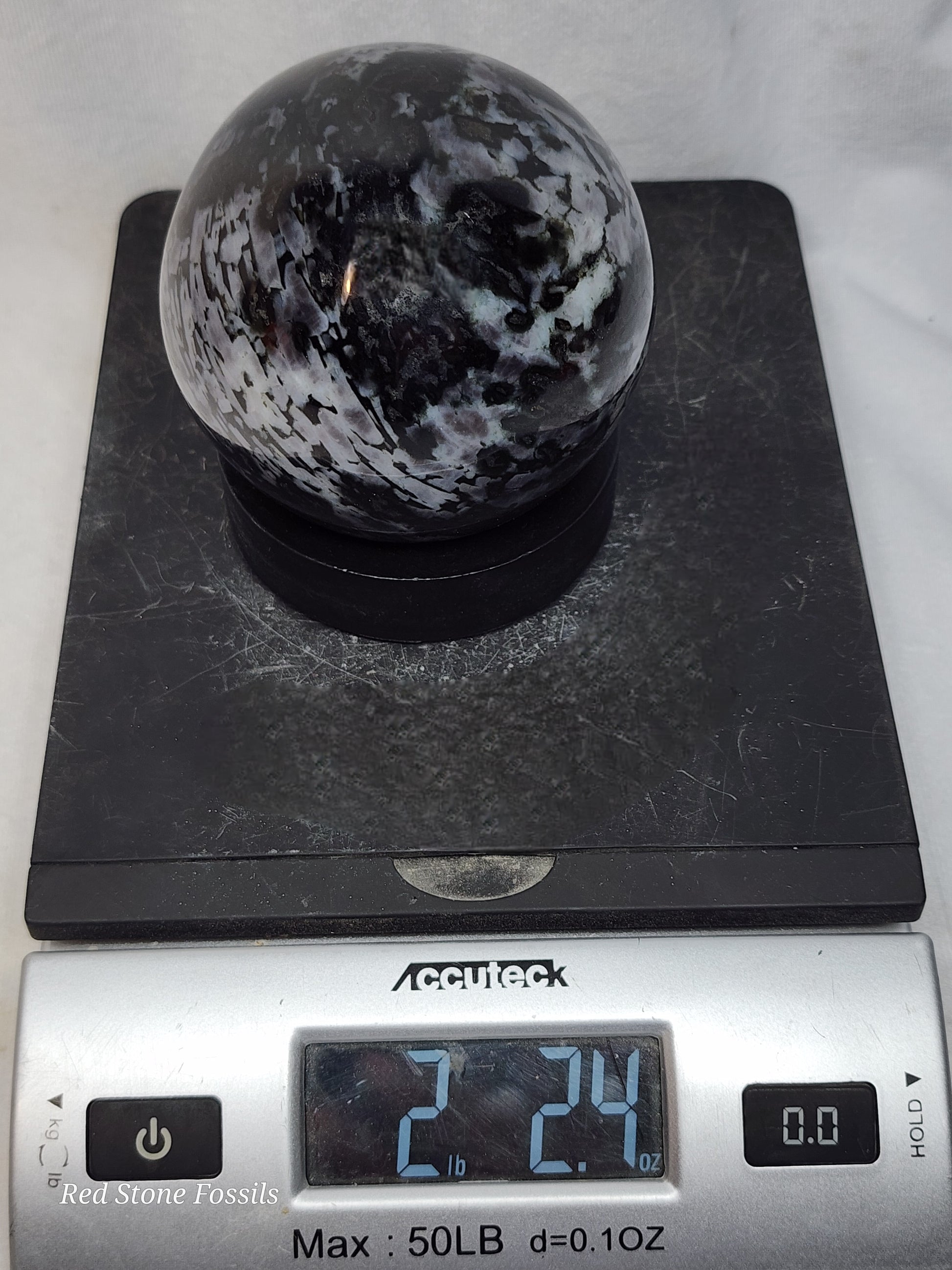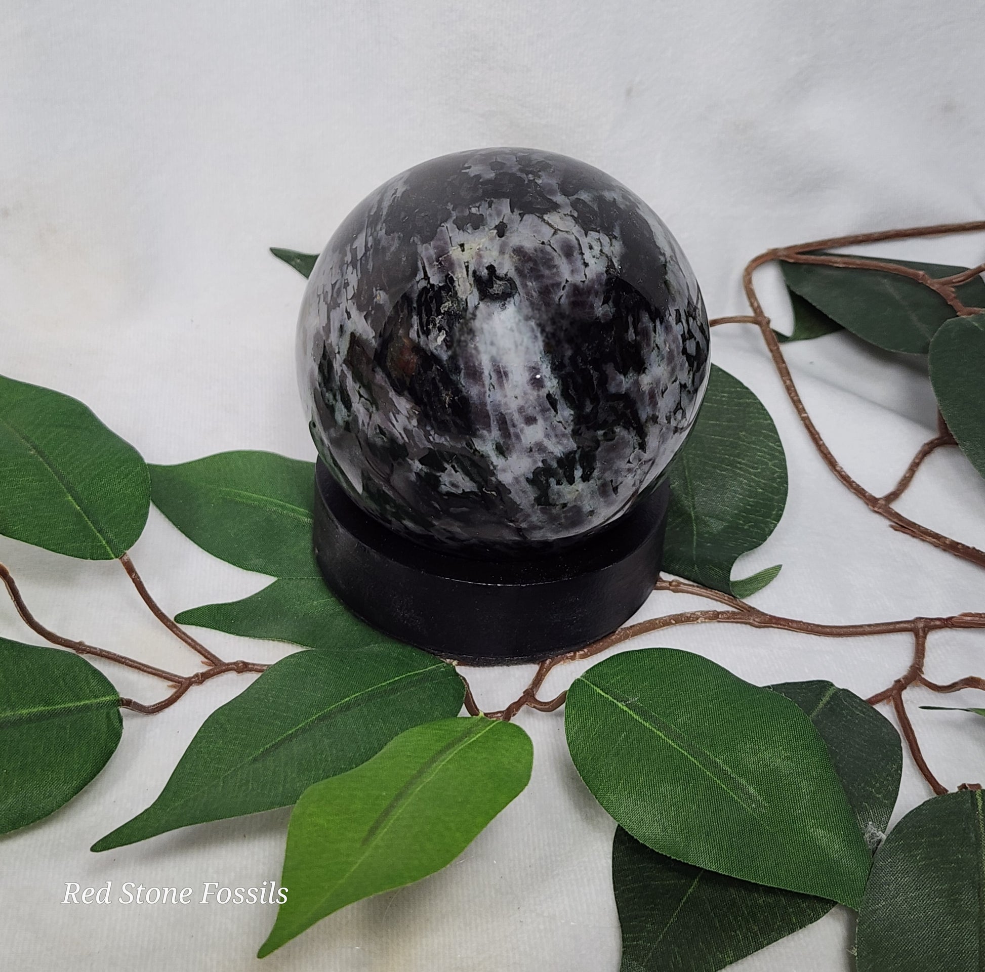 This Indigo Gabbro Sphere has a stunning mix of deep indigo, smoky black, and stormy gray! Indigo Gabbro, also known as Merlinite, brings a bold and dramatic display to any collection!