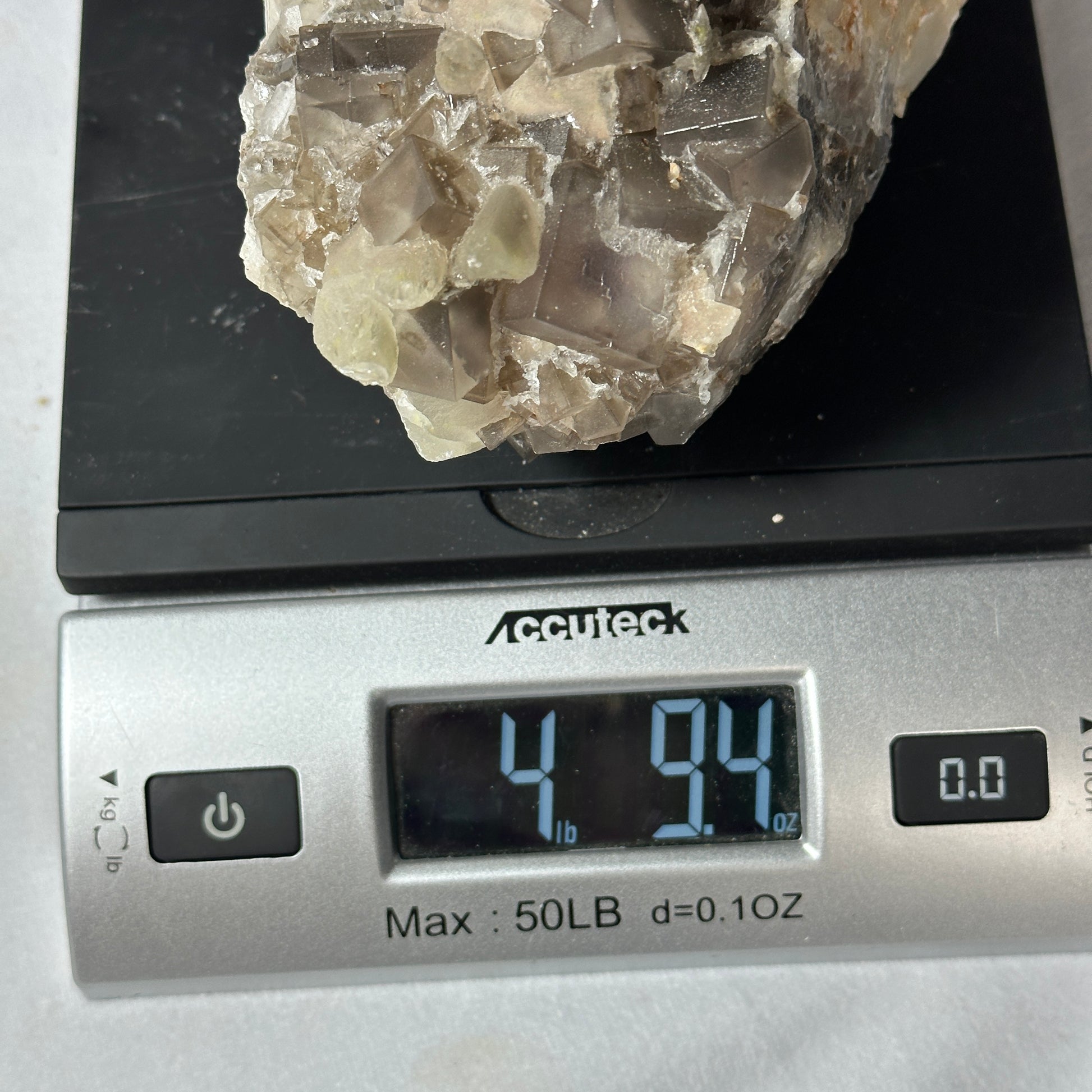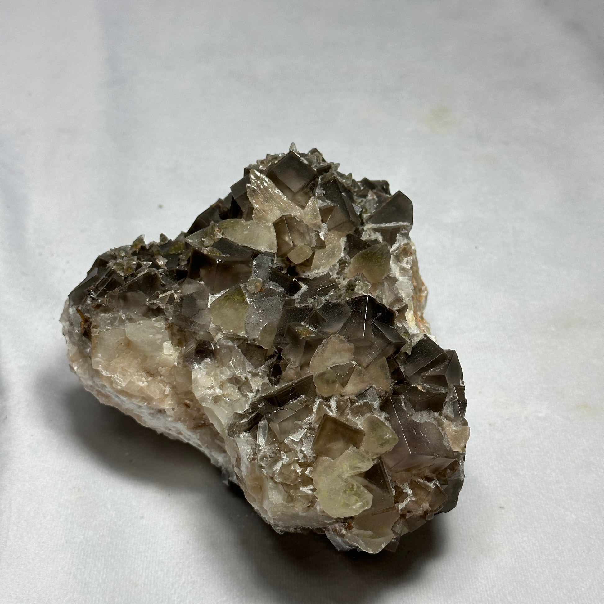 This Fluorite specimen is remarkable! It has many gray cubed layers as well as small Dogtooth Calcite around it!
