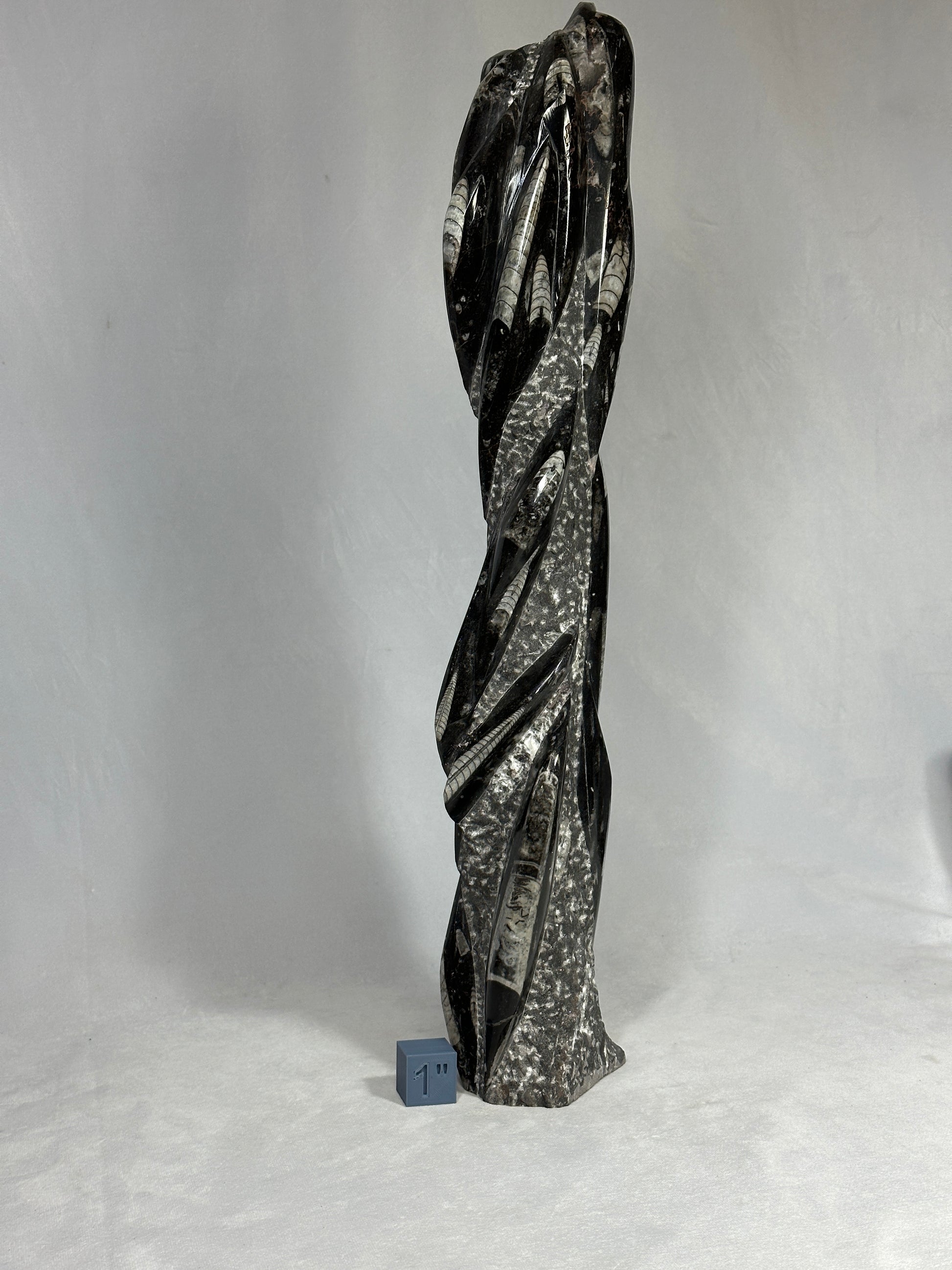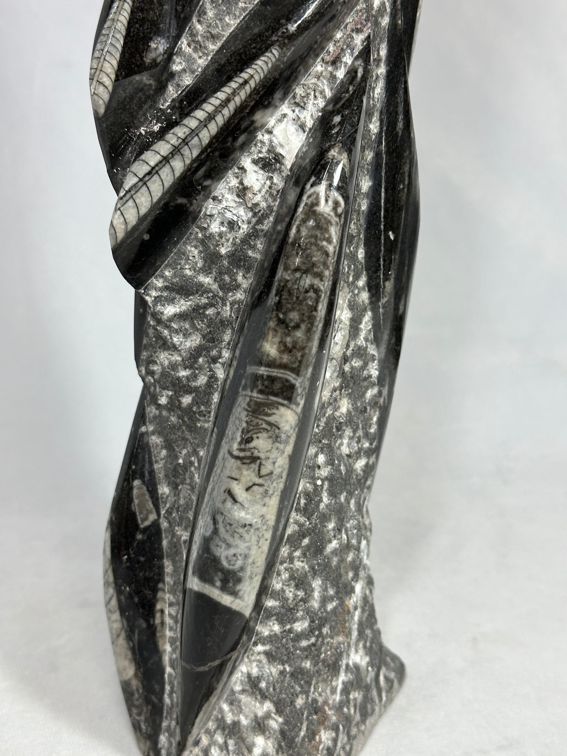 Orthoceras is an extinct nautiloid cephalopod. This tower has many distinguished Orthoceras segments that twist in every which way. Each with their own unique details. The base on this tower is perfect to help display this beauty!