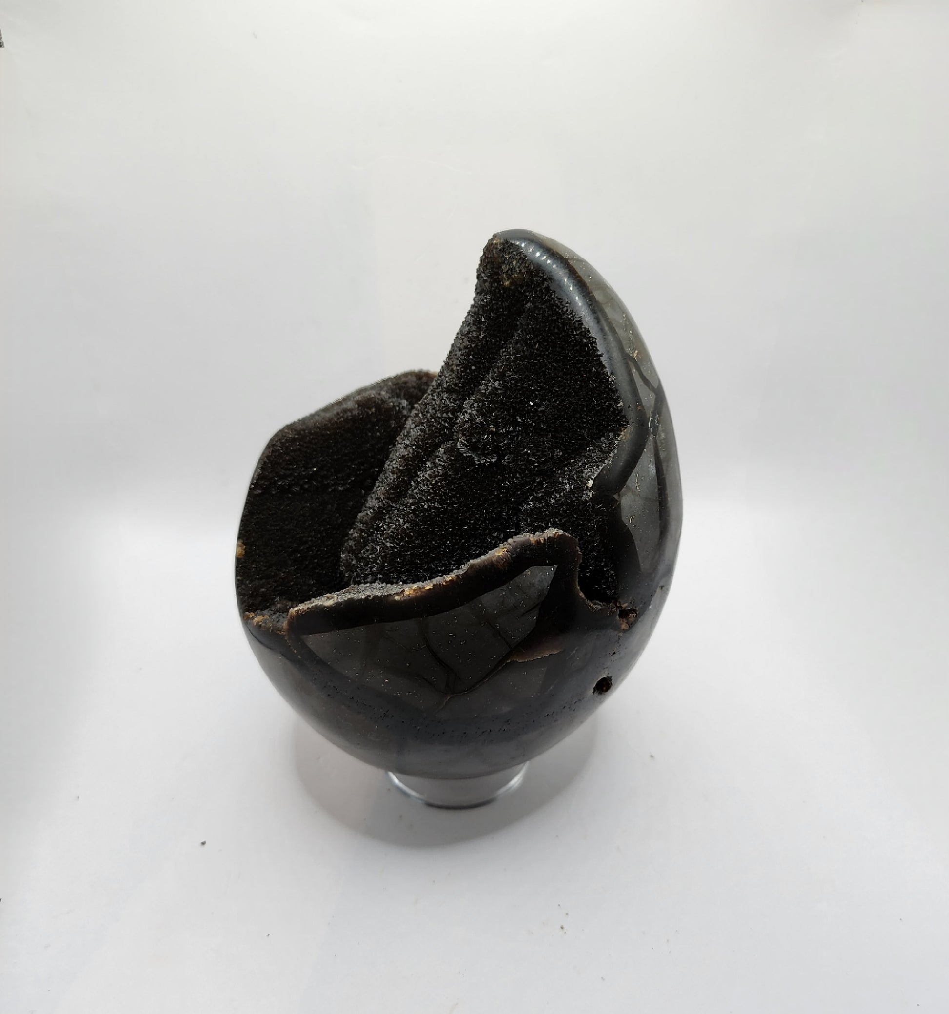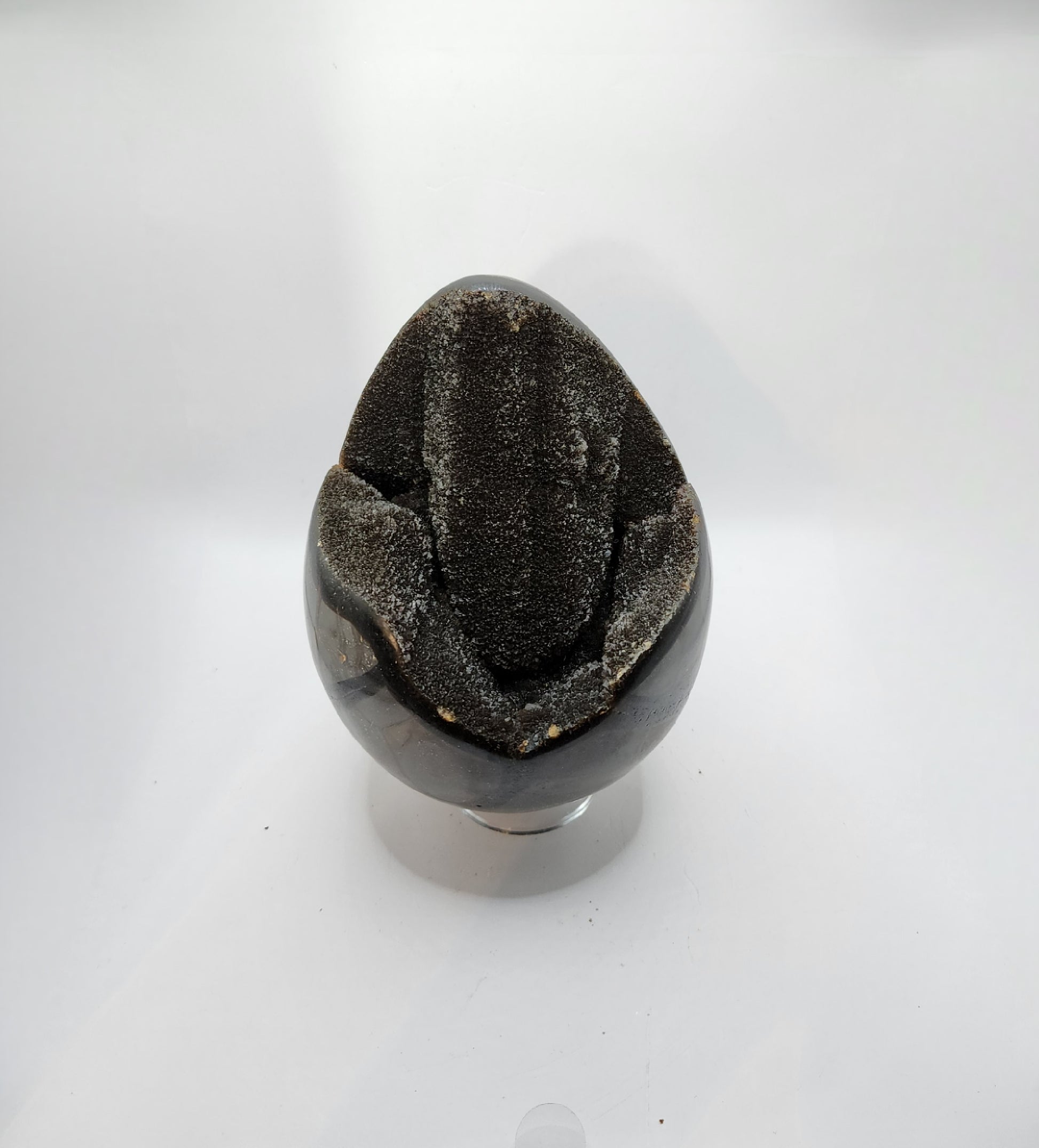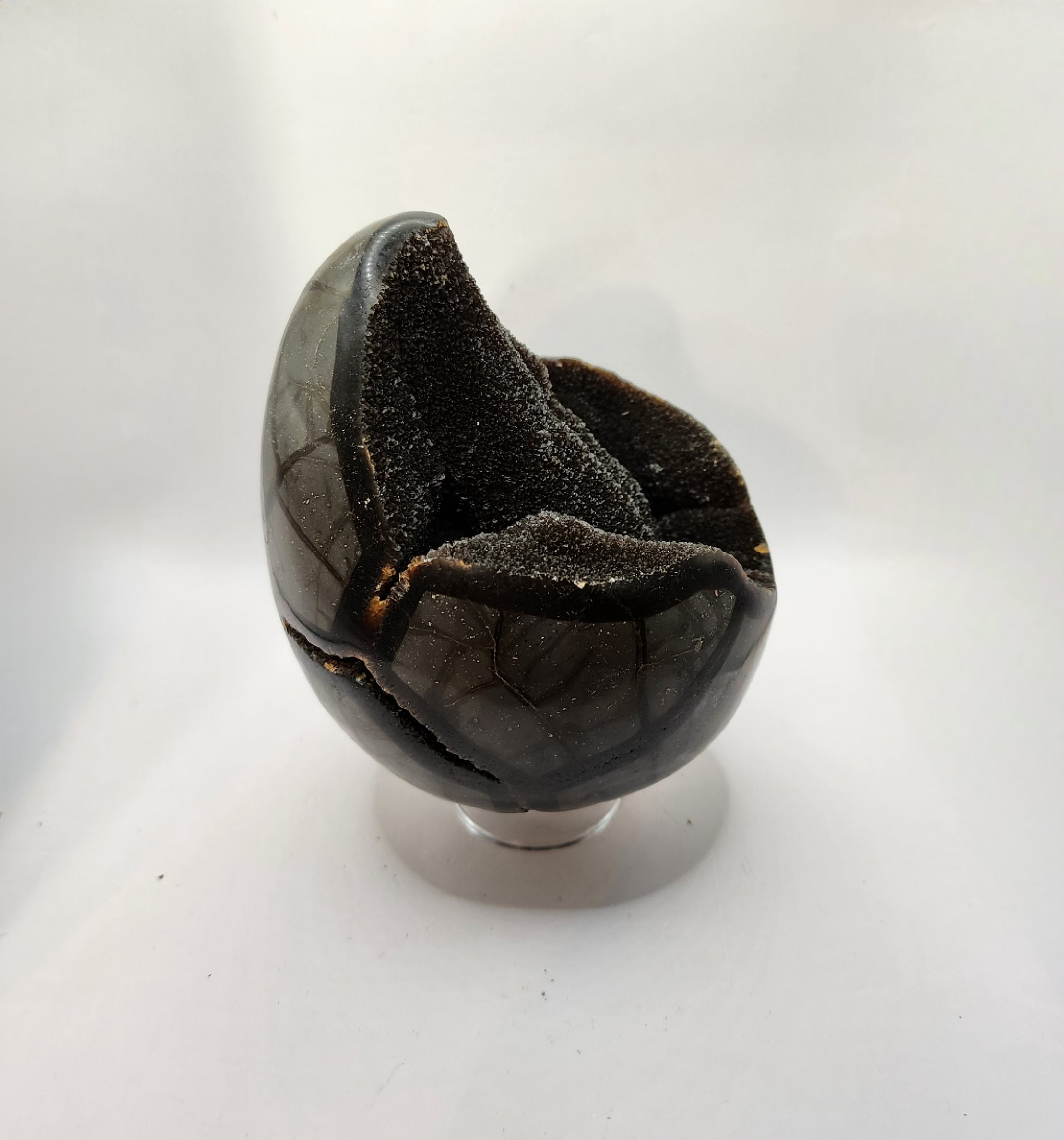 The coloring and pattern on this Septarian Egg with the black druzy crystals on this specimen are fantastic. Septarian Eggs are Septarian nodules that have been carved and polished into an egg shape. This piece will come with an acrylic circle stand so that you can display it on your favorite shelf.