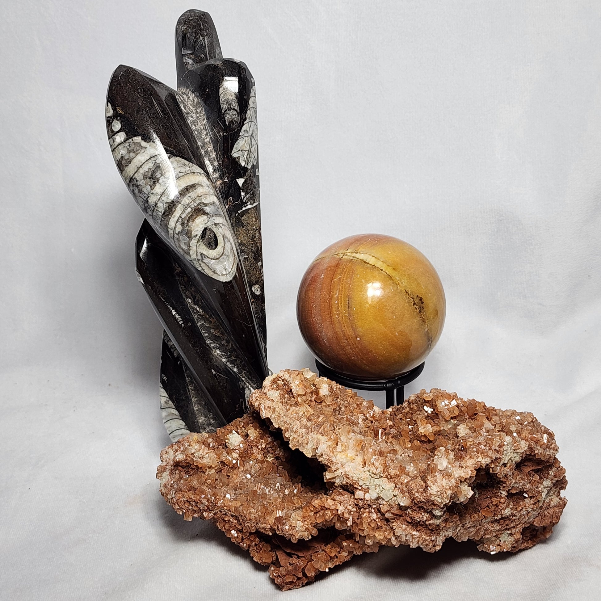 This aragonite cluster has a couple layers of beautiful red and white hexagon crystals! Pair with our Orthoceras Tower and Calcite Sphere for a stunning display!