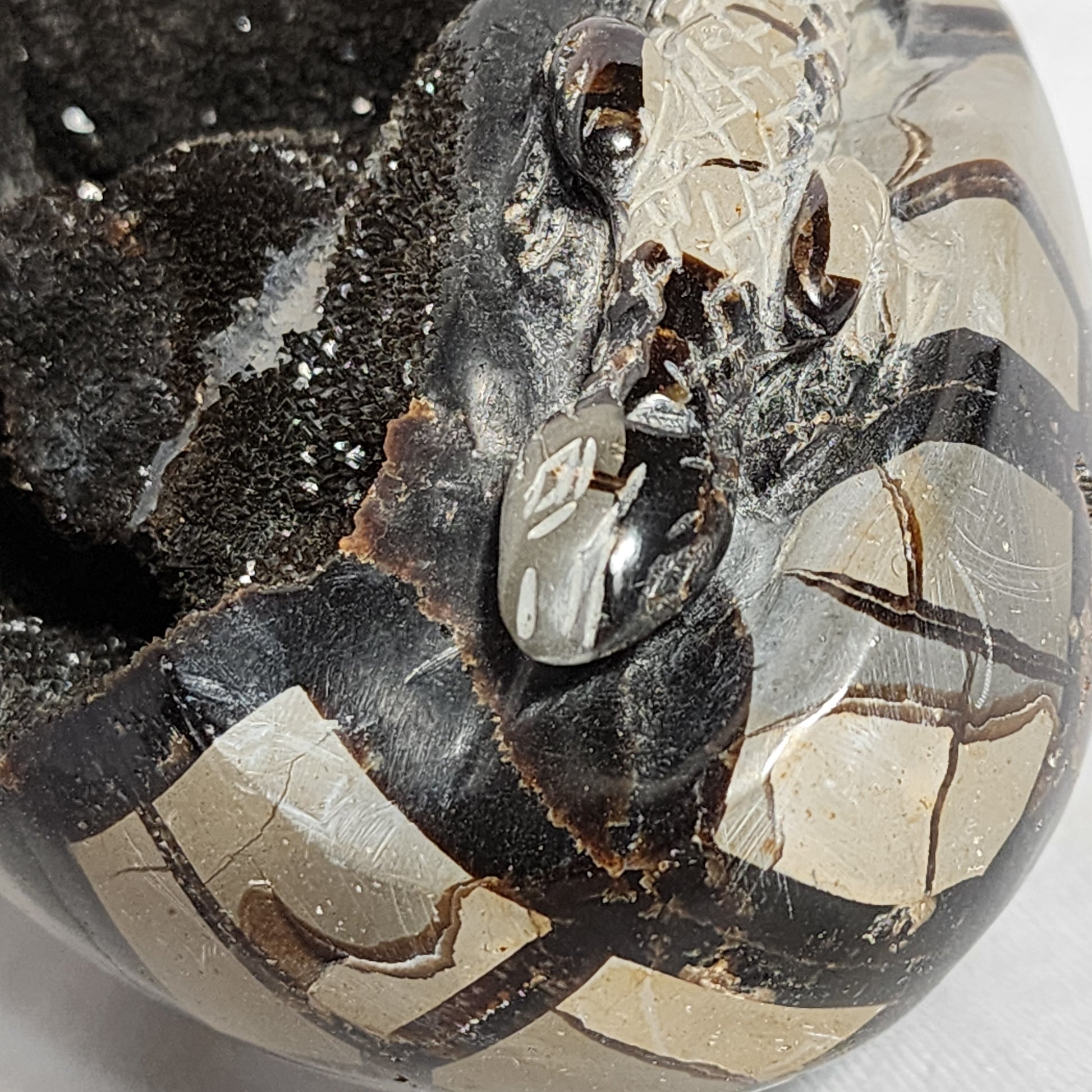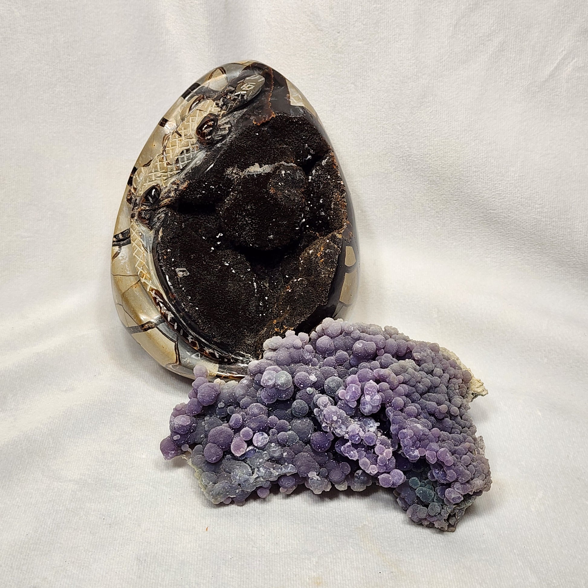 This particular specimen has an amazing lizard carved along the edge of the egg and beautiful druzy black and white crystals inside. Although this egg looks great on a shelf displayed by itself, it also pairs nicely with our Grape Agate!