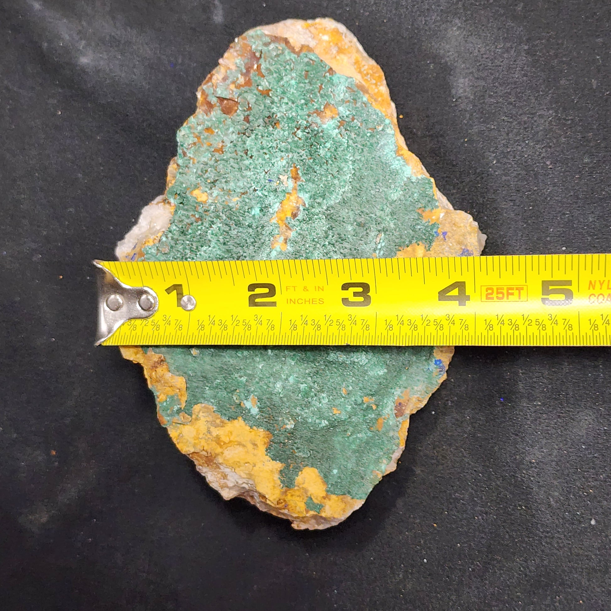 This specimen from Morocco is covered in Malachite crystals with a few Azurite crystals peaking around the matrix. Both of these minerals are derived from copper and have a druzy look to them.