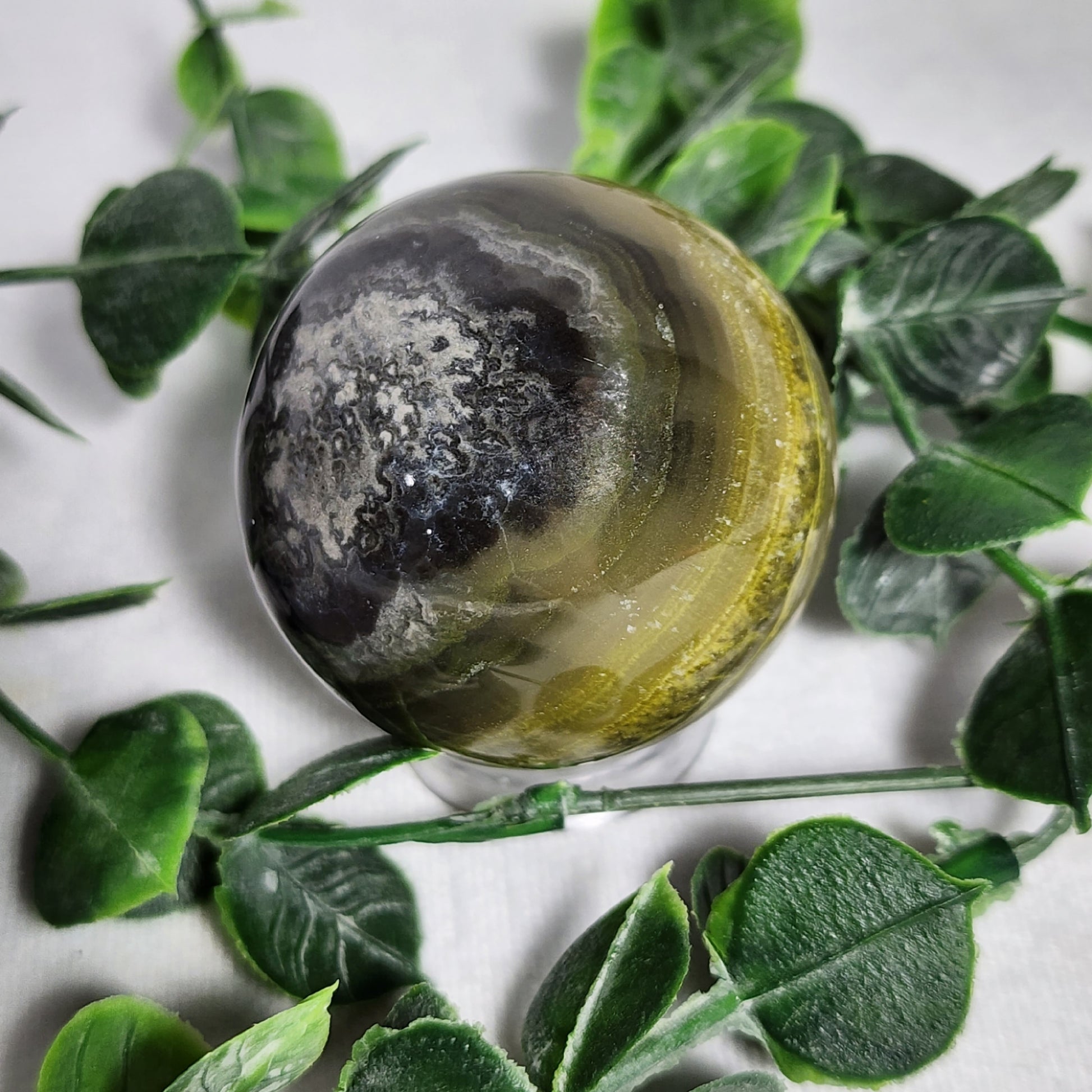 Bumblebee Jasper has mineral bands of sulfur (yellow), calcium and aragonite (white), realgar (orange) and iron pyrite (black).