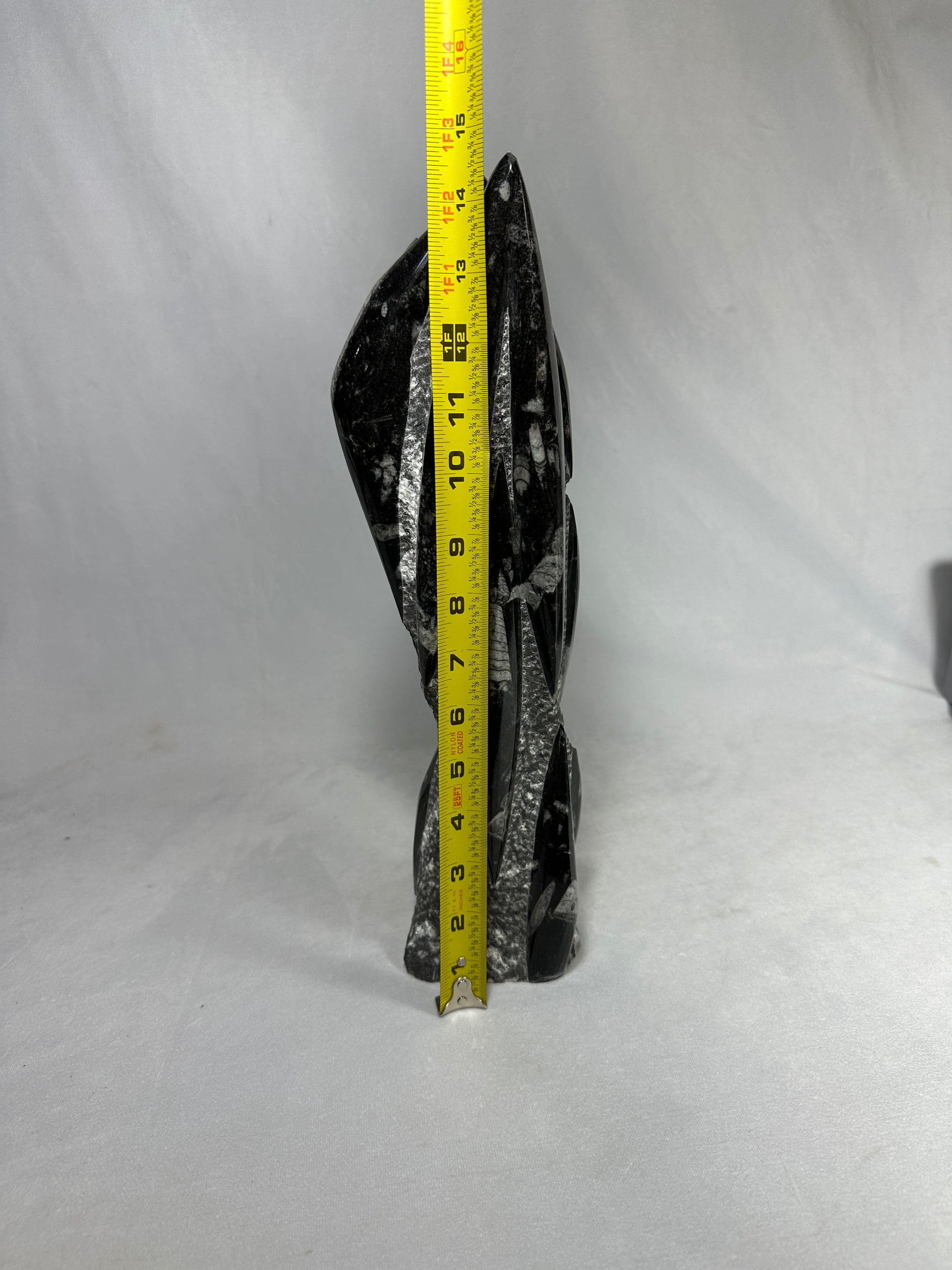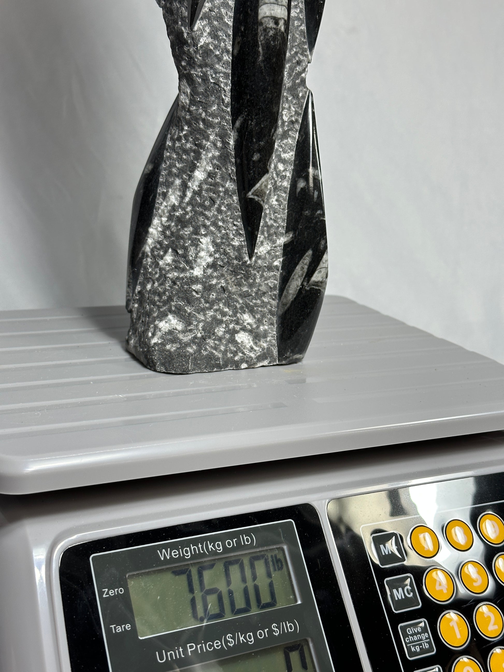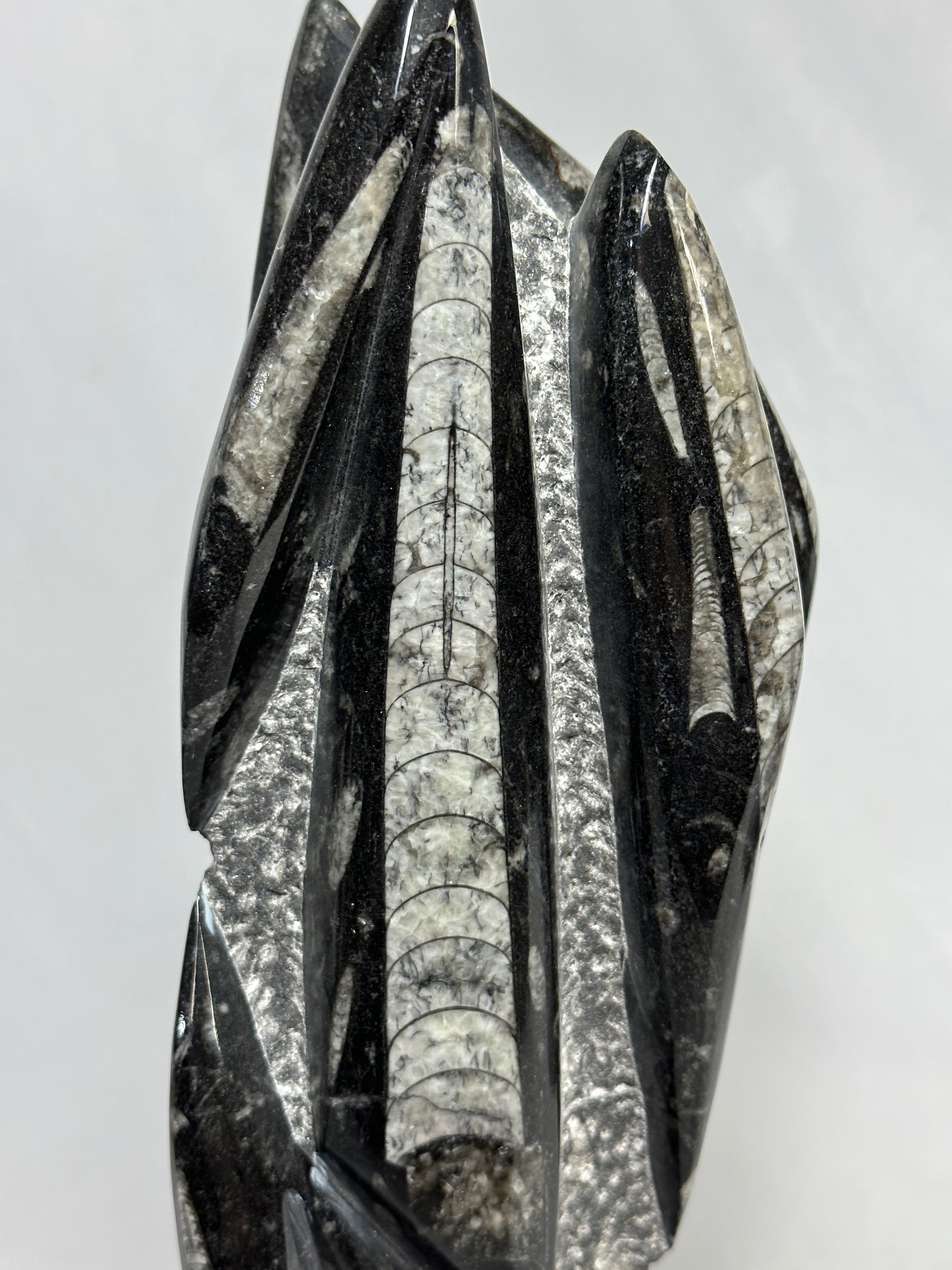 Orthoceras is an extinct nautiloid cephalopod. This tower has many stunning Orthoceras segments that twist all the way giving it an eye catching shape. Each segment has their own unique detail. The base on this tower is perfect to help display this beauty!