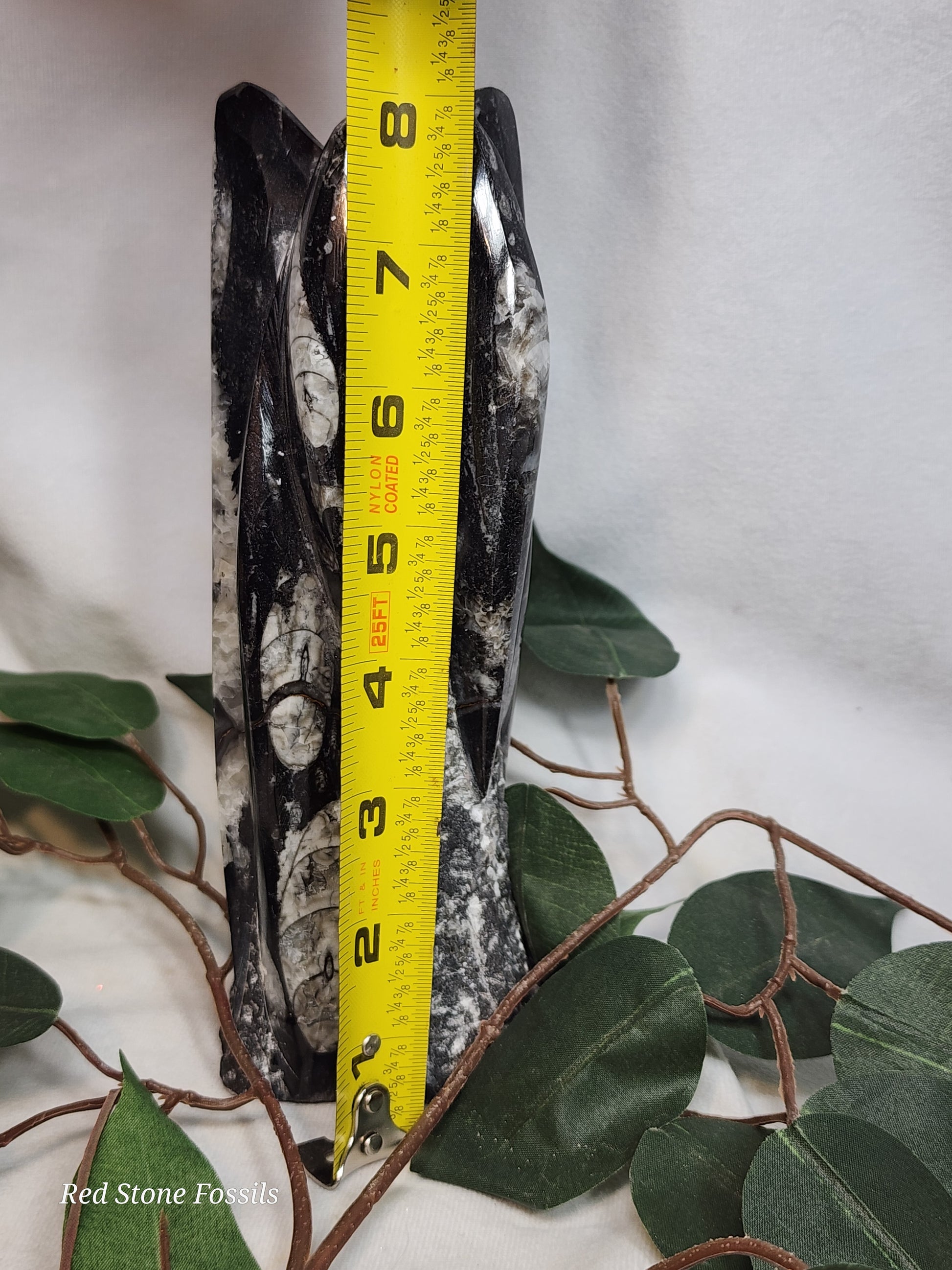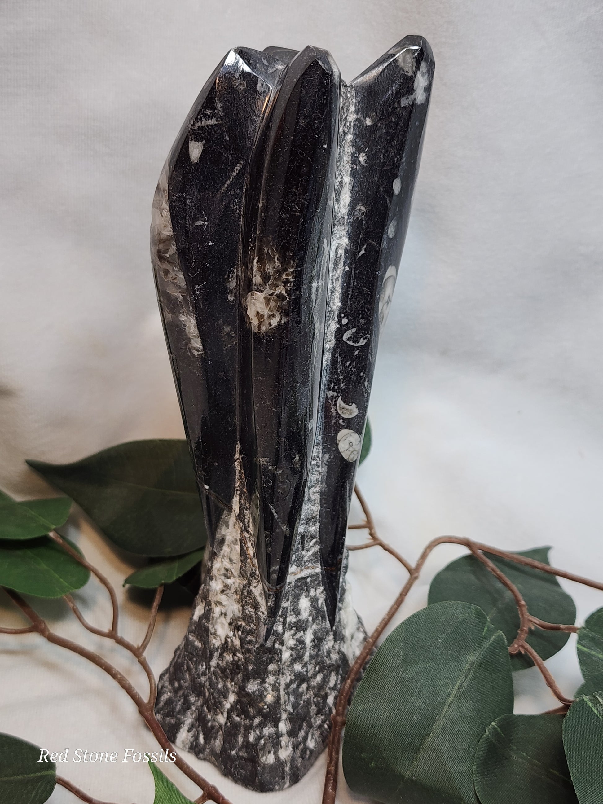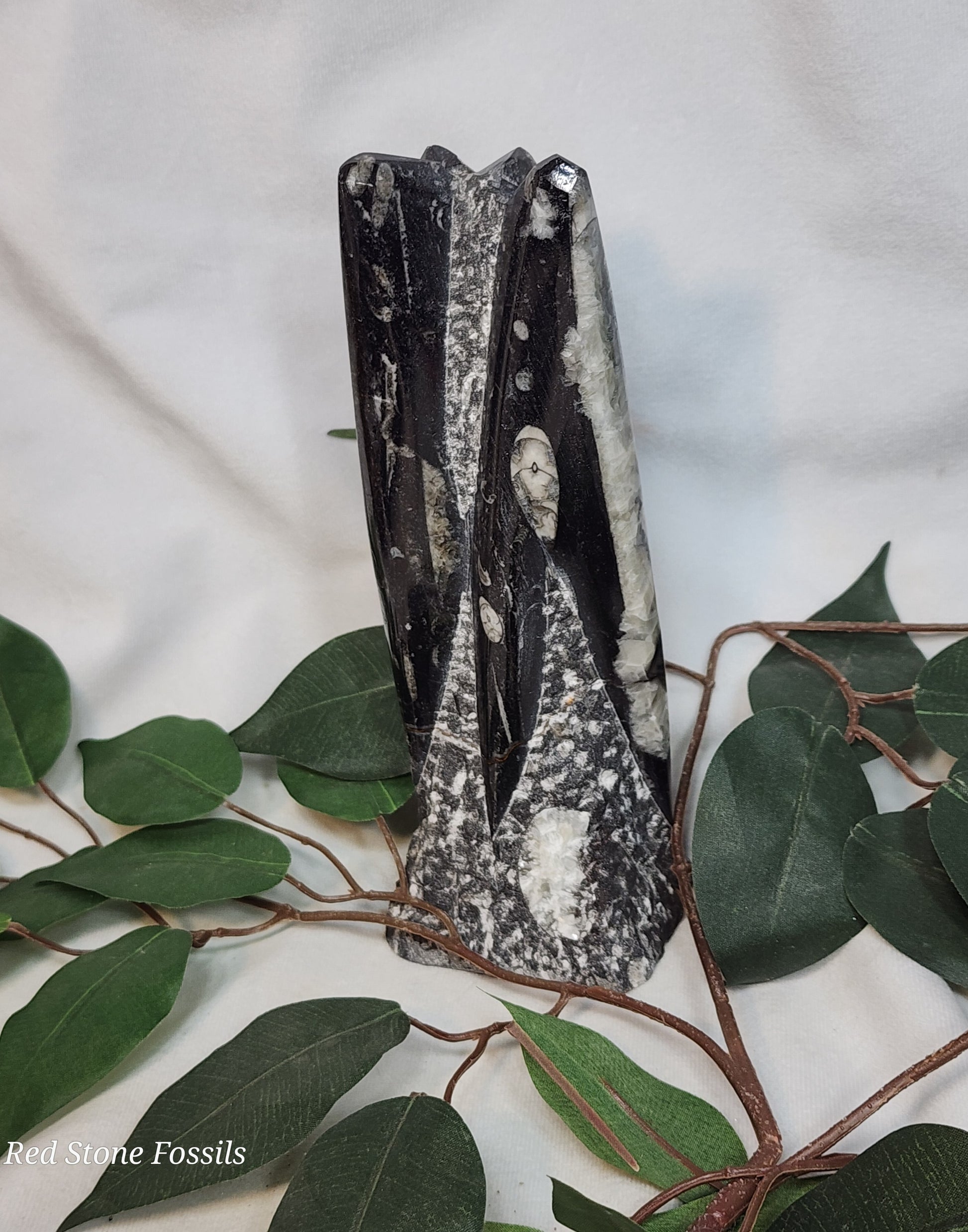 Orthoceras is an extinct nautiloid cephalopod. They can be recognized by their long, straight, white shells. Every Orthoceras tower is unique in how the Orthoceras fossils stack upon each other. This particular tower has several Orthoceras fossilized shell segments, some show more detail than others, but each with it's own fascinating and one of a kind beauty!