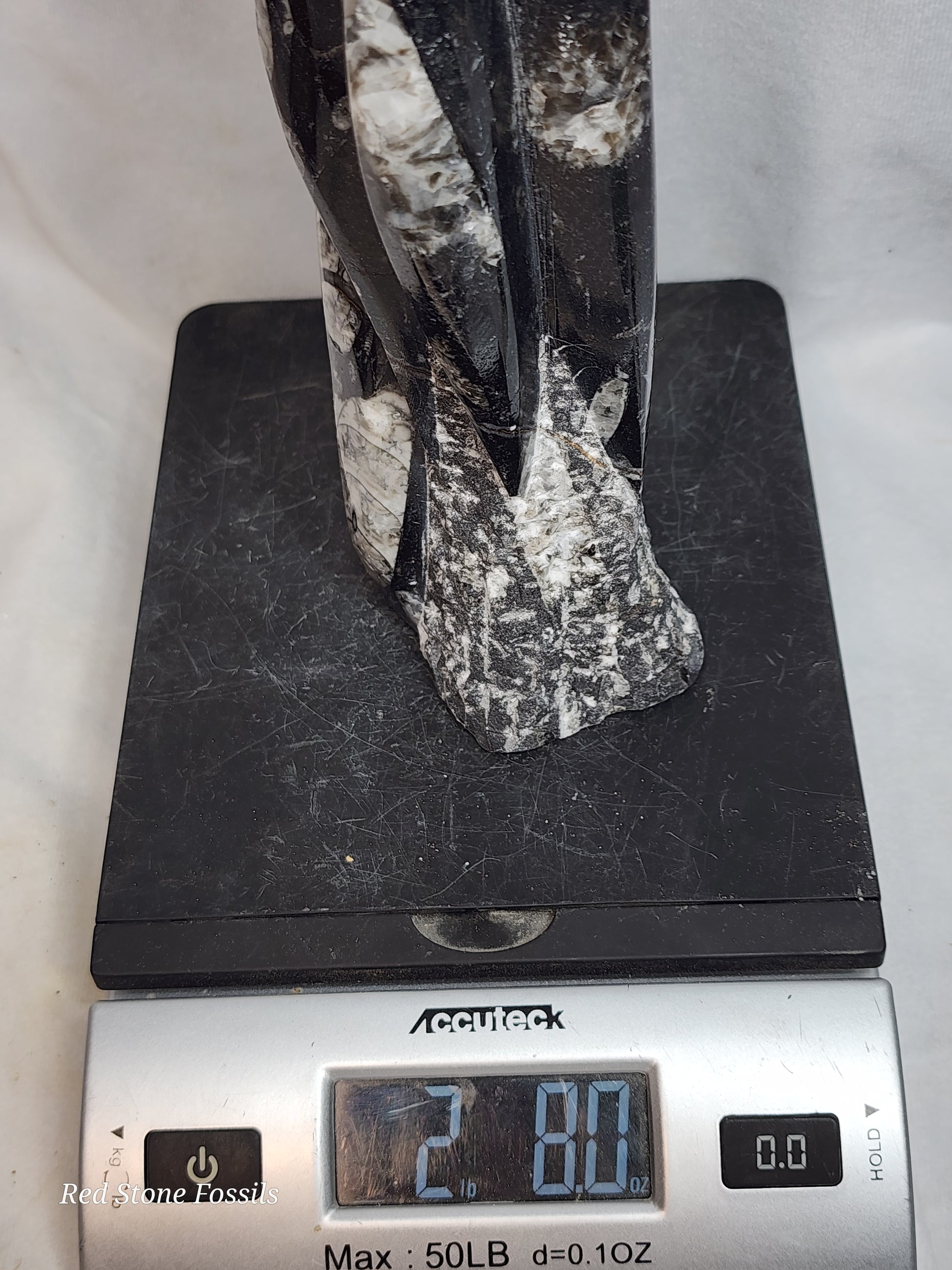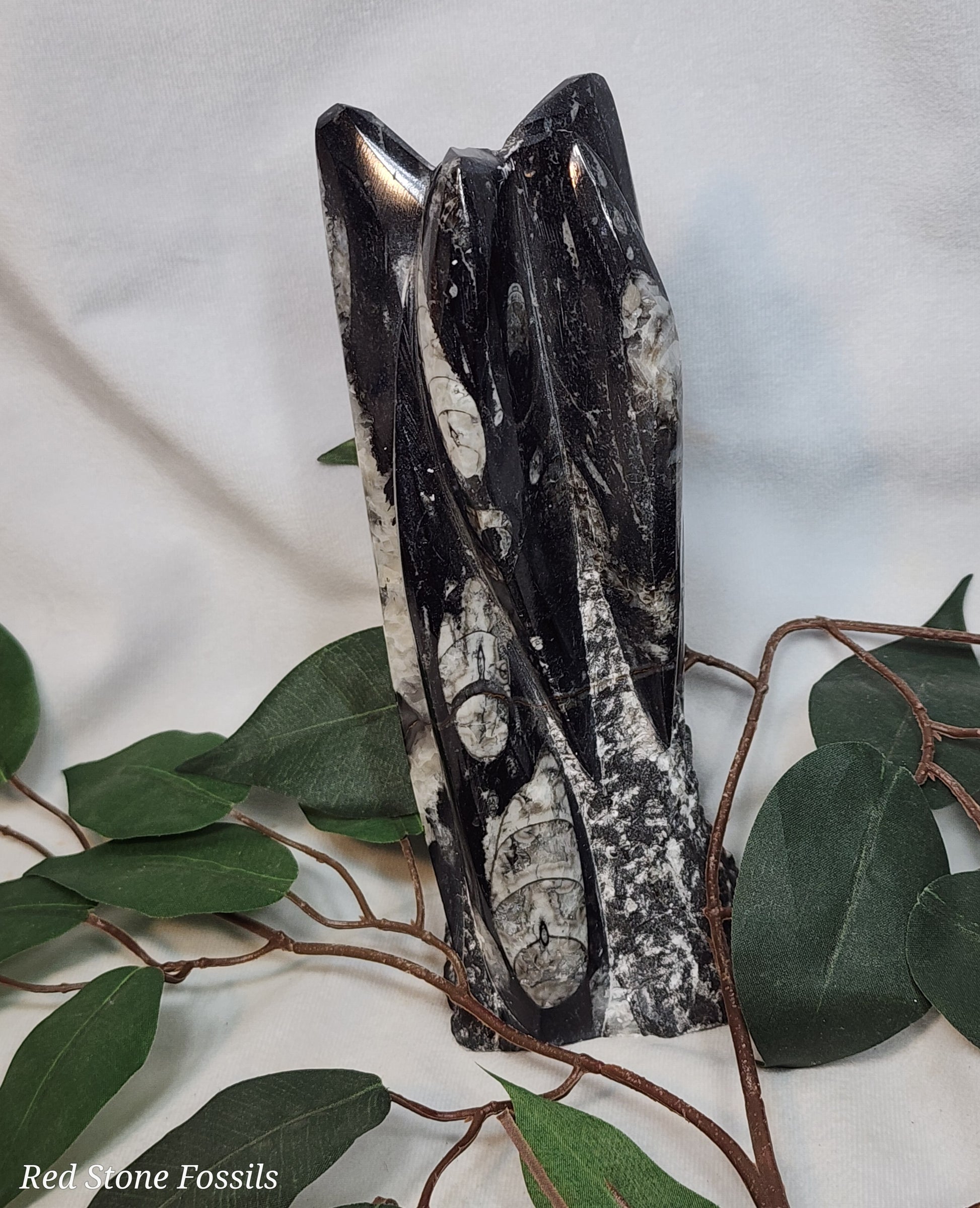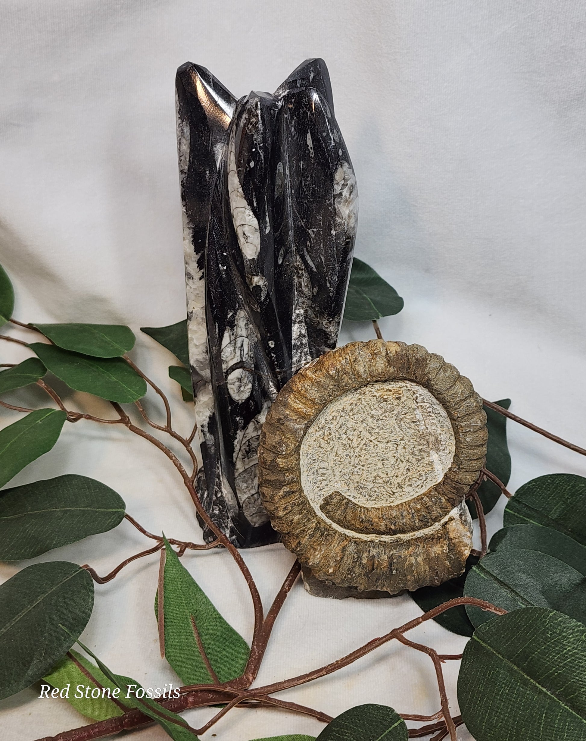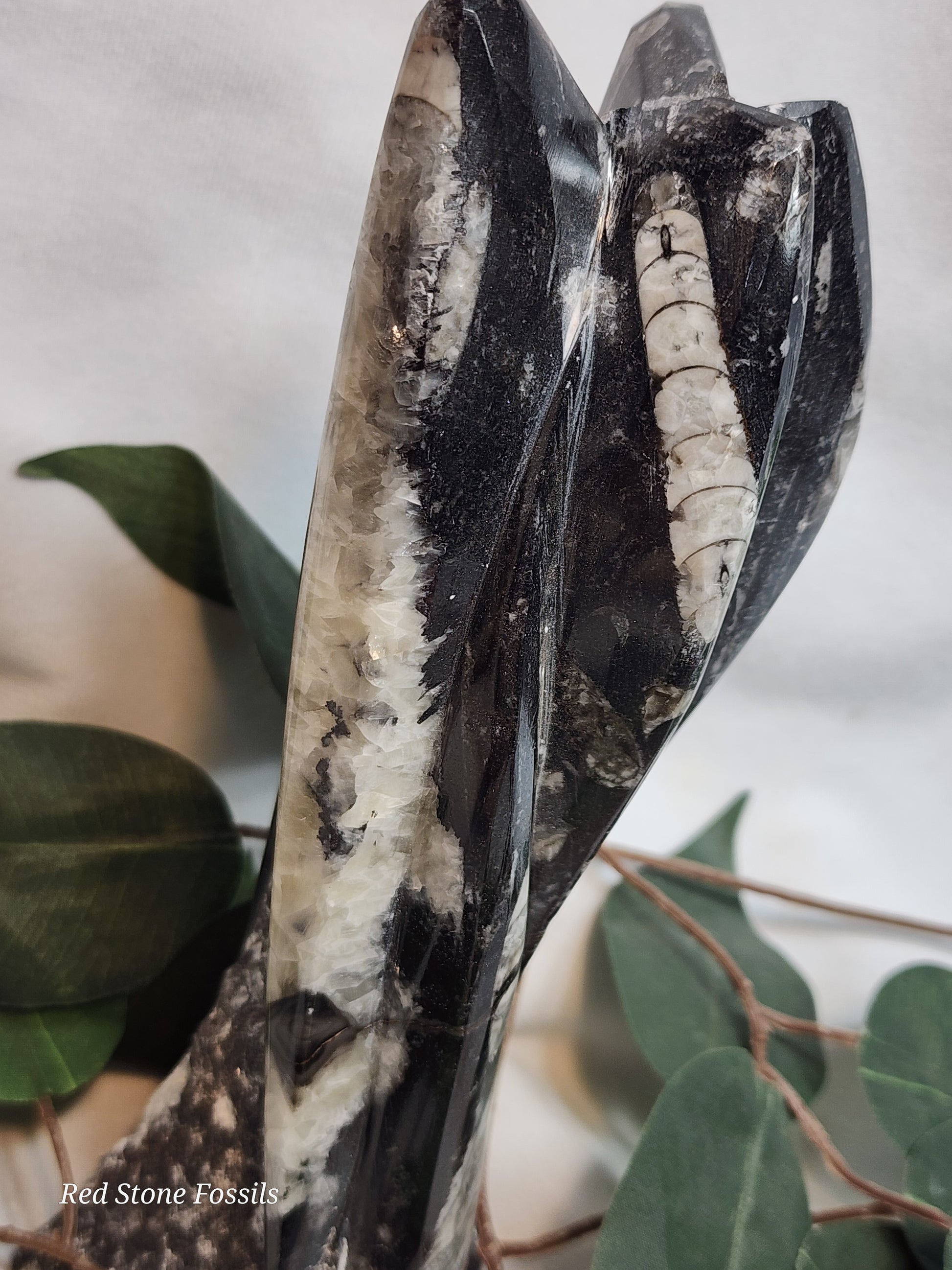 Orthoceras is an extinct nautiloid cephalopod. They can be recognized by their long, straight, white shells. Every Orthoceras tower is unique in how the Orthoceras fossils stack upon each other. This particular tower has several Orthoceras fossilized shell segments, some show more detail than others, but each with it's own fascinating and one of a kind beauty!